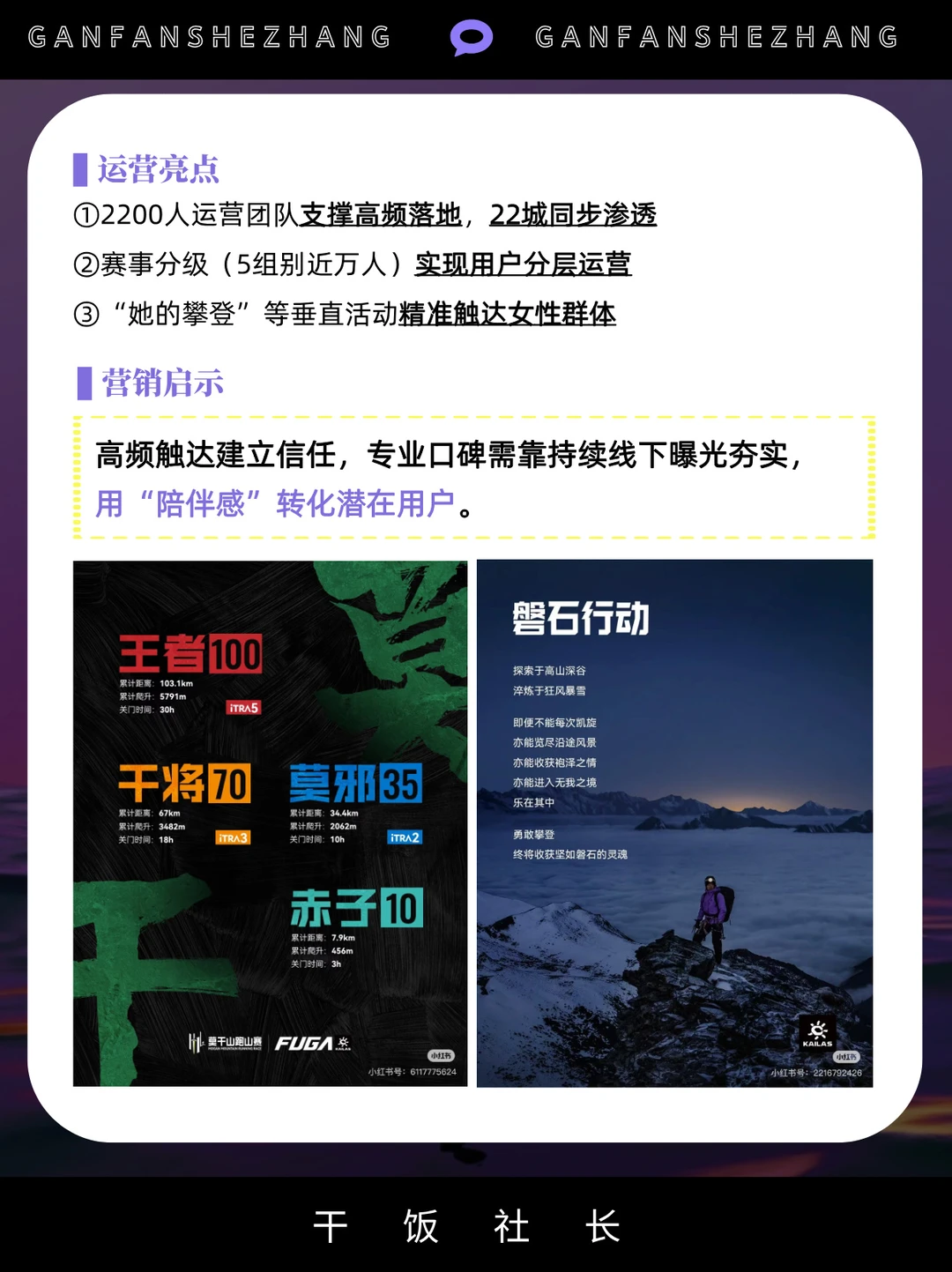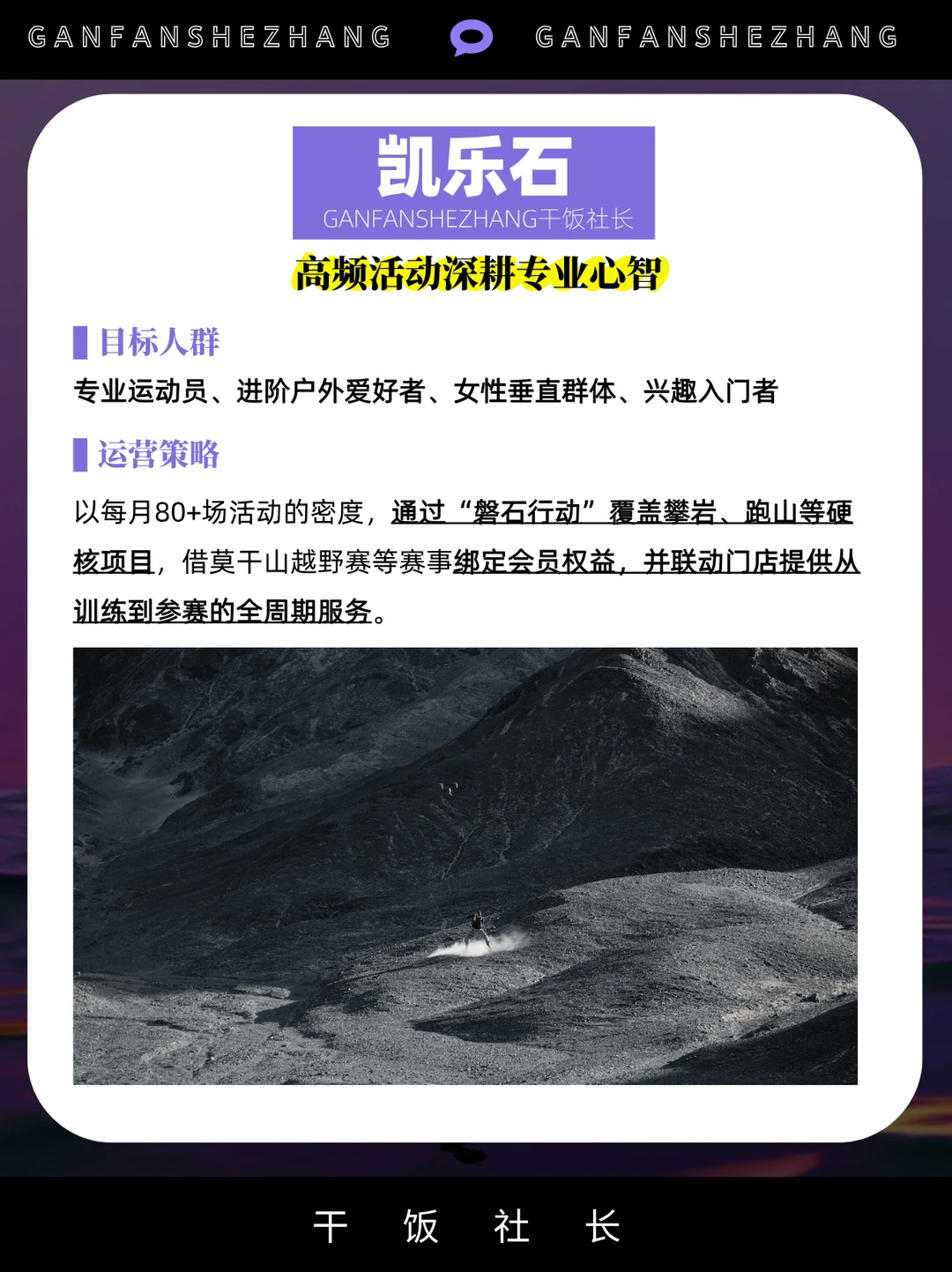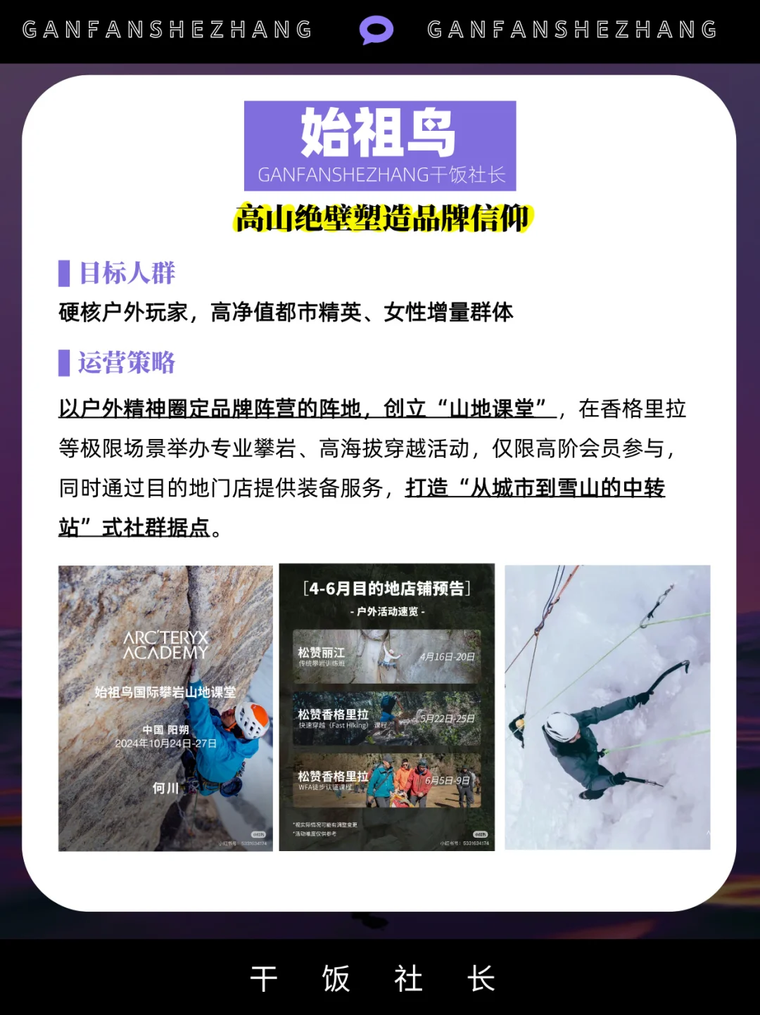 社群,是把对品牌感兴趣的用户聚集在一起 借社群的身份感认同,提升品牌的用户忠诚度 社群已是存量时代品牌维系用户的主要途径 甚至有些品牌把构建社群提升到战略高度 始祖鸟把“山地课堂”,开进了松赞的绝境酒店 凯乐石的“磐石行动”,一个月办了80多场活动…… 本文通过拆解5大户外品牌的社群策略与打法 看看当下的品牌究竟应该如何做社群? 品牌营销 干货分享 商业思维 社群 营销 户外 品牌
