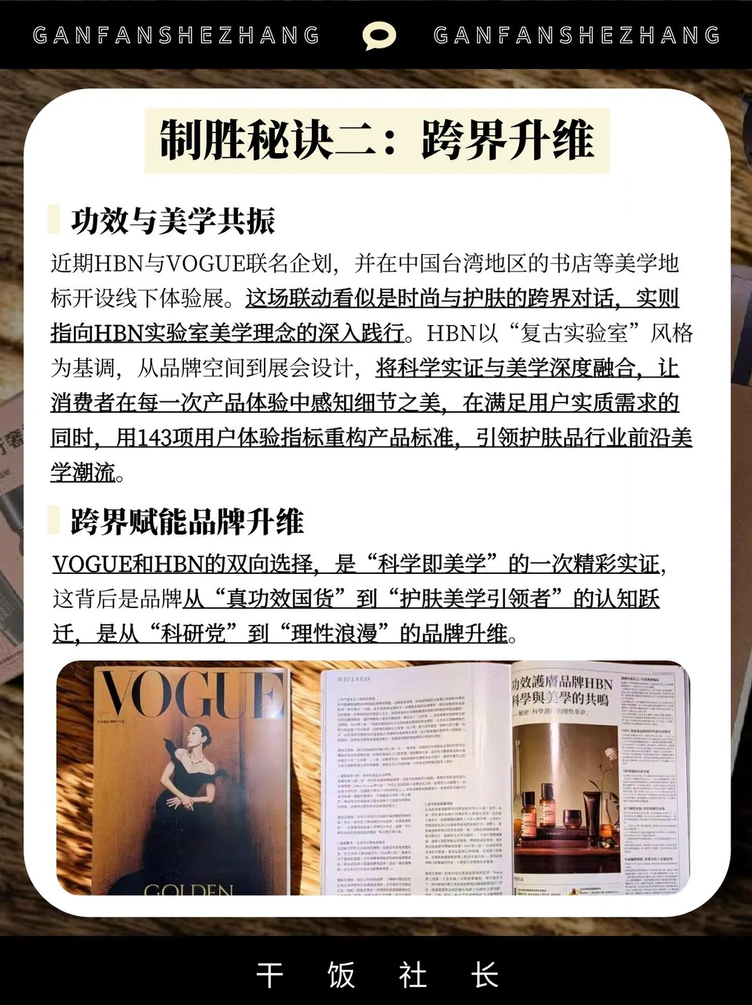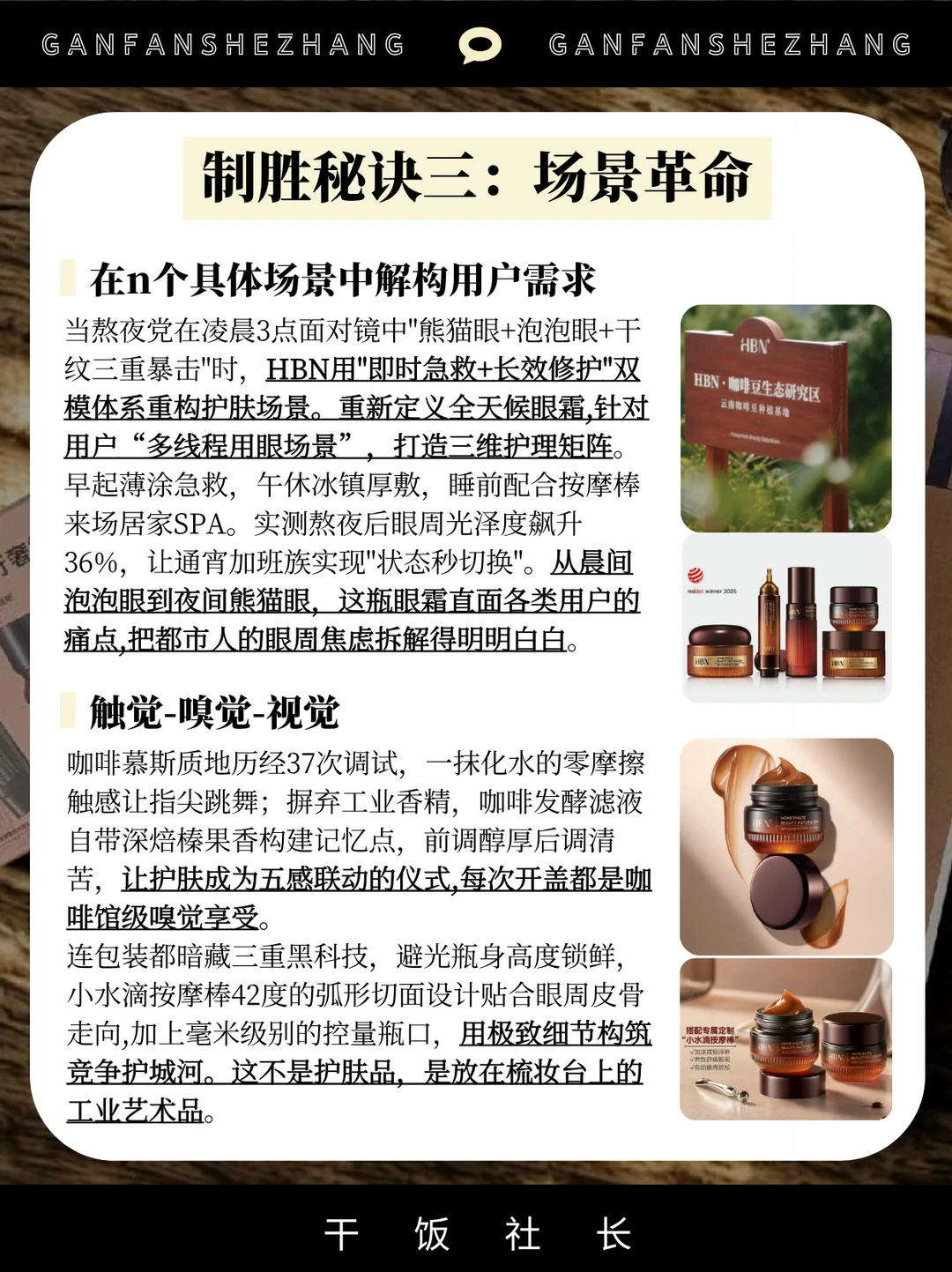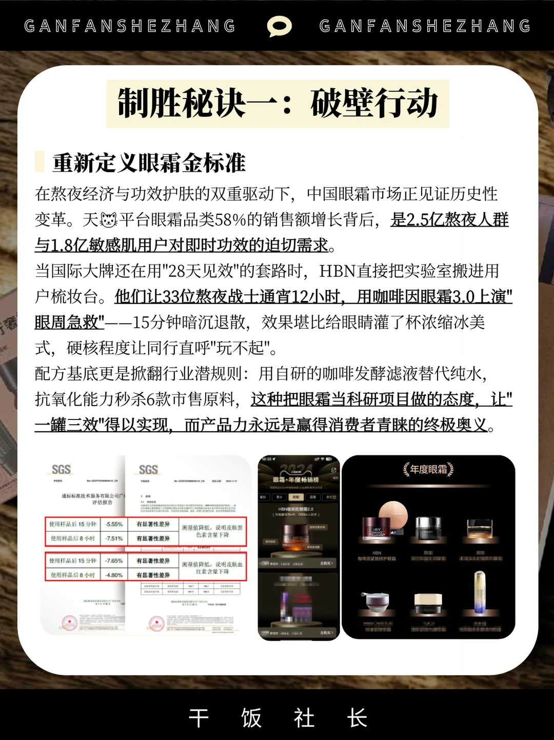 随着熬夜常态化、熬夜经济的兴起 以及消费者对“精准护肤”需求的升级 中国眼周护理市场正迎来爆发式增长 2024年天猫眼霜品类销售额同比增长58% 随之而来的是,消费者不再盲目追捧国际大牌 转而追求成分透明、功效可见的“真科技”产品 这一趋势为国货品牌提供了弯道超车的绝佳机会 其中值得关注的HBN咖啡因眼霜3.0 正是以“科学实证+护肤美学”实现突围破局 上市4年累计热销超百万件,连续霸榜眼霜热销🥇 近期还与国际时尚顶刊VOGUE深度合作 今天,我们就来拆解这款“眼部加浓冰美式”的制胜逻辑