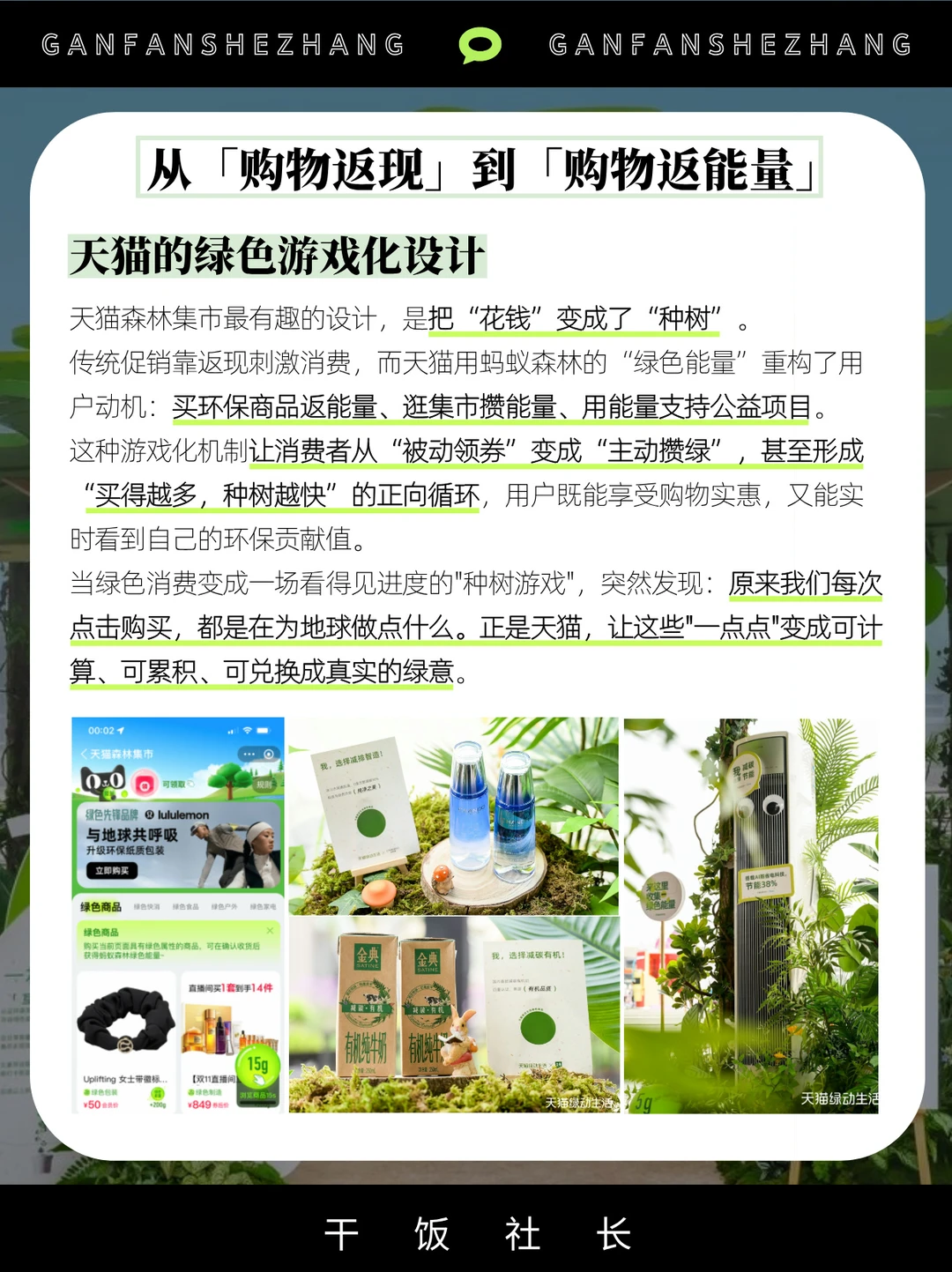 平台独家“天猫森林集市”品牌定制新玩法,以游戏化机制将ESG从企业战略转化为全民可感知的绿色消费行动。同时,在上海西岸梦中心,围绕“独木也成林”的创意主线,以一座巨型榕树装置成为活动焦点,吸引超20万上海市民参与,实现线上线下的全域破圈🎯。