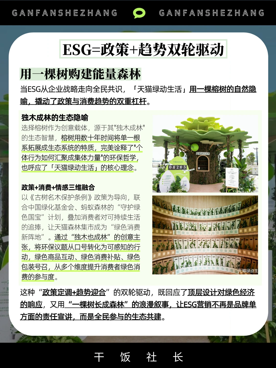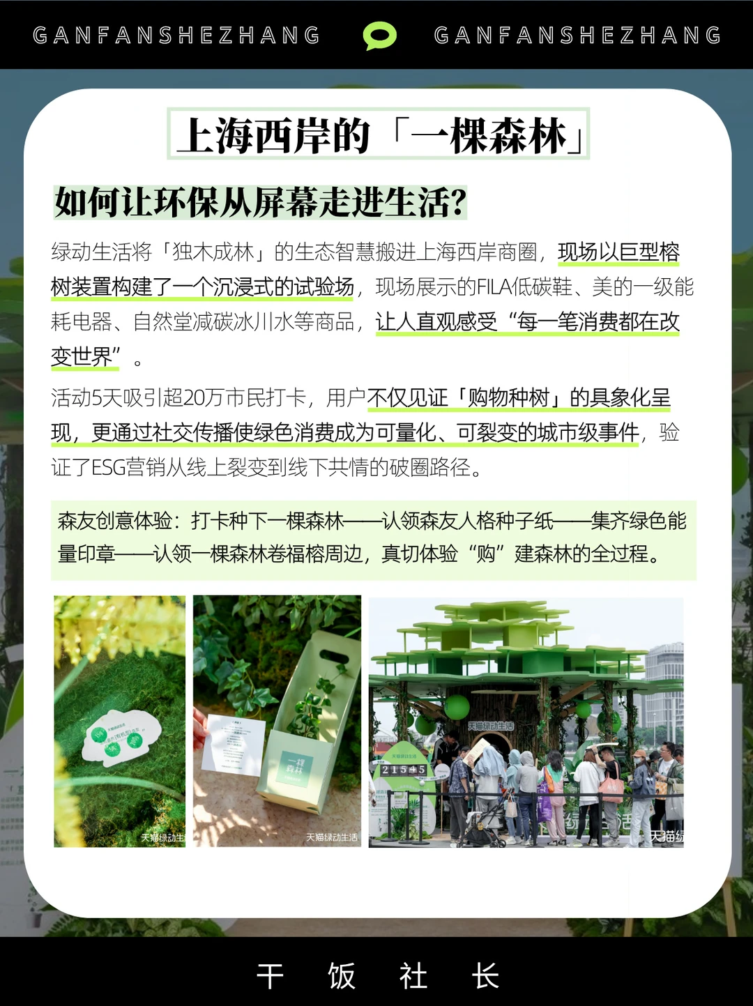 就像最近被上海朋友圈给刷屏的「一棵森林」🌟,正是天猫全新ESG专项IP“天猫绿动生活”打造的创意装置,5月24日天猫同步官宣联合中国绿化基金会、蚂蚁森林发起的“守护绿色国宝计划”,它要做的,就是把每个人的日常选择变成肉眼可见的改变。