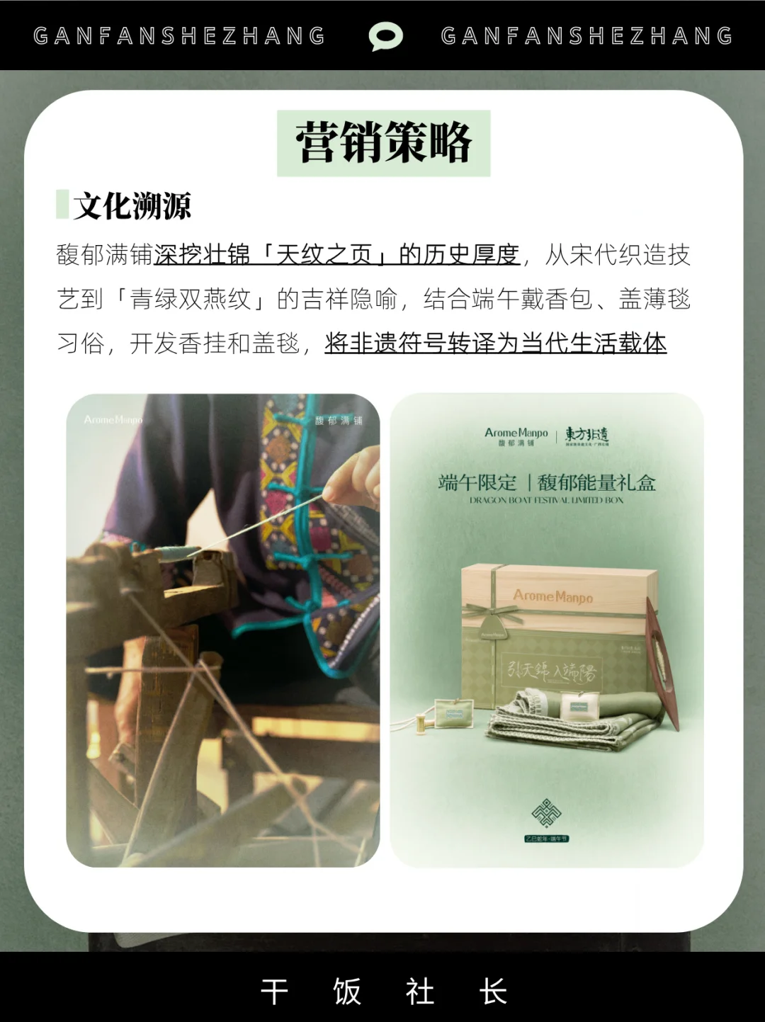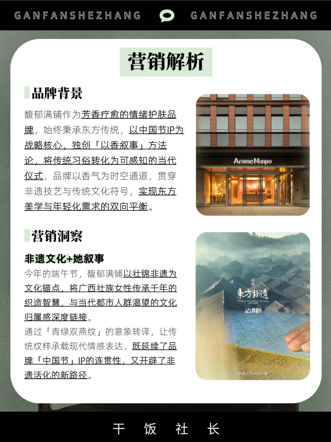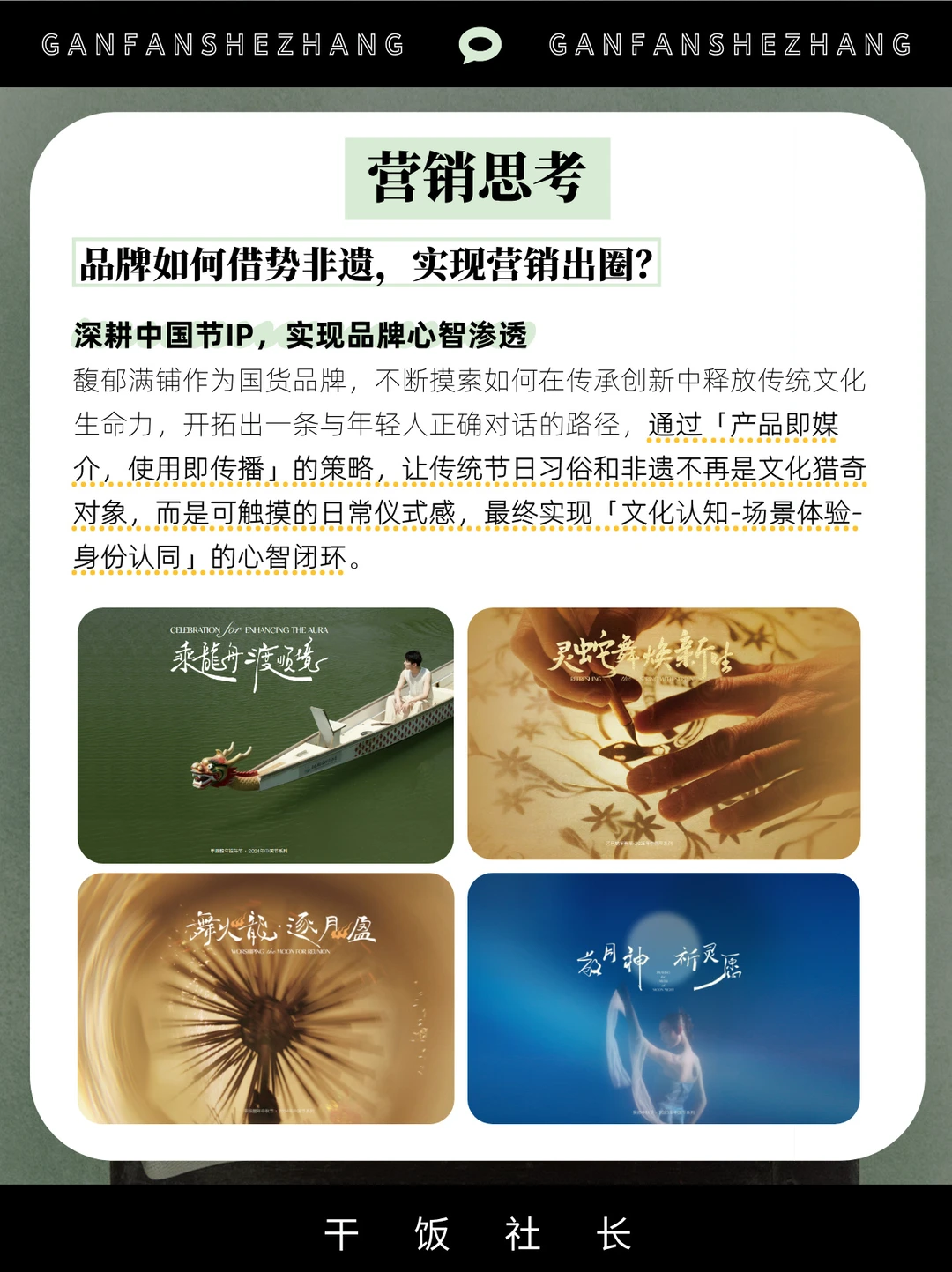 在众多非遗营销中,馥郁满铺以深耕中国节和东方非遗叙事脱颖而出,这次端午节的联名营销更让我们看到品牌对传统文化深度融合的底层逻辑👉