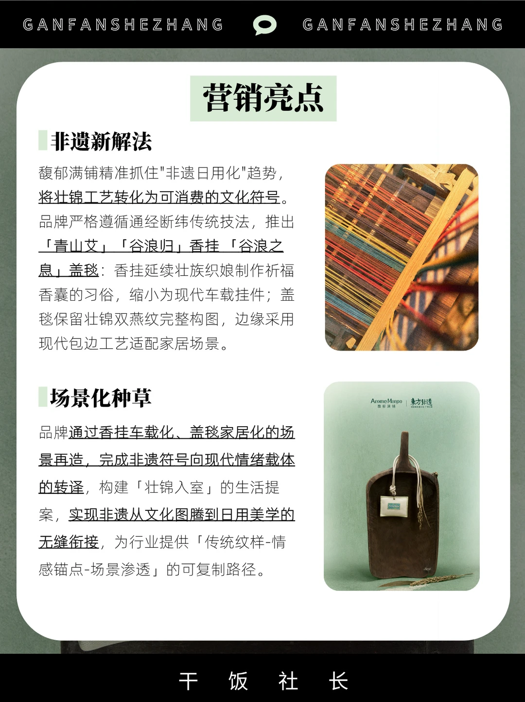 此次联名广西壮锦以「青绿双燕纹」为符号,推出端午限定「馥郁能量」礼盒,将端午香挂、盖毯化为非遗日用化的载体,将壮锦织娘代代相传的生命历程织入历史经纬,让女性智慧在当代生活场景中完成文化转译