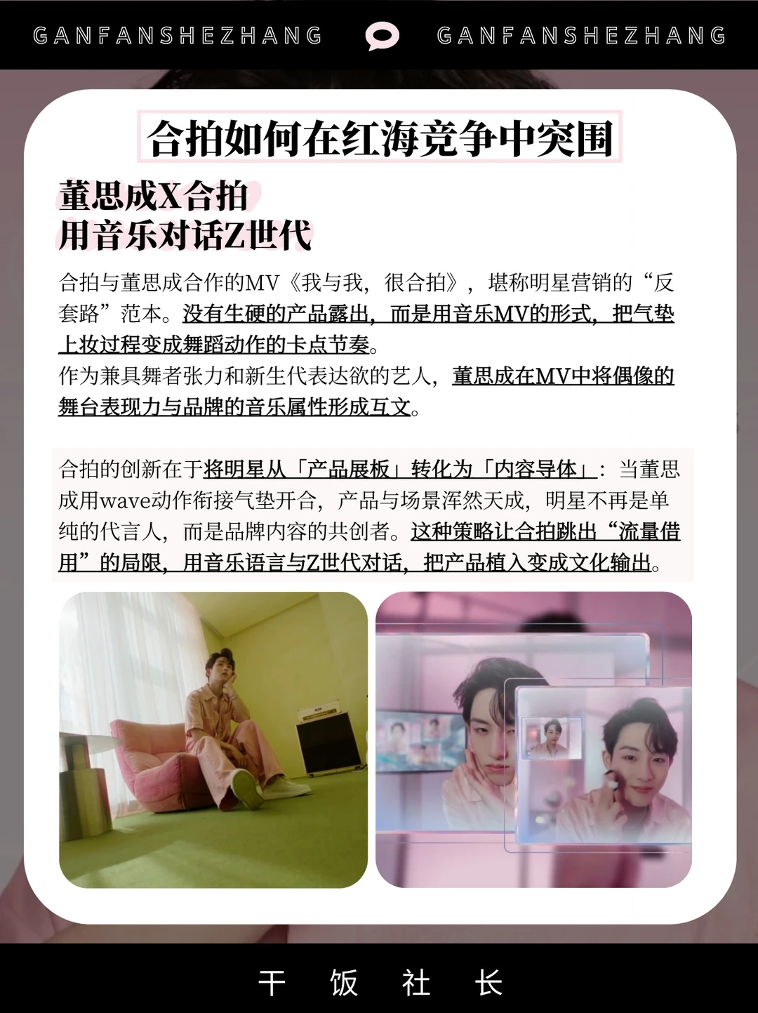 近期董思成与合拍共创的MV《我与我,很合拍》,跳脱传统彩妆的营销框架,以舞蹈卡点演绎气垫上妆,极具渲染力和记忆点的同时,也让我看到🧐彩妆行业未来的营销趋势。