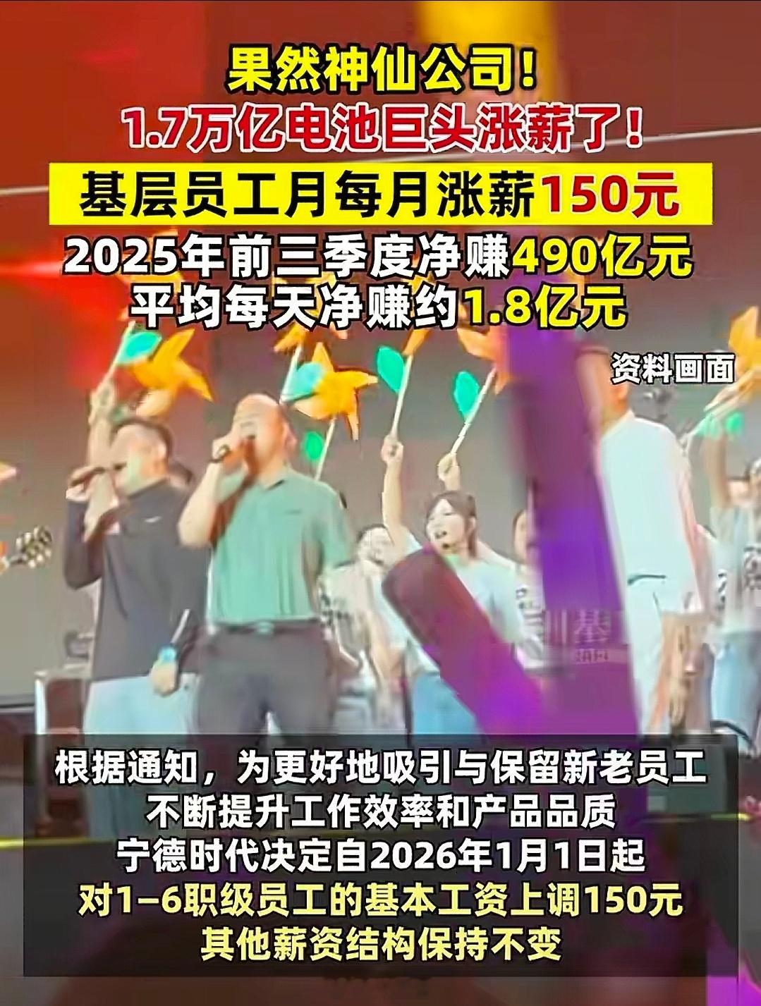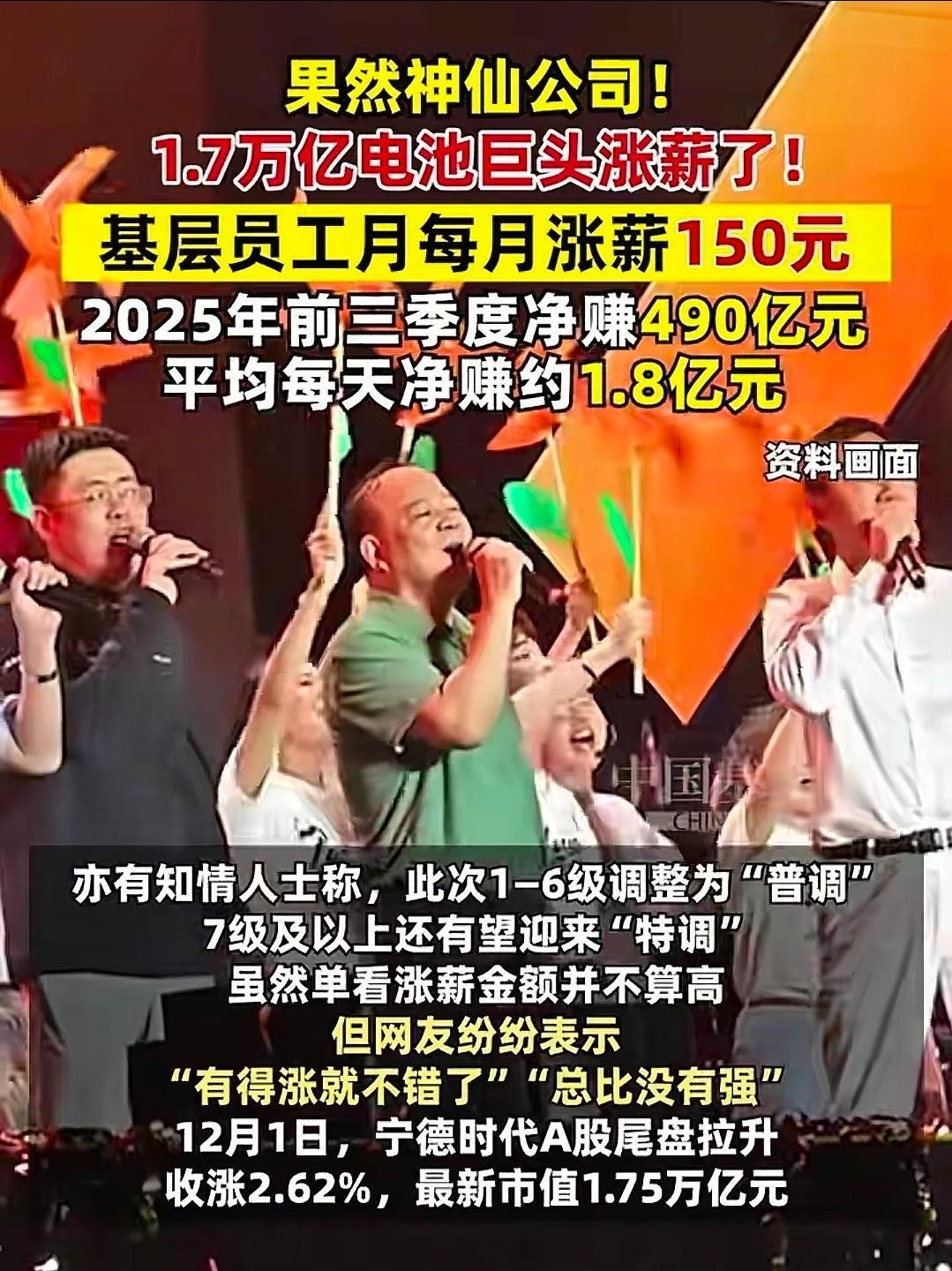 宁德时代发布涨薪通知2026年1月1日起,宁德时代对1-6级基层员工普涨基本工资150元/月,覆盖超9万一线员工,涨薪后产线员工月均到手约7500元,加班费还会同步增加!要知道这背后是硬核业绩支撑:2025年前三季度营收2831亿,净利490亿同比暴涨36%,日赚超1.7亿,全球动力电池市占率稳坐42.75%的榜首。而且公司2024年人均薪酬已达23.63万,职级晋升还能再涨500-1000元/级,福利也配齐了五险一金、750元房补、免费宿舍和节假补贴 。但争议也瞬间拉满:有人说“当下能涨就不错,总比裁员降薪强”,毕竟这是10万级别人群的普惠福利,每月多支出几千万诚意十足;也有人吐槽“净利增36%只涨150元,连通胀都跑不赢”,质疑人均23.6万的薪酬数据掩盖了基层与管理层的差距。其实行业竞争早白热化,比亚迪、中创新航等都在加码基层薪酬,宁德这次涨薪既是稳定军心,也是行业人才争夺战的一步棋 。更有消息说7级以上还可能有“特调”,后续值得关注~一边是企业盈利新高,一边是基层小幅涨薪,你觉得这次涨薪够诚意吗?是“蚊子再小也是肉”还是“象征性安慰”?评论区聊聊你的看法!