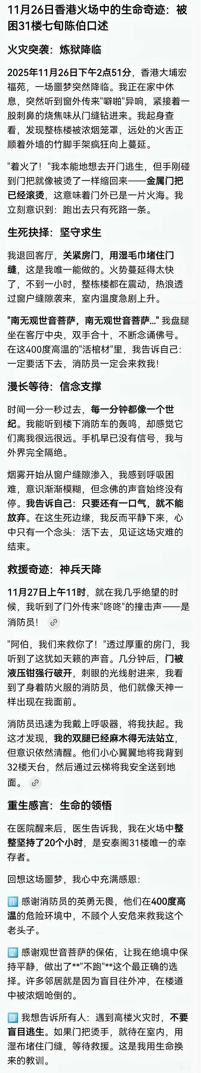 香港:31楼火海被困20小时,七旬老人奇迹生还!信念创造生命奇迹 近日,香港一高层住宅突发大火,黑烟迅速吞噬整栋大楼。最令人揪心的是,31楼一位七旬陈姓老人被困家中,音讯全无。 消防员赶到现场时,火势已蔓延多个楼层,高温浓烟让救援异常艰难。时间一分一秒过去,搜救队员的心逐渐下沉——在这样的火场中,生存机会随着时间的流逝而急剧减少。 然而20小时后,当救援人员终于打通31楼通道时,竟发现陈伯仍有生命体征! “当时浓烟弥漫,能见度几乎为零。”参与救援的消防队长回忆,“我们听到微弱的诵念声,顺着声音找去,才发现老人蜷缩在相对安全的卫生间角落。” 事后陈伯讲述,在绝望之际,他不断默念“南无观世音菩萨”,这个简单的动作让他保持了惊人的镇定。他用湿毛巾捂住口鼻,避开浓烟最密集的区域,就这样坚持了整整20小时。 医学专家表示,在如此恶劣环境下存活20小时极为罕见,除了必要的自救措施,保持镇定、减少氧气消耗的心理状态至关重要。陈伯的案例证明了在绝境中,人类精神力量的巨大潜能。 目前陈伯已脱离生命危险,身体正在康复中。问及最想说什么,老人声音微弱却清晰:“感谢菩萨保佑,更感谢那些冒死救我的孩子们。”