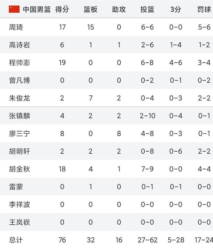 中国男篮:三分28投5中 韩国男篮:三分23投11中 男篮世界杯亚洲区预选赛,中国与韩国二番战,最终中国男篮兵败如山倒,最多时落后30+来分,以76-90惨遭双杀。 如上所示,中国男篮在三分球上依然手感冰凉,除了程帅澎6投4中之外,其余球员22中1。 而且中国男篮“就只有两板斧”,三分+篮下,中距离几乎没有。突破除了廖三宁,其他球员要么失误,要么打铁,要么被盖。 所以篮下都是人,你让周琦与胡金秋在篮下怎样发挥?二人又不是像约基奇、奥尼尔这样的“巨无霸”。 此外,曾凡博2投0中,一分未得;朱俊龙4中0;胡明轩更是惨不忍睹,上一场4中0,今晚8中0。张镇麟也好不到哪去,10投2中。