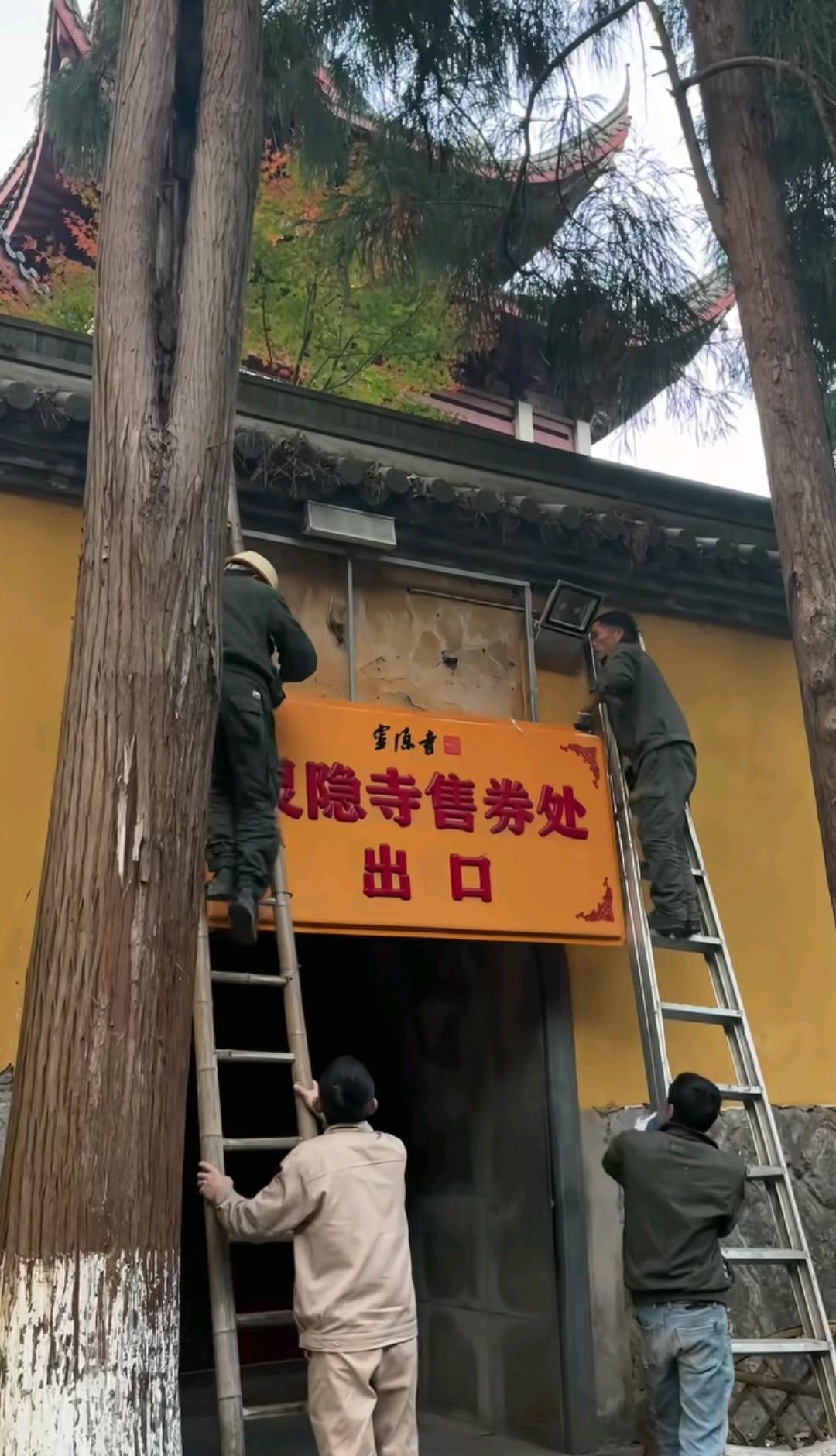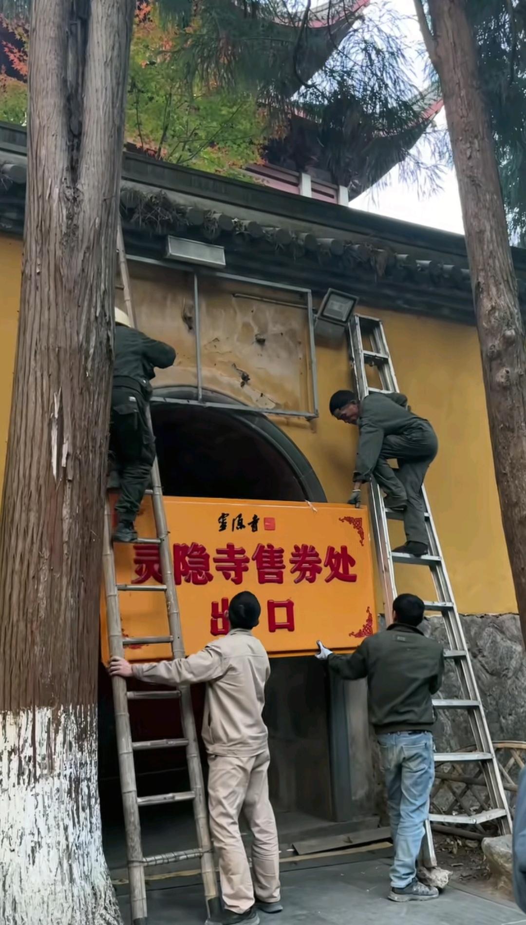 11月30日,在杭州灵隐寺,看到售票出口处摘牌了,这又是当地的一次闯举。 4个工人师傅分成2组,一组2人,一个人扶着梯,一个人上梯,上梯的2个人共同用力把牌摘下来了,这块牌黄底红字,上面写着“灵隐寺售券处出口”,工人师傅摘牌意味着,灵隐寺不再设立售券处了。 看到这历史的一幕,或许大家很激动,充满了去杭州灵隐寺一游的心动,也把游客的心拉到了灵隐寺。