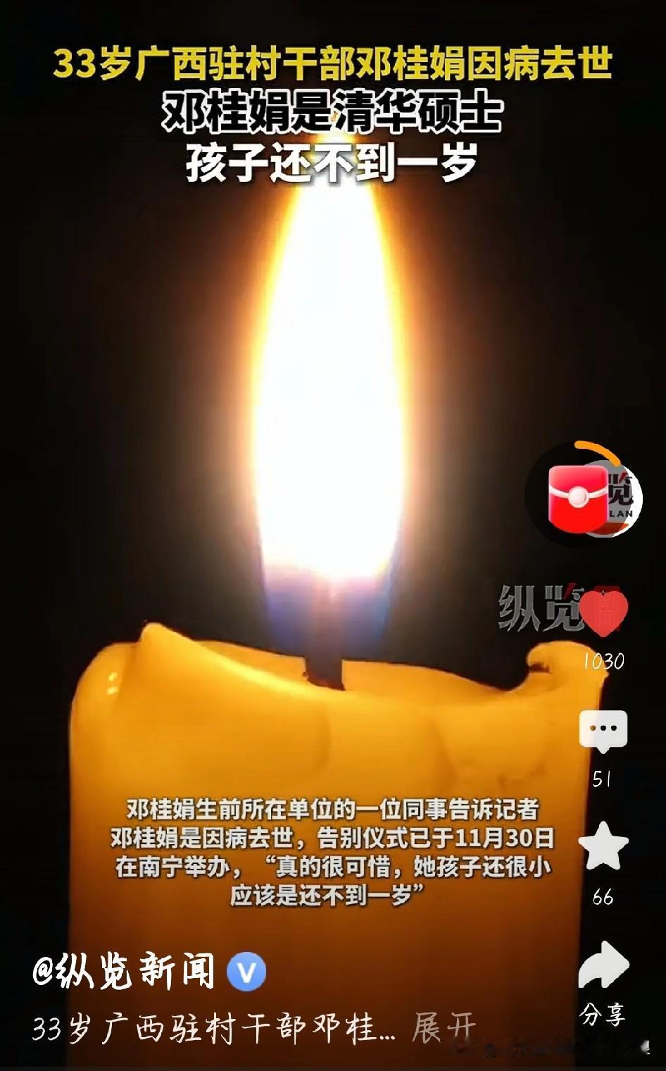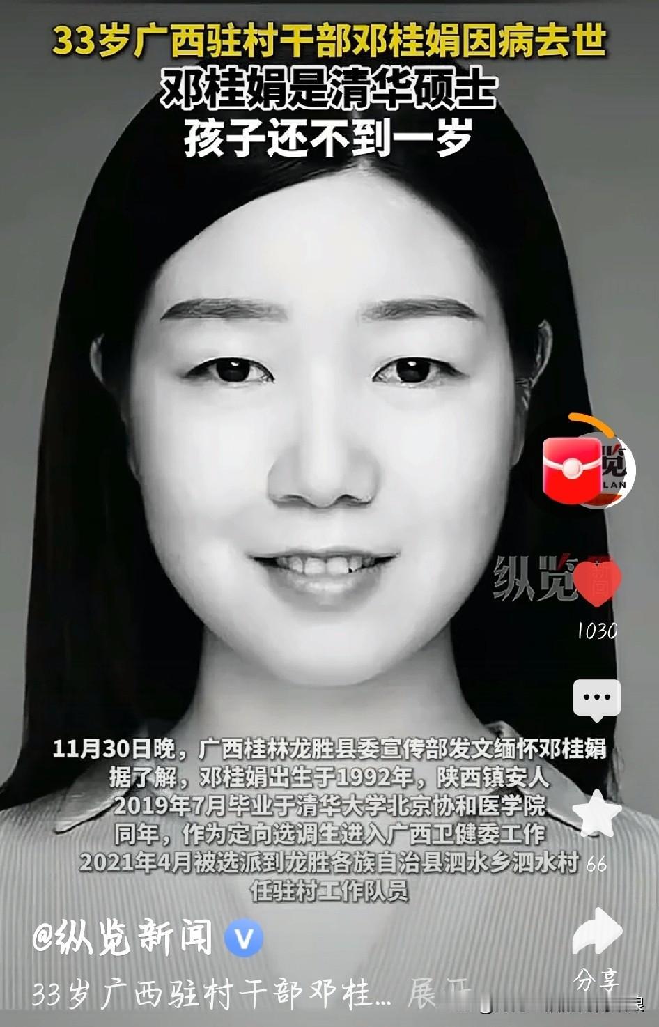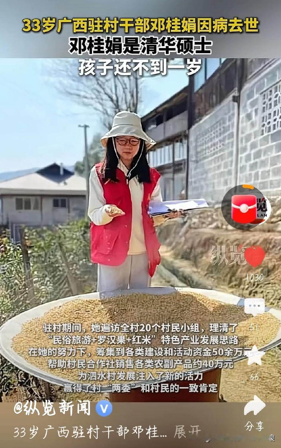痛惜!33岁清华硕士驻村干部离世,孩子还不到一岁 33岁,清华硕士,驻村干部,三个标签凑一起,是让人泪目的奉献! 广西驻村女干部邓桂娟,带着名校光环扎根大山两年多,踏遍全村20个小组,筹50多万建设资金,帮村民卖40多万农副产品,把青春洒在乡土上。 可命运太残忍,她因病匆匆离世,留下还不会叫妈妈的孩子。 从繁华都市到田间地头,她放下文凭揣着真心,帮乡亲们谋生计、找出路,用行动诠释“行胜于言”。 乡村振兴的路上,正是这些“大山的女儿”默默燃烧自己。 邓桂娟一路走好,你的付出,乡亲们永远记在心里! 要不要我整理她的完整事迹合集,让更多人记住这位热血女干部?33岁驻村女干部去世 系清华硕士 图片截图于网络
