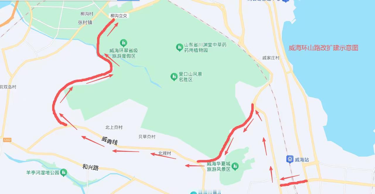威海 山东 威海S302成威线皇冠街道至张村镇段改建工程(环山路二期) 路线全长24.208公里,项目预算投资25亿元,采用双向六车道一级公路技术标准;改造利用齐鲁大道1.926公里、完全利用S201(嵩山路)段4.053公里、改造利用S202段6.823公里,新建段11.406公里。 该工程建成后将形成围绕里口山的闭合环山快速路,衔接多条城市主干线与干线公路,完善 “内环 + 放射型” 路网结构。