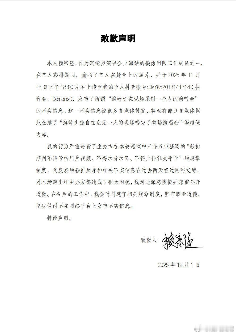 滨崎步摄像团队人员致歉滨崎步一个人的演唱会系彩排被偷拍12月1日,发布致歉声明:本人赖宗隆,作为滨崎步演唱会上海站的摄像团队工作成员之一,在艺人彩排期间,偷拍了艺人在舞台上的照片,并于2025年11月28日下午18:00 左右上传至我的个人抖音账号:CMYK52013141314(抖音名:Demons),发布了所谓“滨崎步在现场录制一个人的演唱会”的不实信息。这一不实信息被很多自媒体转发,甚至有部分自媒体据此杜撰了“滨崎步独自在空无一人的现场唱完了整场演唱会”等虚假内容。我的行为严重违背了主办方在本轮巡演中三令五申强调的“彩排期间不得偷拍照片视频、不得录音录像、不得上传社交平台”的规章制度,我发表的彩排照片和相关不实信息在过去两天经过网络发酵,对本场演出和主办方都造成了很大困扰,我对此深感懊悔并郑重公开道歉。在今后的工作中,我会时刻遵守相关规章制度,坚守职业道德坚决做到不在网络平台上发布不实信息。(澎湃新闻)