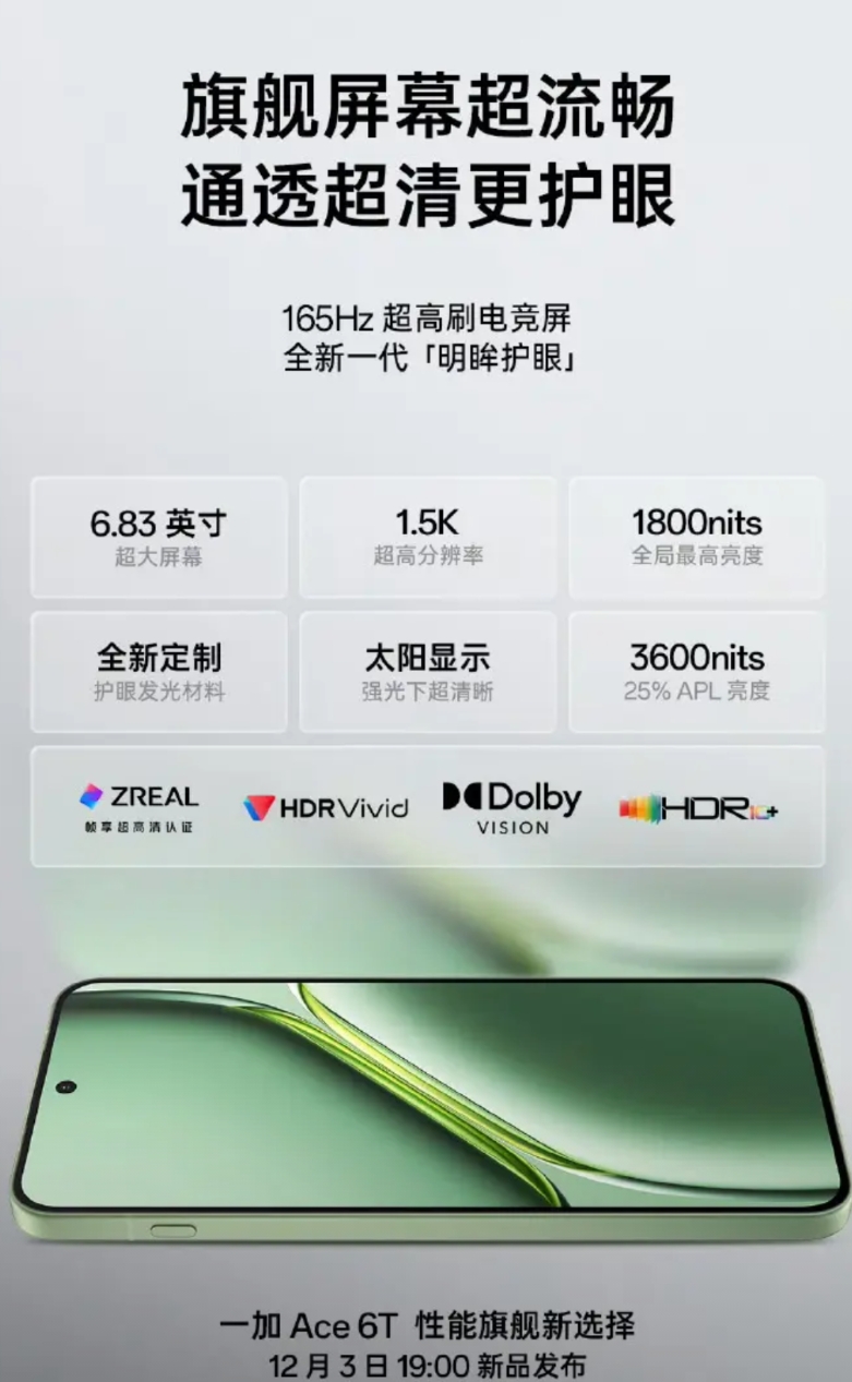 一加 Ace 6T配置被官方全盘托出了,就差售价了! 屏幕方面,采用了全新定制护眼发光材料的6.83 英寸超大屏幕,165Hz 超高刷电竞屏全新一代度眸护眼,支持1.5K超高分辨率,太阳显示强光下超清晰,1800nits全局最高亮度,3600nits25% APL 亮度。 大家猜,多少钱起售?