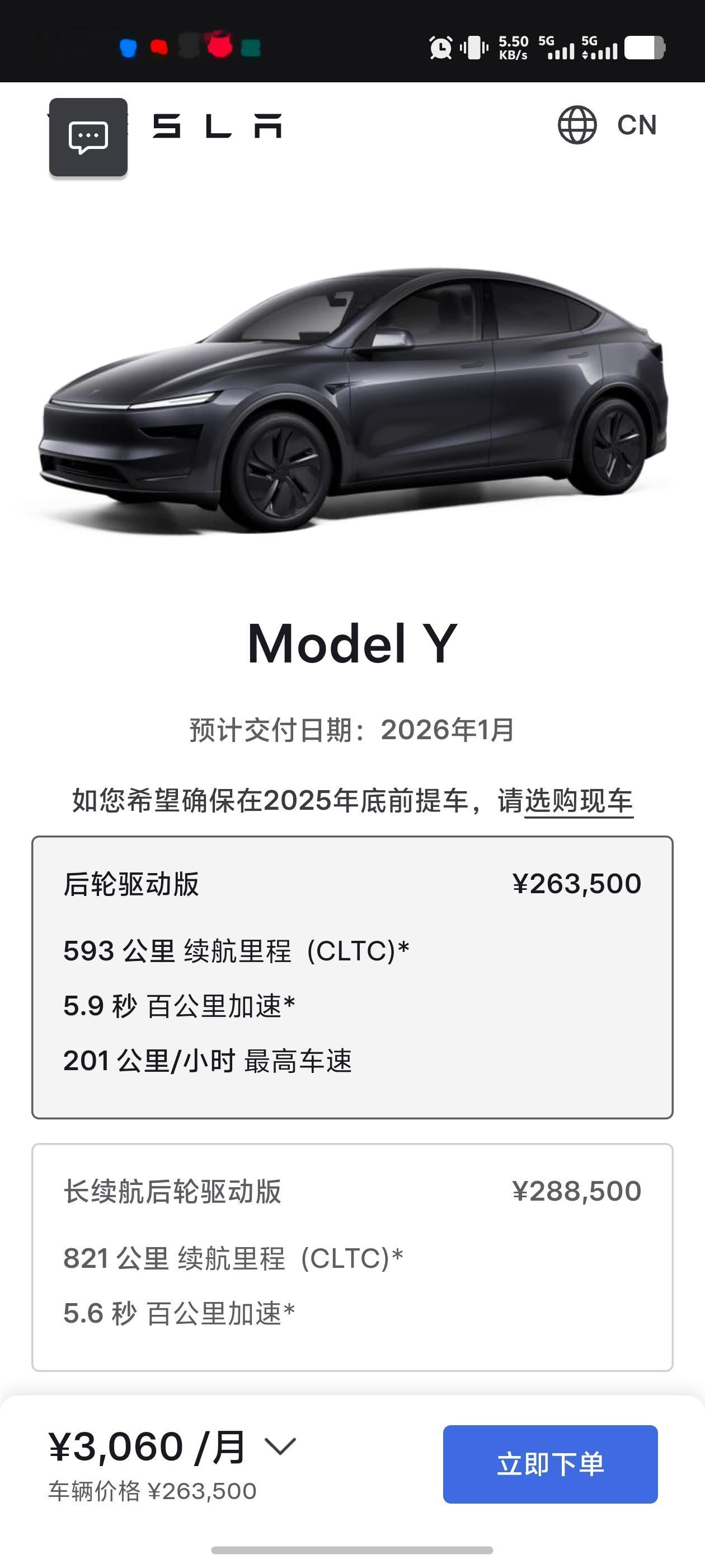 特斯拉销售:后驱标准版 Model Y 今年产能已售罄。看了下下定预计交付时间,确实到 26 年了。
