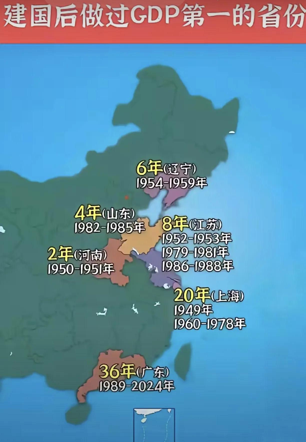 解放后中国大陆GDP位居第一的省份大盘点。广东位居第一36年,上海20年,江苏8年,辽宁6年,山东4年,河南2年。2025年应该还是广东排第一。