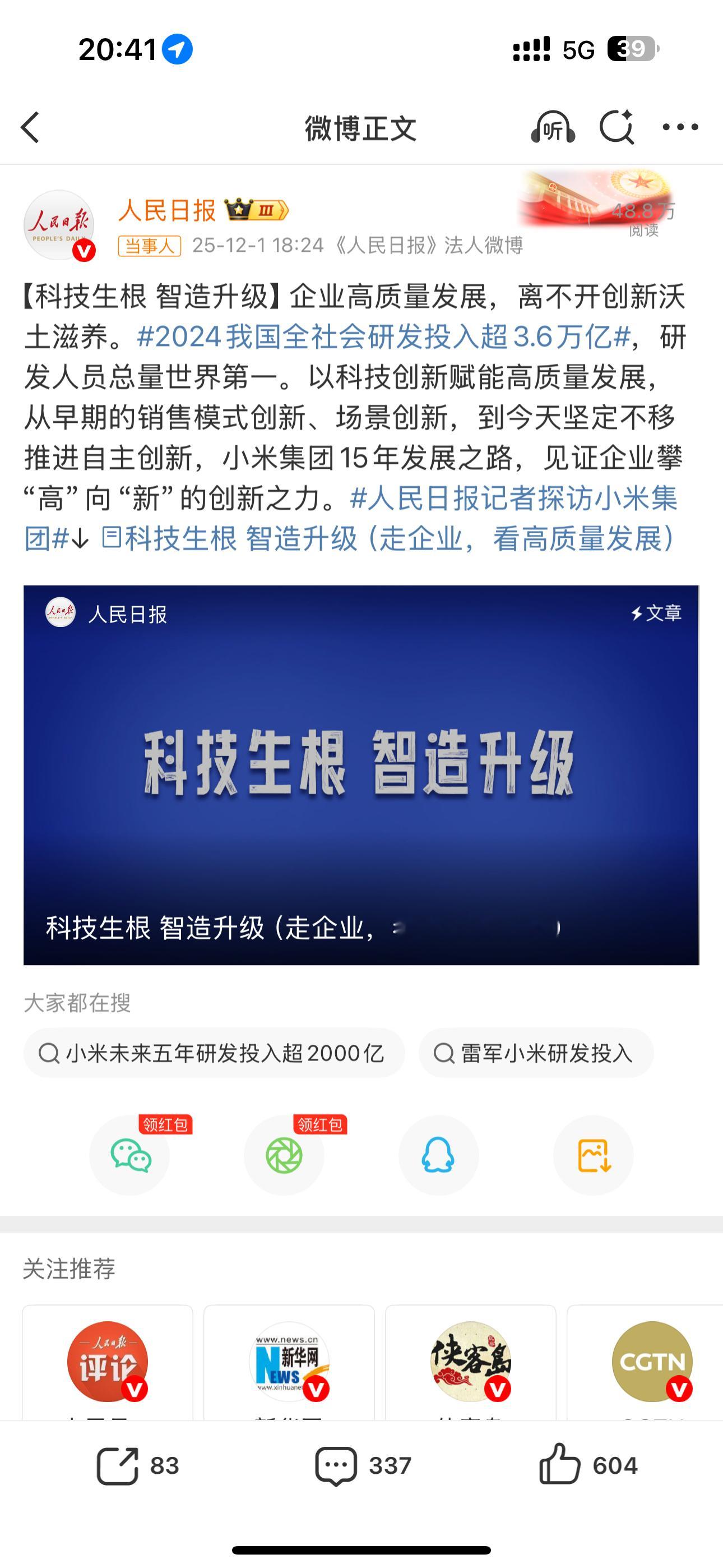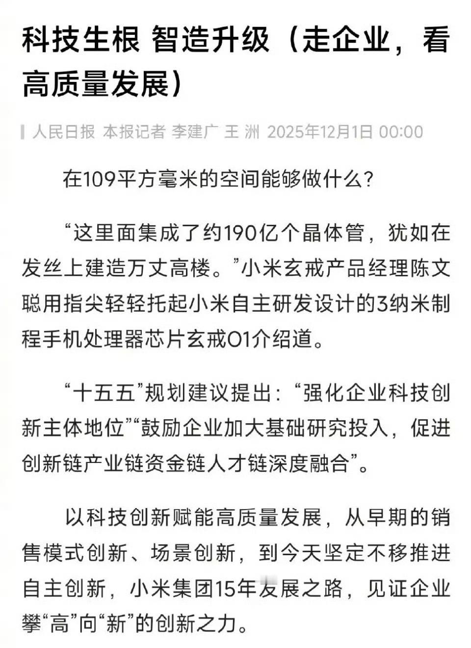 人民日报谈小米集团高质量发展小米这波真的扬眉吐气!人民日报头版力挺,把小米当成中国科技高质量发展的样本,这是国家给的荣誉勋章啊!要知道,过去五年小米在研发上投入超千亿,3nm芯片打破封锁,汽车量产速度创纪录,还搭了澎湃智能制造平台,让200多家企业跟着赚大钱。现在中国智造靠小米这样的企业出海,创新和品质就是新名片,相关部门要整治网络乱象了,小黑们别再逆势而为,国家认可的国货,质量一等一的好,哈哈,我的小米YU7估计在春节左右交付,期待了。
