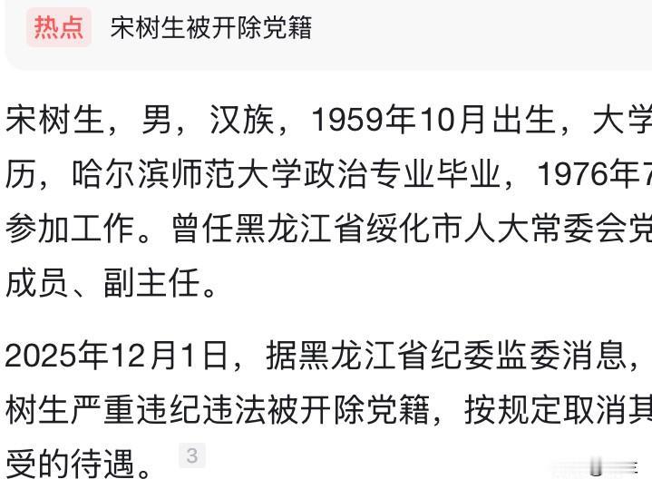 今天黑龙江绥化66岁的宋树生又上了热搜 他的整个职业生涯基本都在绥化度过 曾在绥化担任过不少重要职务 是个不折不扣的本地资深人士 今年66岁的他已经退休多年了 也早已离开了大家的视线多年 很多人可能都以为他已“安全着陆” 可时隔几年后他还是上了热搜 这也说明了 只要做过不该做的事 不管过去了多久 该来的代价终究会来!