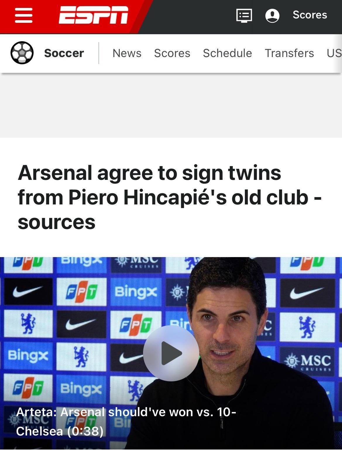 James Olley独家:消息源向ESPN透露,阿森纳已原则上达成协议,将在厄瓜多尔双胞胎兄弟埃德温·金特罗和霍格尔·金特罗于2027年8月年满18岁时,从独立队签下他们。这对16岁的兄弟本周已在伦敦,预计将完成相关手续,包括签署合同,随后俱乐部将在未来日期正式宣布。所涉及的费用目前尚不清楚,但此次转会延续了阿森纳招募下一代顶尖人才的计划,该计划包括在10月确认另一名16岁球员维克托·奥齐安武纳将于2027年1月年满18岁时从沙姆洛克流浪者队加盟枪手。阿森纳将从因卡皮耶的老东家签下埃德温·金特罗和霍格尔·金特罗。独立队是一家厄瓜多尔甲级联赛俱乐部,被认为是厄瓜多尔天才的温床,曾培养出切尔西的凯塞多和因卡皮耶,后者于今年9月从勒沃库森租借加盟阿森纳一个赛季,并附带永久转会选项。切尔西也已达成协议,将从独立队签下少年球员肯德里·帕埃斯和戴纳·奥多涅斯,但阿森纳在争夺金特罗双胞胎兄弟的竞争中击败了众多欧洲顶级俱乐部。消息源告诉ESPN,枪手已经追踪这两名球员超过一年时间。埃德温·金特罗是一名速度很快的右边锋,据报道被比作年轻时的内马尔,而霍格尔则被视为一名攻击型中场。这笔交易被视为俱乐部青训招募团队的一次成功出击,消息源称,一个关键因素在于俱乐部为青训球员通往一线队指明了清晰的路径,刘易斯-斯凯利、伊桑·恩瓦内里以及最近的马克斯·道曼近期取得的进展就是明证。