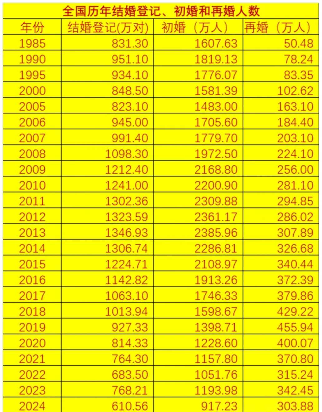 2024年,中国初婚人口是917万,是第一次跌破了1000万。说实在的,这并没有超出我的预料。