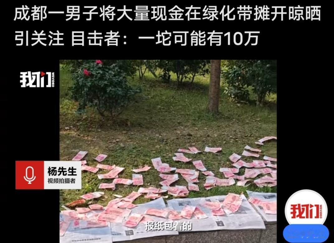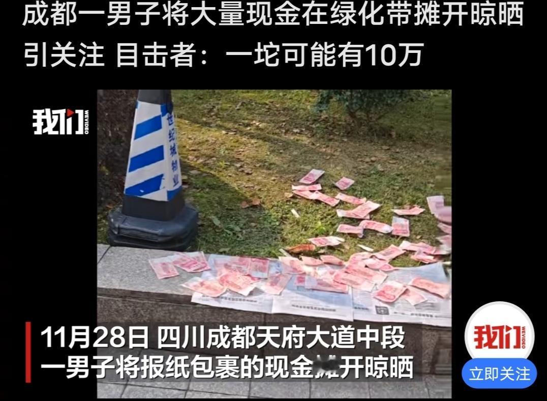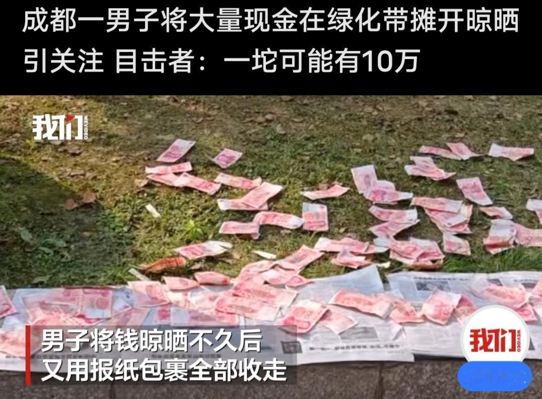 今天发现好多媒体平台都在发布这个消息,就是四川成都天府大道中段,一个男子将报纸包裹的百元大钞摊开来晾晒,就在一绿化带上面铺面一地,一路过的行人拍下了这一幕,这名目击者说看上去有10万的样子,就问他,怎么这样,当事人说弄湿了,晒一下,说的当时没几个人,最主要没有风,有风的话估计会被吹得到处都是啊! 这一报道一出来,网友们都不淡定了,这就才是妥妥的晒钱,炫富啊。还有的说,万事俱备只欠东风,也有人说相信成都人的素质,晒一百万都没人动他的。 不过说真的,他这一操作还真不提倡,在成都这边的人的素质好,不代表天气也这么好,风会这么友好,万一来一阵风,毕竟不是几百,是这么大数额的,被风吹得到处都是,咔咔咯咯谁有看得见。 算了,人家有钱任性,我们这些没钱的,还是老老实实过自己的日子,老老实实搬自己的砖哦!