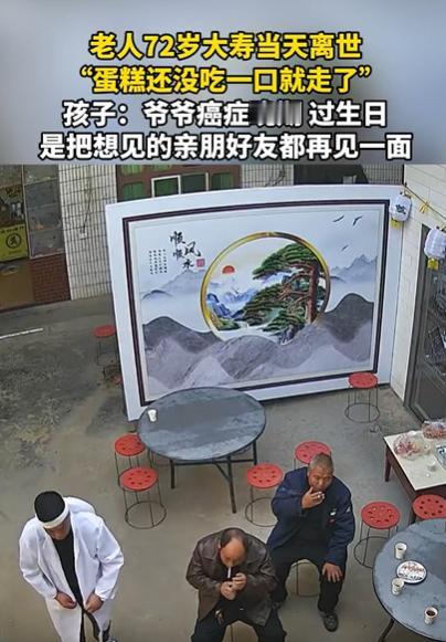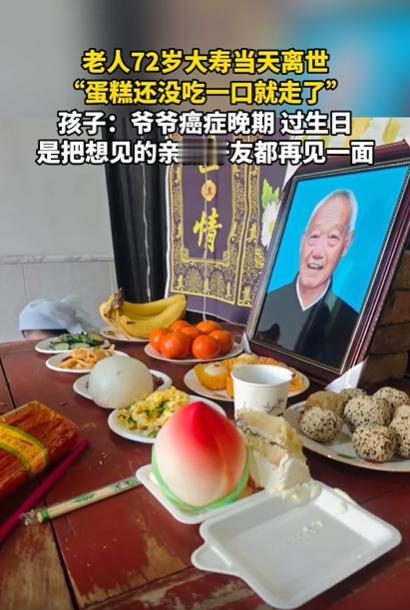 这就是命啊!陕西一老人72岁大寿,亲朋好友都赶来贺寿,结果,老人却在生日当天去世,连生日蛋糕,都还没来得及吃一口就走了,家人将寿桃、气球撤走,换上了白衣服,孙子表示:爷爷癌症晚期,过生日是把想见的亲朋好友都再见一面! 爷爷胆管癌晚期,已经无力回天,过生日也算是把想见的亲朋好友都见了一面!老人身体已经是极限了,也是强撑着身体,见见亲朋好友! 寿宴当天,院子里搭了红帆布棚子,墙上、门上全贴了烫金的“寿”字,晃得人眼亮。家属特意买的寿桃,一个个红扑扑的,顶上还印着金边,院门口拴了一串红气球,风一吹“哗哗”响,热闹得跟过年似的。 一大早亲友就陆续来了,老人一一见过众人,眼看快到中午开席,老人说有点累,想回屋躺会儿歇口气,可这一歇息就再也没醒来!或许是了却了自己的心愿,这一口气卸下来后,就再也坚持不住了。 一家人默默换上白衣服,刚才还满院的笑声、肉香味,转眼就静了,热闹的寿宴,悄悄变成了安安静静的送别。 有网友说,“我姥爷当年也是这样,肺癌晚期硬撑着过了70大寿,见完所有亲人第二天就走了,老一辈的心结啊,就是把人凑齐了才肯闭眼!” 有人说“这命太苦了,办寿当天就走”。 可细琢磨琢磨,这哪是苦,是大爷把日子过明白了。医生说他时日无多,他没躺在床上唉声叹气,反而主动要办寿宴——不是图啥排场,是想把这辈子的情分捋清楚:跟老战友再握次手,给远房侄女的孩子塞个红包,看一眼刚满月的重孙子。 没吃的蛋糕也不是遗憾,是“人齐了就好”的坦然——老爷子要的从来不是蛋糕的甜,是团圆的暖。 “知足者常乐,尽欢者无憾”,大爷72岁,没熬过生日的晚饭,却把这辈子最在意的事都做完了。这世上的圆满,从来不是非得活成“长命百岁”的数字,对老一辈人来说,圆满是“想见的人都见了,想说的话都说了。 老人72岁大寿当天离世