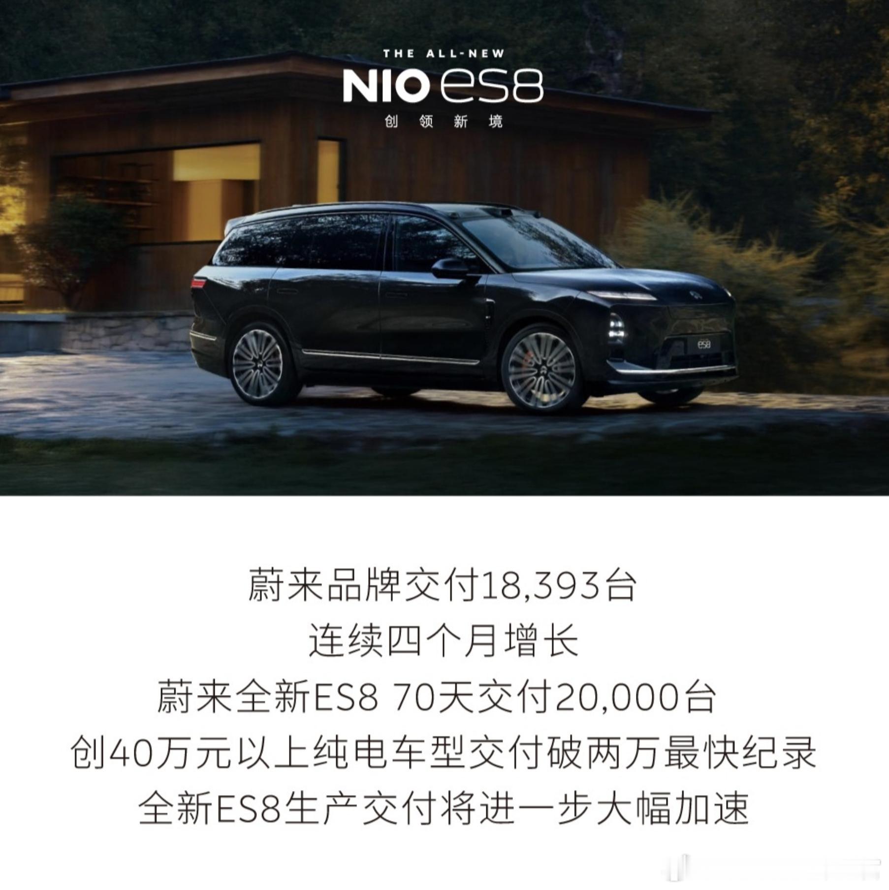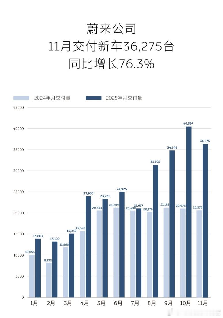 11月蔚来共交付新车36275台,同比增长76.3%;乐道品牌交付11794台,同比增长132.1%其中,全新蔚来ES8在70天内完成了2万台的交付,乐道L90四个月更是交付了39319台,成为了大型纯电SUV的销量第一主打精品小车的萤火虫11月销量6088台,目前已经连续三个月超过MINI,Smart全部车型销量总和,并且还开拓了海外市场大V聊车