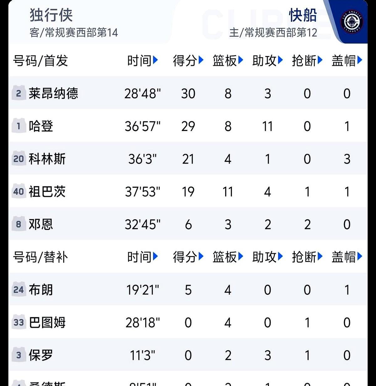 快船输独行侠这事儿,替补拉胯得没眼看!全场仅6人得分,替补加起来才5分——就布朗拿了5分,其他替补全挂零。哈登和小卡俩老将最后拼到没劲,也救不了场。 反观独行侠替补,直接杀疯了:克莱汤普森一人砍23分,威廉姆斯14分+7助攻,团队篮球打得溜得很。 这场球输的锅,替补得背大半!首发再牛,替补掉链子也白搭——篮球又不是单打独斗,替补不给力,赢球难上天啊!