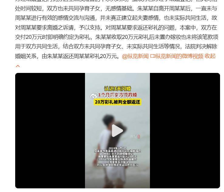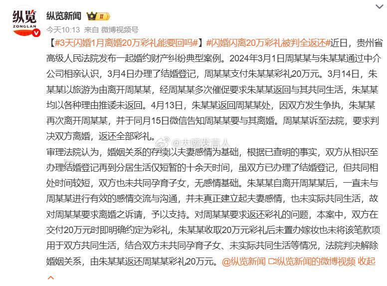闪婚闪离20万彩礼被判全返还 你说,她们睡过没有?“法院判决解除婚姻关系,由朱某某返还周某某彩礼20万元”,这是赔了吧,一个多月从结婚到离婚,毛钱没赚到手,哎呀呀,集美太亏了3天闪婚1月离婚20万彩礼能要回吗,热点观点
