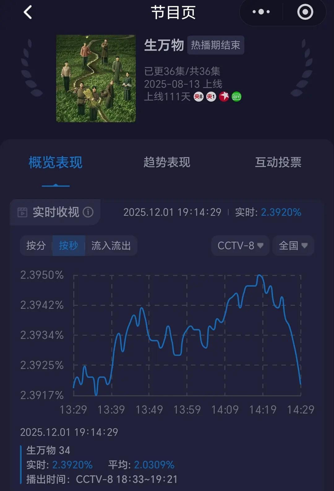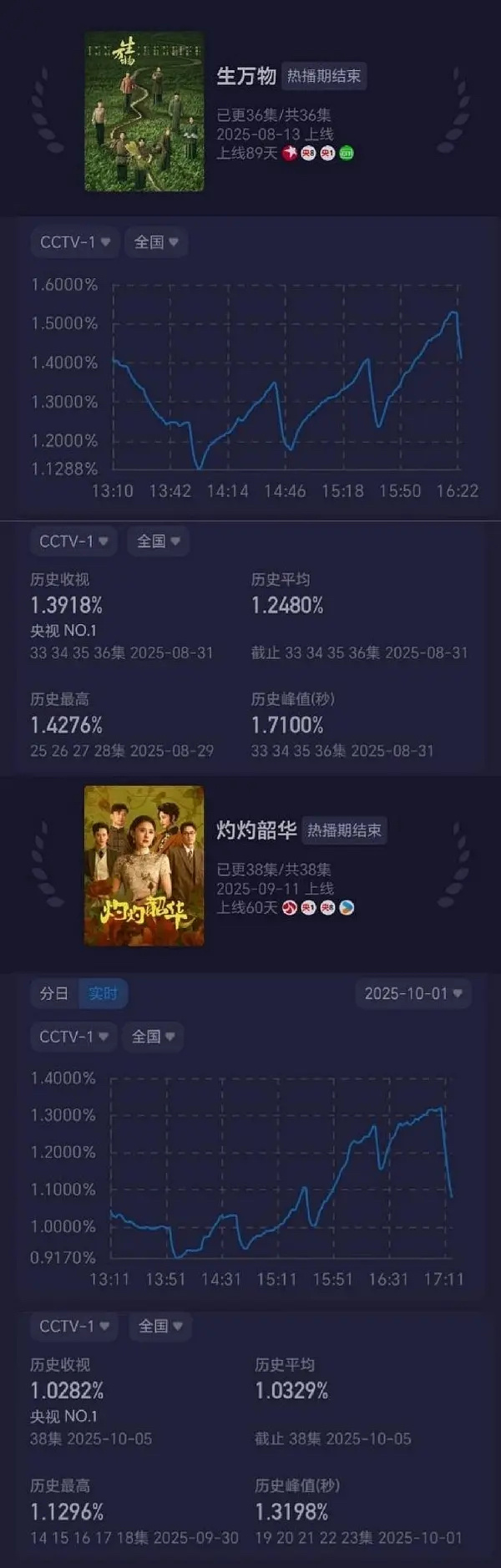 生万物 收视率 第四次播,又拿下了第一。生万物傍晚档峰值2.3950 ,之前最高的是2.31也是傍晚档唯一一部均值破二的,唯一!!!央一1.5轮也拿下暂年冠