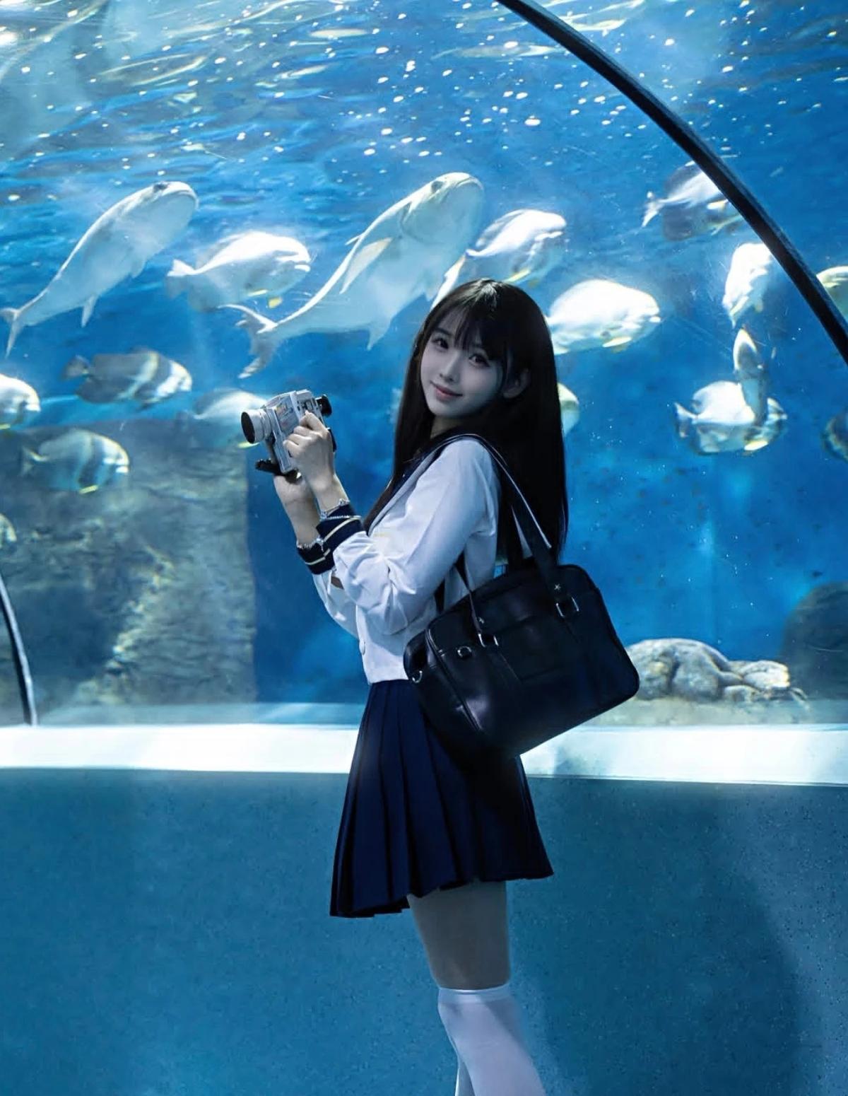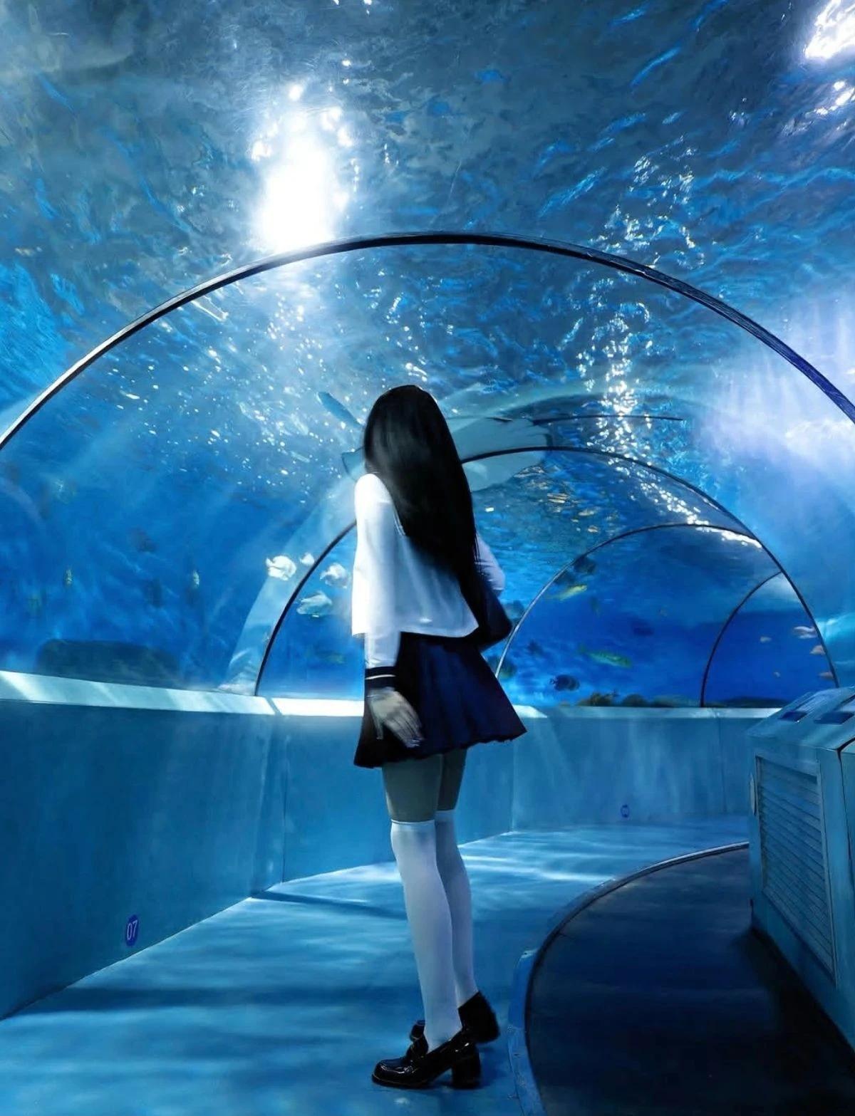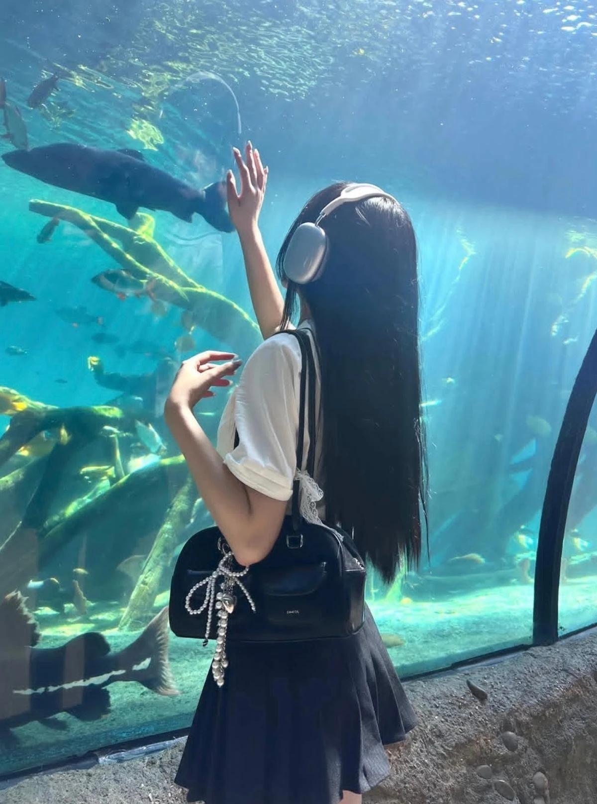 少女摄影|NO.0131期 清新漂亮气质又灵动 梦幻温柔又好看出片 水族馆蓝调氛围感写真 ✅沉浸式互动姿势 背对镜头轻触玻璃,让鱼群当你的天然背景板,阳光穿透水面的光斑就是最好的滤镜。 ✅道具巧思 耳机+复古相机,瞬间拉满故事感,仿佛在记录海底的私藏旋律。 ✅光影魔法 坐在蓝色光影里低头看手机,长发遮挡侧颜,朦胧中自带电影感滤镜。 ✅动态抓拍 踮脚指鱼的瞬间,百褶裙摆随动作轻扬,连背包上的珍珠链都在发光。 ✅氛围感杀器 隧道尽头的逆光站立,让头顶的鱼群化作流动的星光,清冷感直接拉满。 📸穿搭Tips:白衬衫+黑百褶裙永不出错,搭配白色长袜中和甜酷感,黑色皮包点缀珍珠,细节控必学!