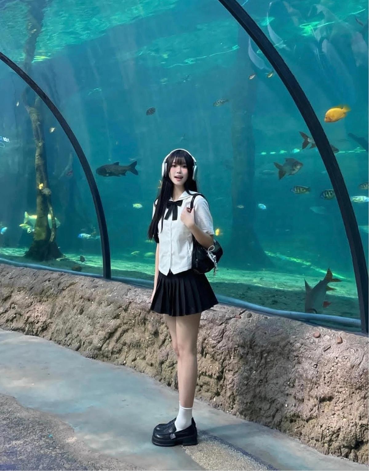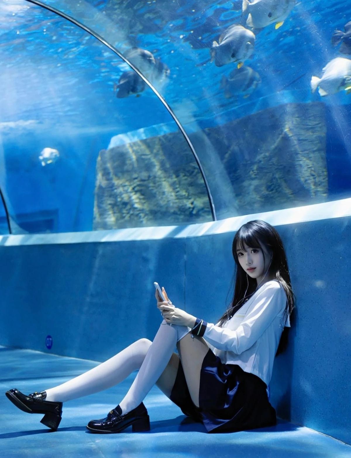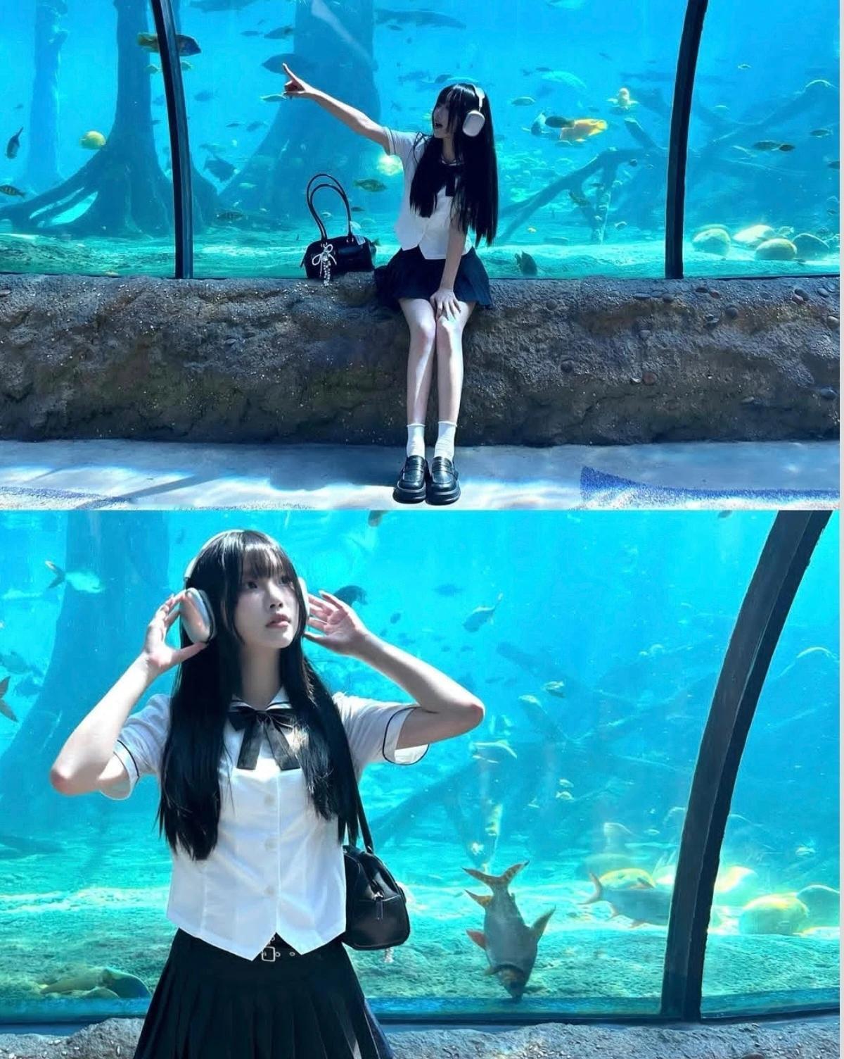 少女摄影|NO.0131期 清新漂亮气质又灵动 梦幻温柔又好看出片 水族馆蓝调氛围感写真 ✅沉浸式互动姿势 背对镜头轻触玻璃,让鱼群当你的天然背景板,阳光穿透水面的光斑就是最好的滤镜。 ✅道具巧思 耳机+复古相机,瞬间拉满故事感,仿佛在记录海底的私藏旋律。 ✅光影魔法 坐在蓝色光影里低头看手机,长发遮挡侧颜,朦胧中自带电影感滤镜。 ✅动态抓拍 踮脚指鱼的瞬间,百褶裙摆随动作轻扬,连背包上的珍珠链都在发光。 ✅氛围感杀器 隧道尽头的逆光站立,让头顶的鱼群化作流动的星光,清冷感直接拉满。 📸穿搭Tips:白衬衫+黑百褶裙永不出错,搭配白色长袜中和甜酷感,黑色皮包点缀珍珠,细节控必学!
