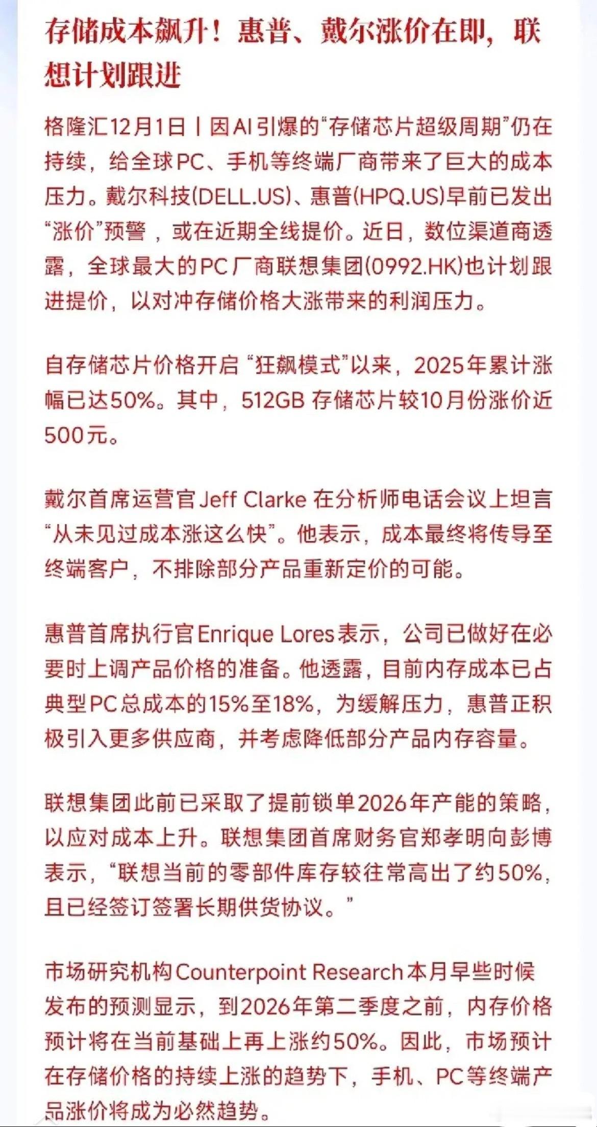 存储芯片与消费电子迎利好:戴尔、惠普拟因存储芯片短缺推高成本而涨价,手机、硬盘等品类或跟进提价。目前512GB存储芯片价格已从约257元涨至757元(涨幅超190%),呈现有价无市态势;闪迪、三星等大厂报价动态调整,货源需排队采购。