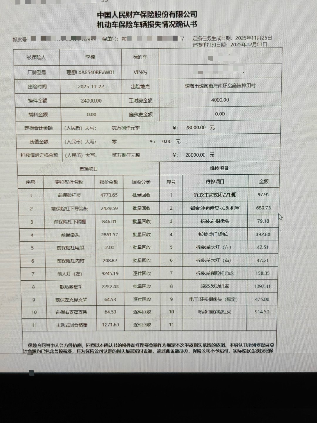 粉丝的理想MEGA追尾,定损28000,也不要惊讶,看他维修清单,主要是前大灯一颗将近1万。