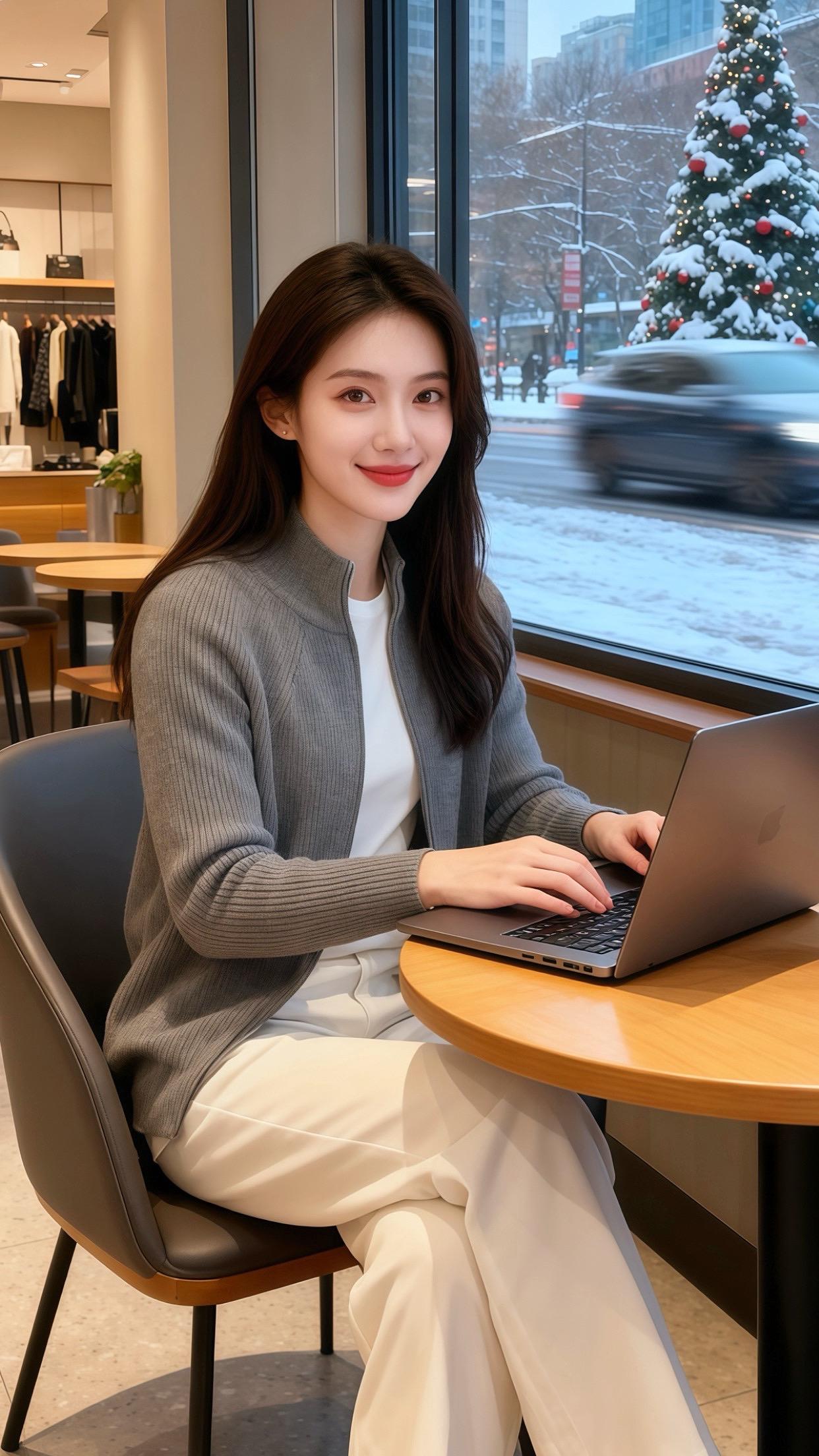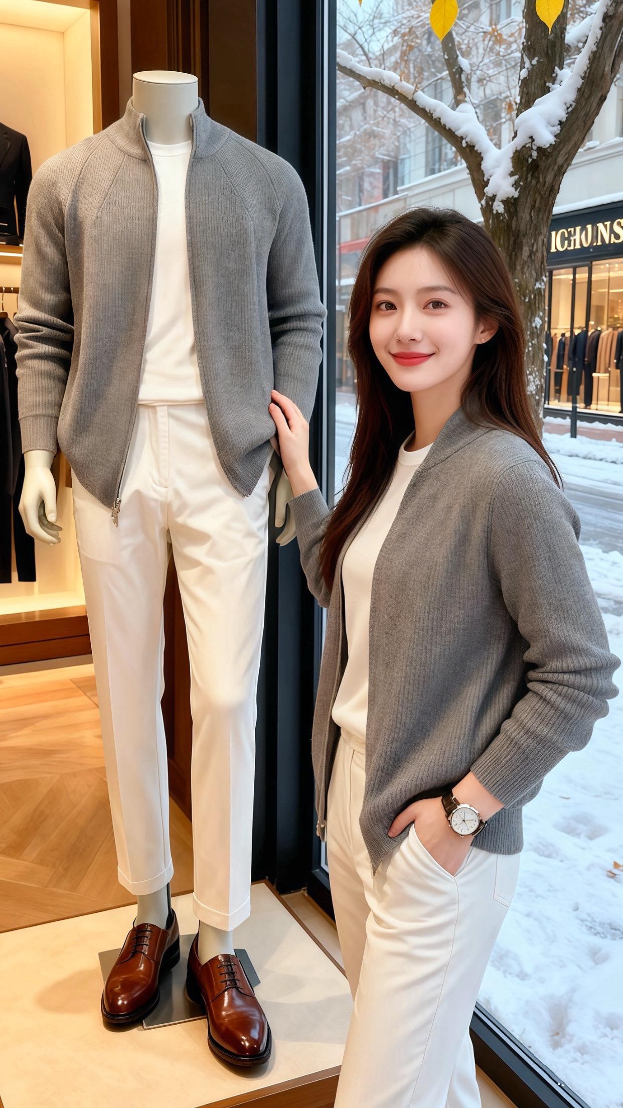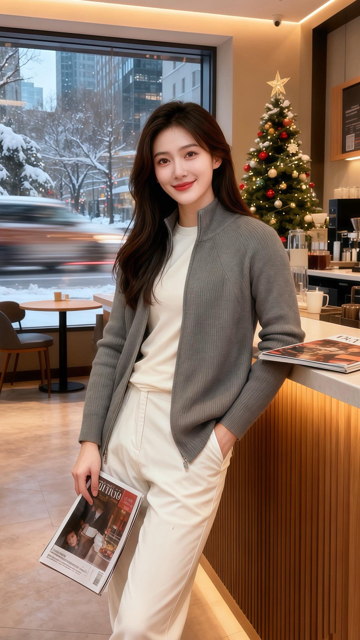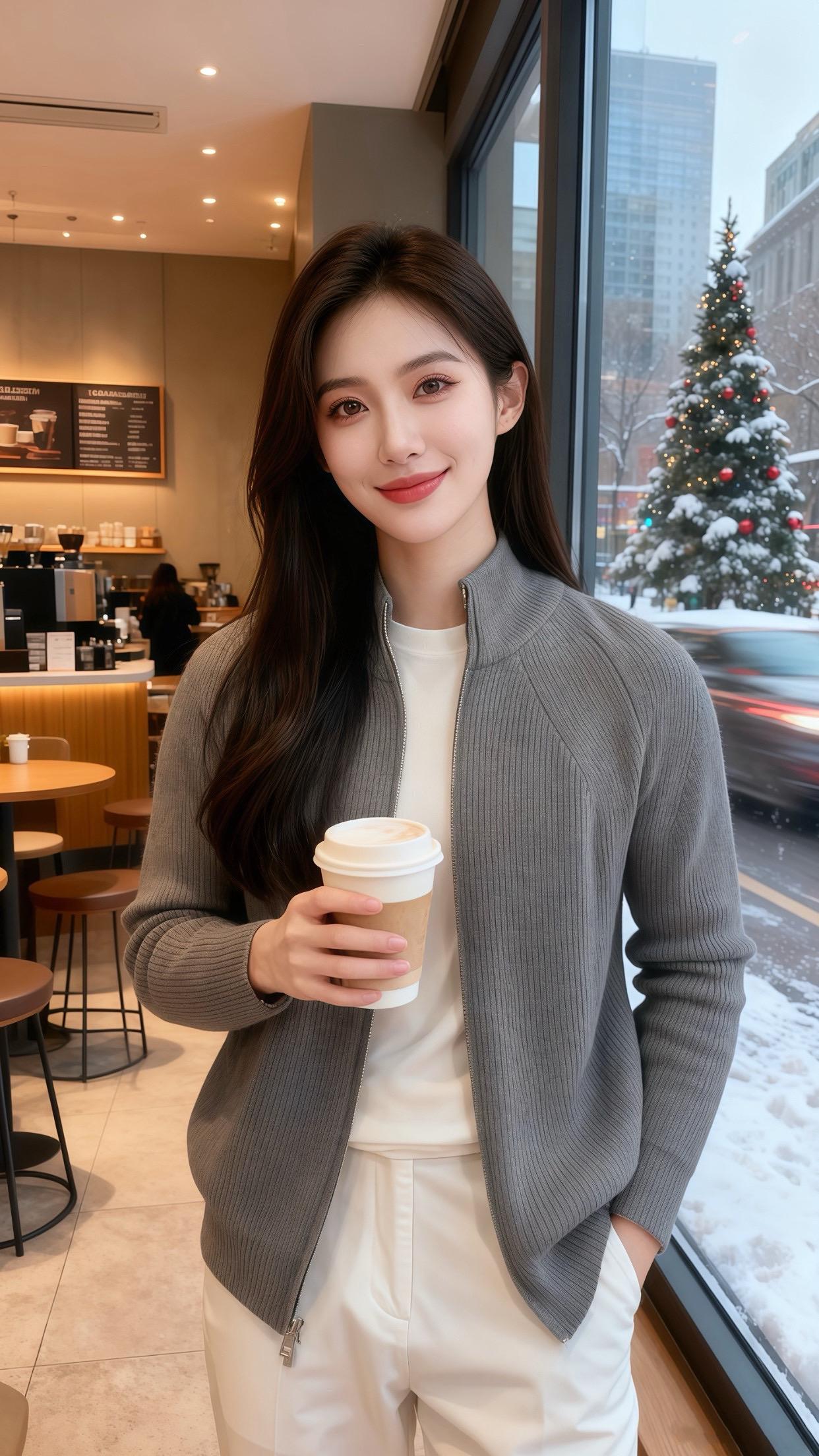 雪粒敲着咖啡馆的玻璃时,许妍正指尖敲着笔记本键盘——灰色坑条针织开衫的拉链半开,露出里面的白T恤,冷调的灰撞着软白,像把冬日的圣诞灯影揉出了精致的层次。