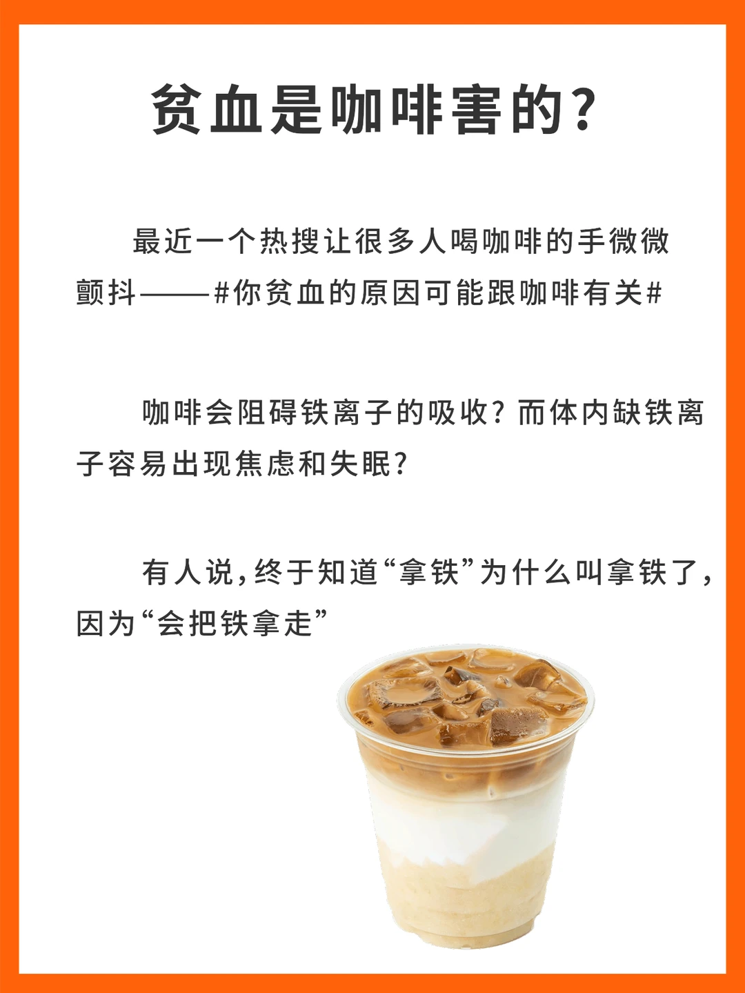 最近一个热搜让很多人喝咖啡的手微微颤抖——你贫血的原因可能跟咖啡有关 ☕ 咖啡会阻碍铁离子的吸收?而体内缺乏铁离子容易出现焦虑和失眠? ☕ 还有人说,终于知道“拿铁”为什么叫拿铁了,因为“会把铁拿走”……