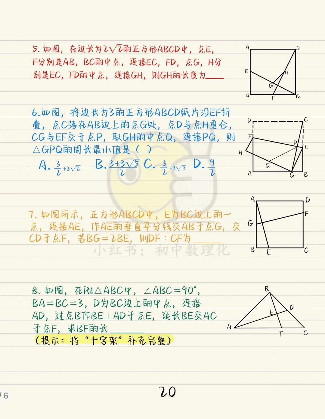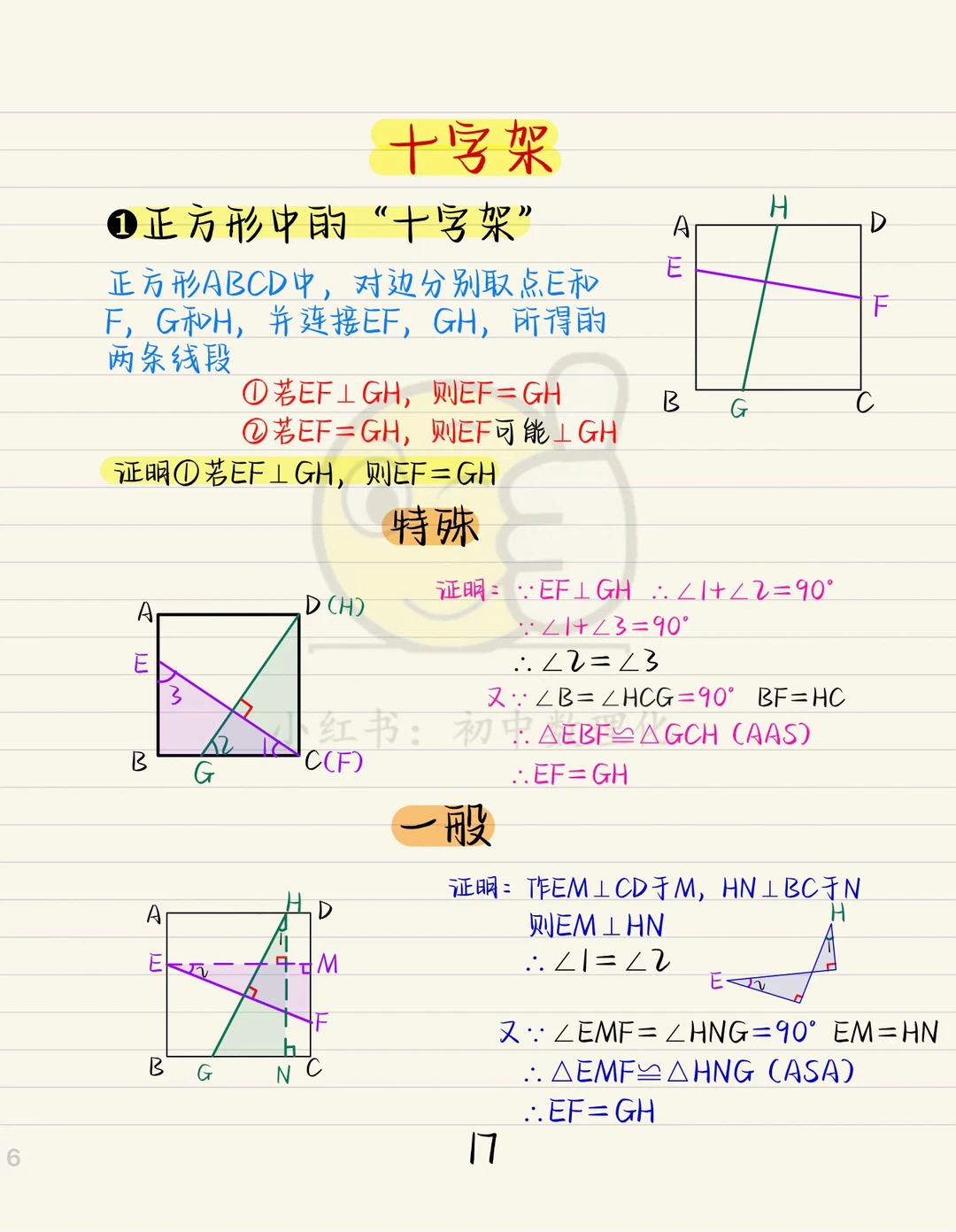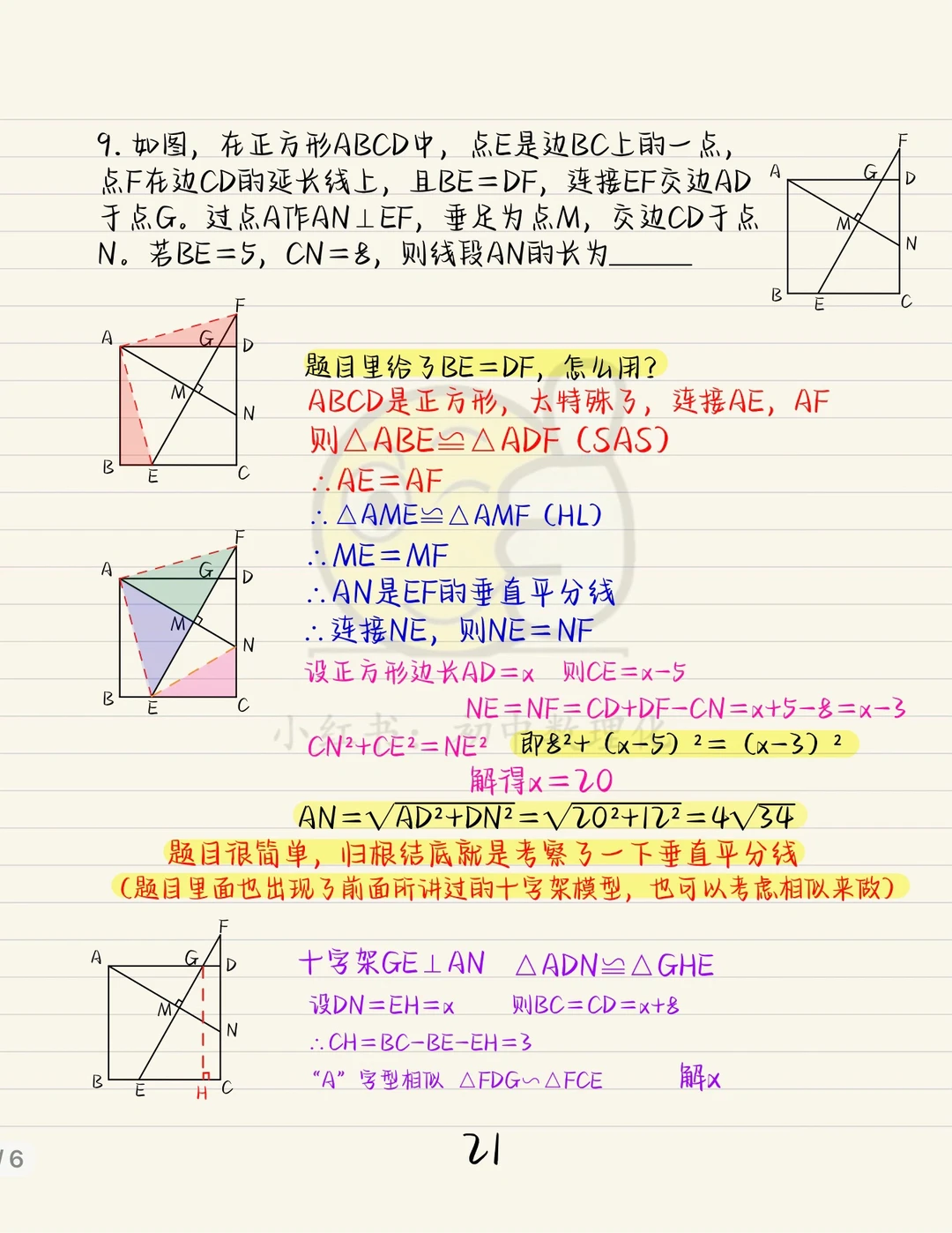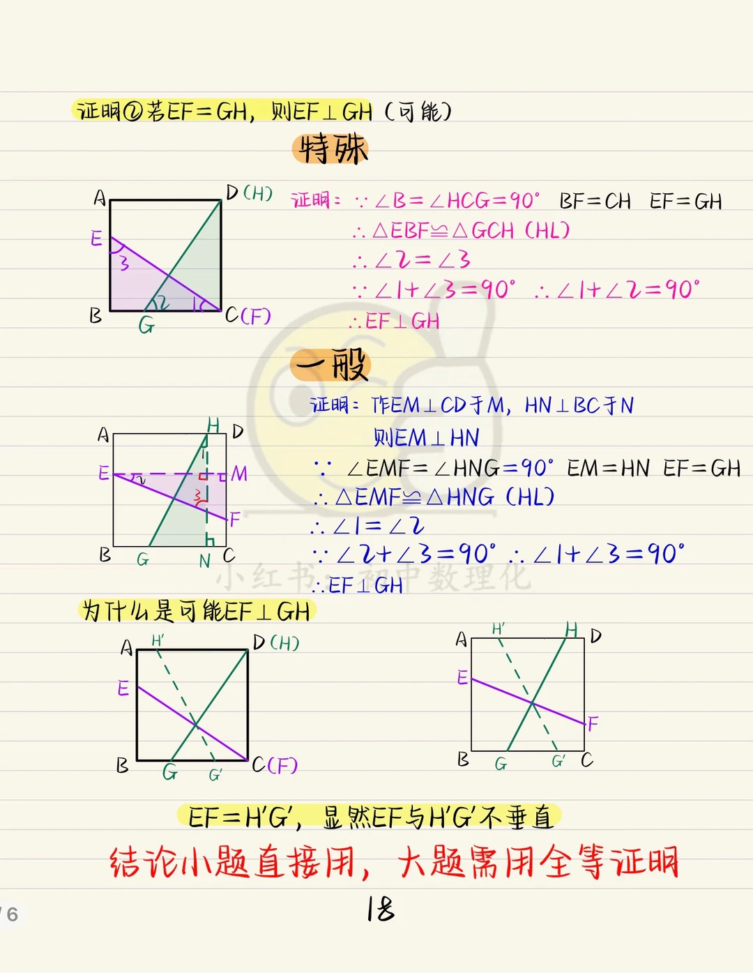 “正方形十字架”期末其中考试的重点模型。 已知边等则垂直,已知垂直则边相等。 详细介绍了折叠问题,结论是需要记住的。 小题直接秒,大题需利用全等证明。