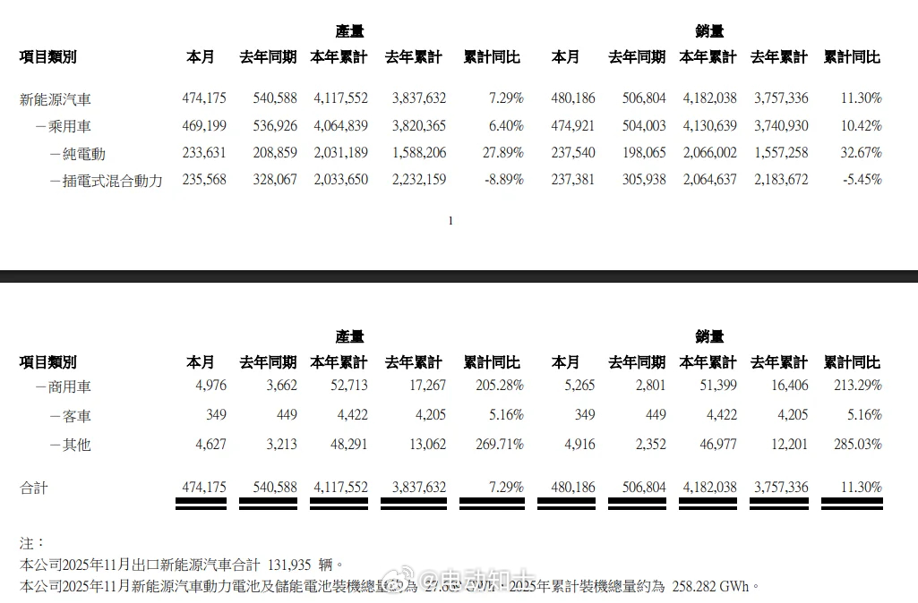 比亚迪11月新能源汽车产量47.42万辆,销量48.02万辆;本年...