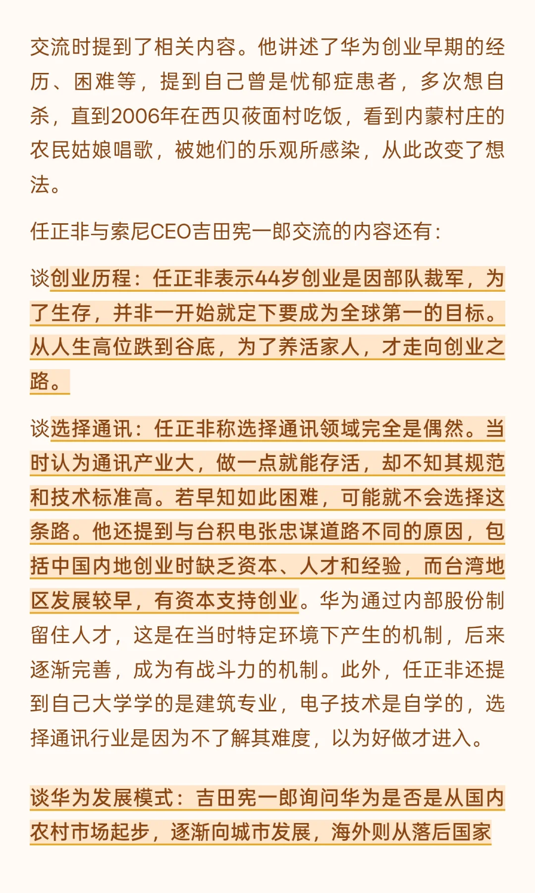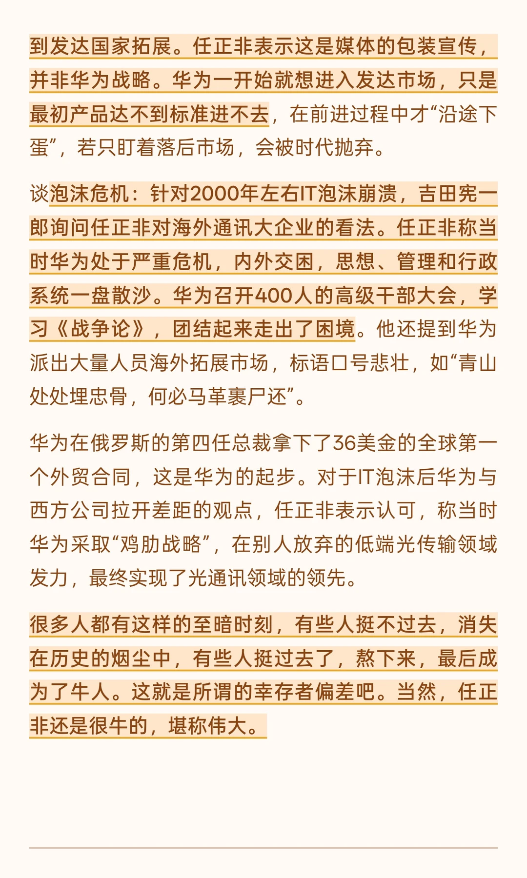 任正非创业初期经历痛苦与绝望,2006年在内蒙看到牧民的乐观感染,重拾生活信念。 “2000年左右,我经常半夜吓醒,每个月都要发3个亿的薪水,真怕哪一天发不出来怎么办?创业30年,只有痛苦痛苦、还是痛苦。把我变成一名忧郁症患者,多次想了结此生。 直到2006年在内蒙一家小饭馆吃饭,一群牧民姑娘在唱歌、跳舞,我在想,他们那么贫困还在热爱生活,为什么我不能活下去?那天我流了好多泪。” 他强调华为选择通讯领域是偶然,创业初期面临巨大困难,通过学习与团结走出困境。