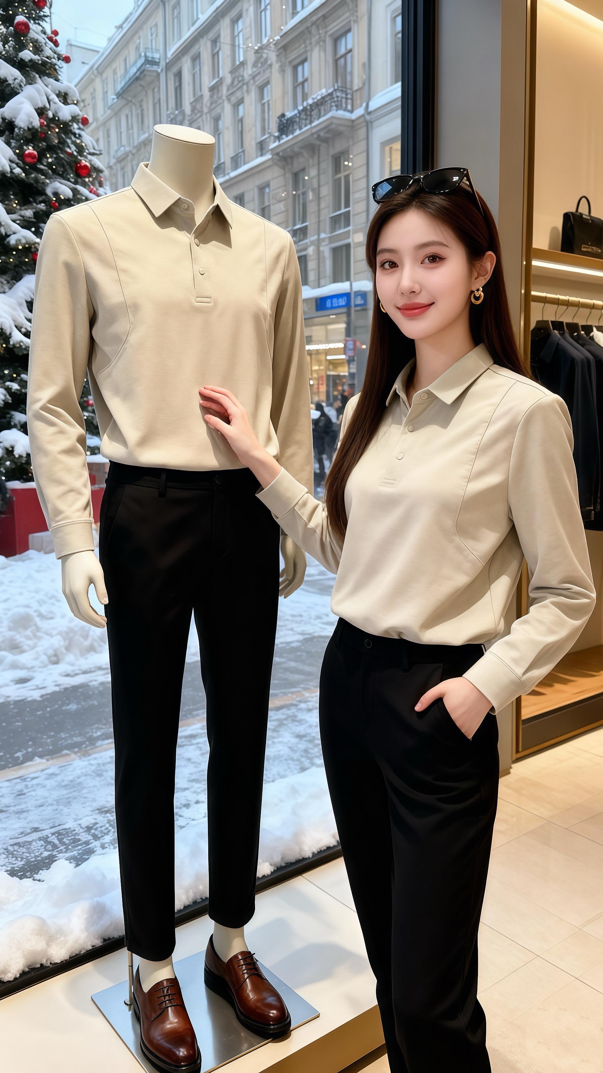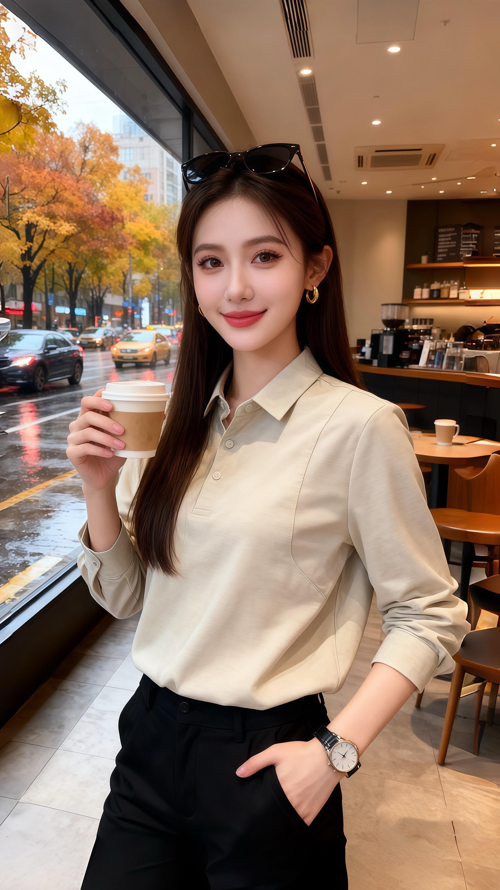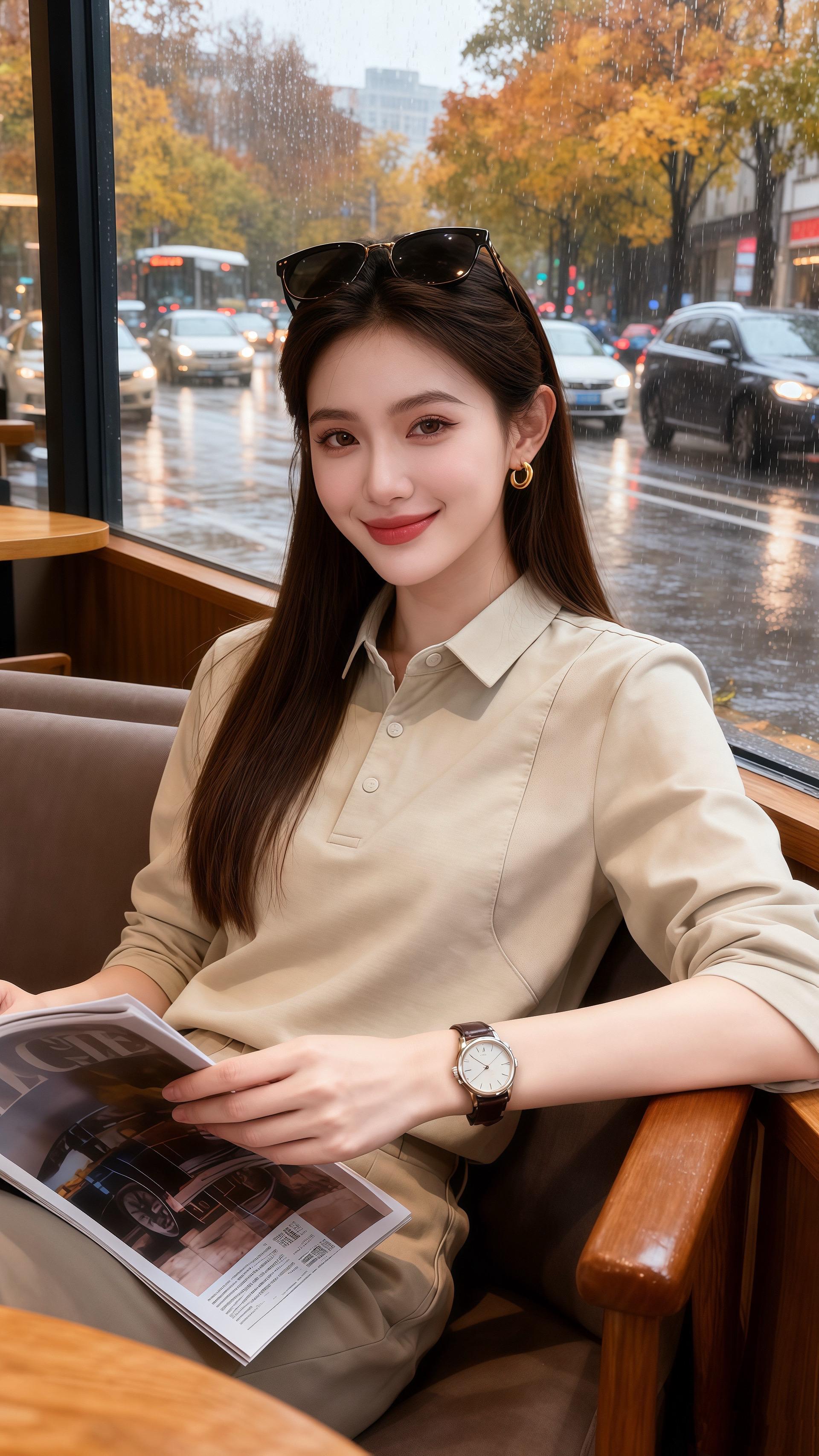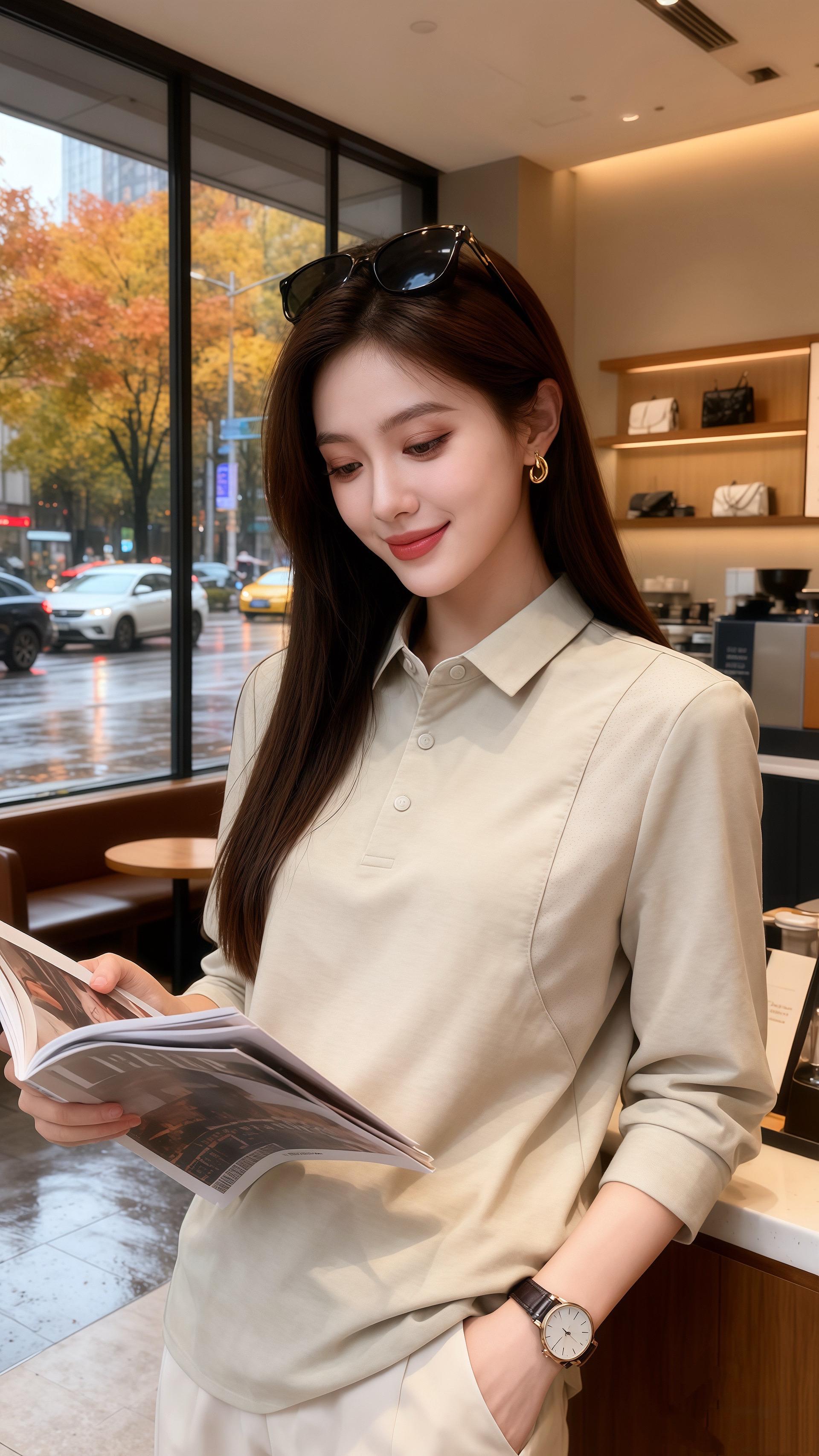 雨丝裹着桂香漫进窗时,林柚穿了件浅杏色翻领衫——布料软得像揉皱的月光,侧缝的线条顺着肩背轻垂,袖口卷到小臂,露出腕间棕带手表的细边。