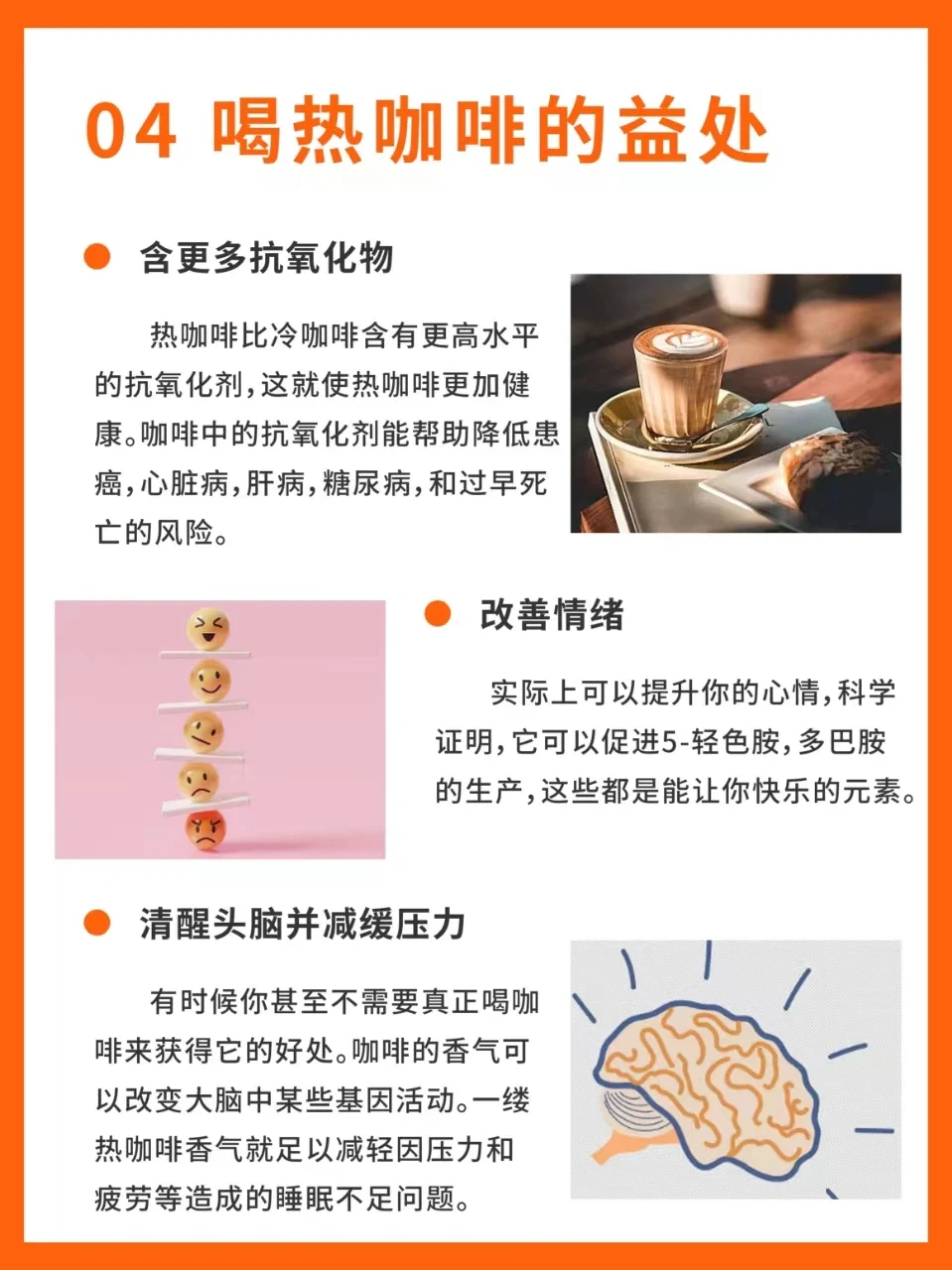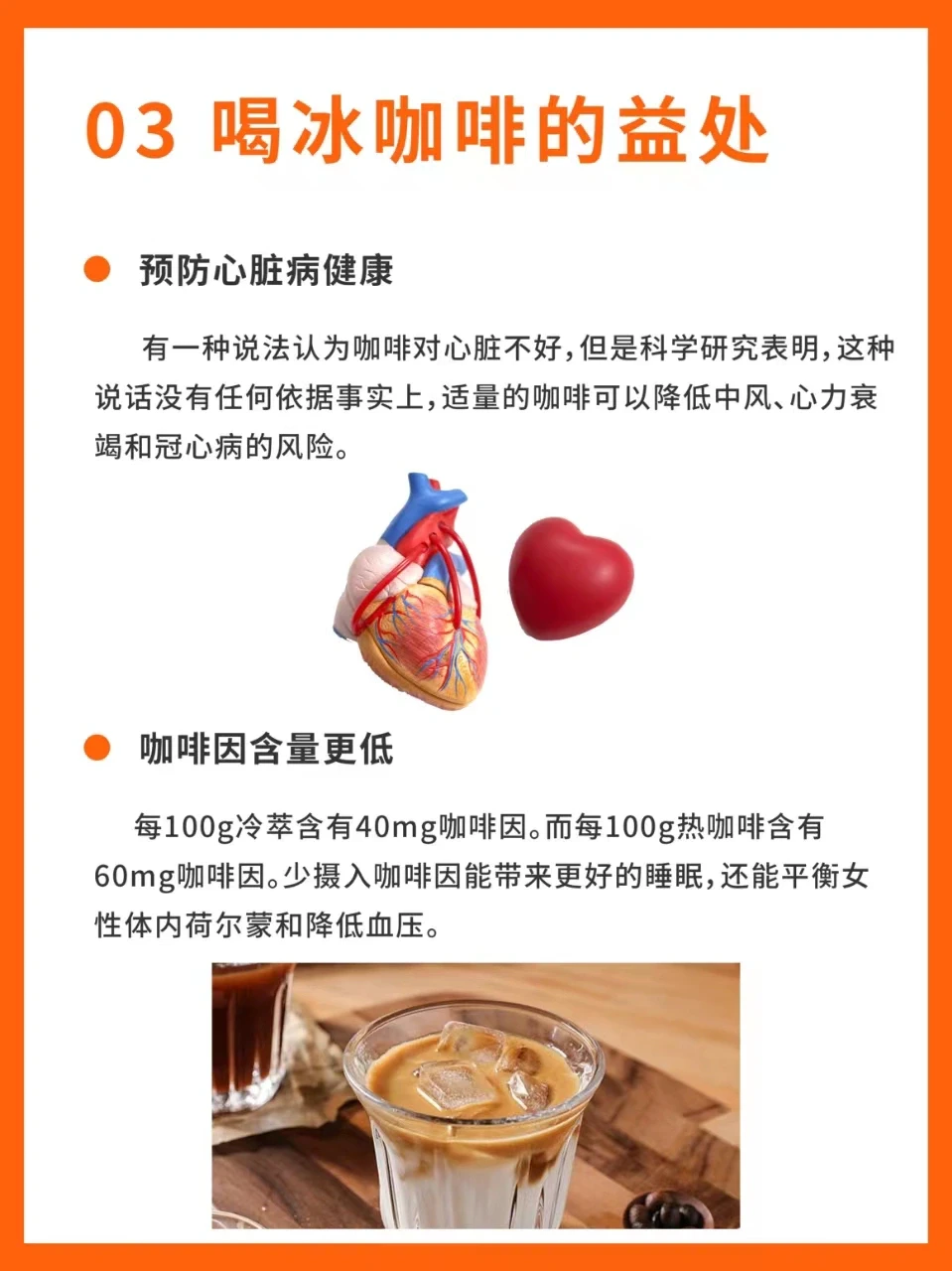 -冰咖啡 冰咖啡的风味香气以及酸香甜苦醇上会比热的有一定的弱化,会更柔和,但喝起来更爽口。非常适合夏天饮用。 -热咖啡 热咖啡可以感受到更好的风味和香气,并且随着慢慢降温可以感受到不同温度下咖啡李的酸香甜苦醇口感上的变化,品鉴时更适合喝热咖啡。 1喝冰咖啡的益处 1、预防心脏病健康 2、咖啡因含量更低 一 2喝热咖啡的益处 1、含更多抗氧化物 2、改善情绪 3、清醒头脑并减缓压力