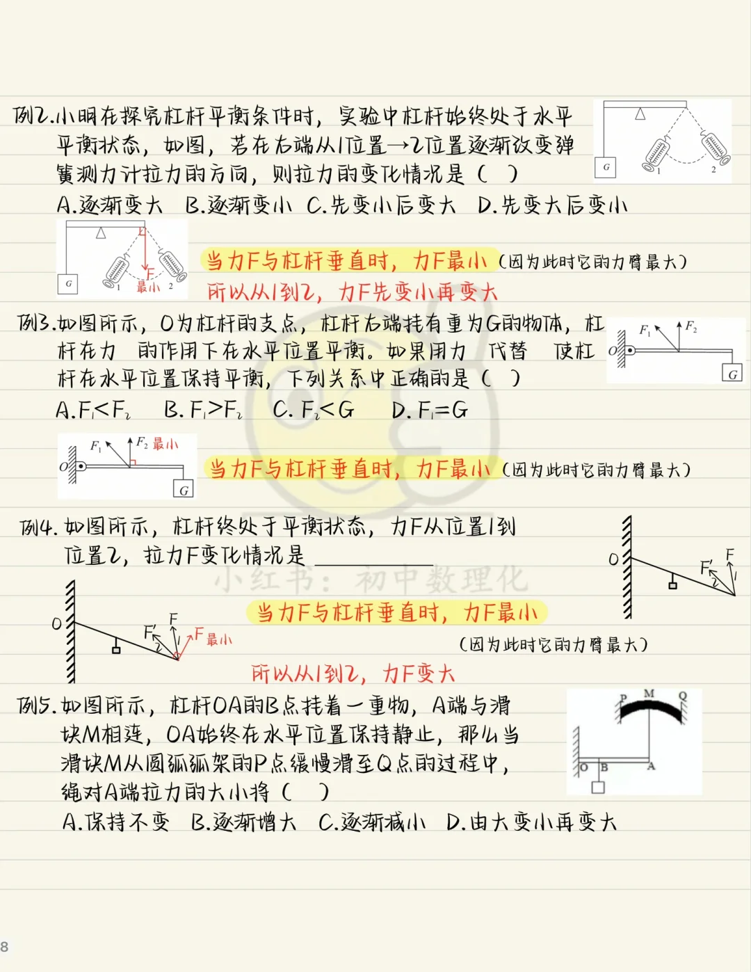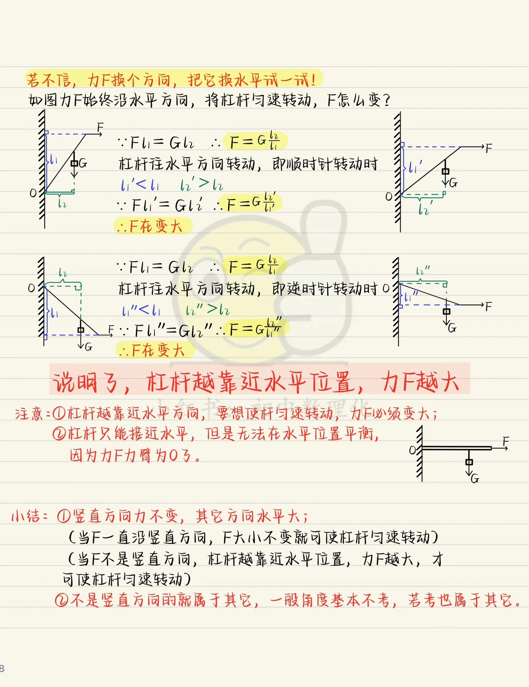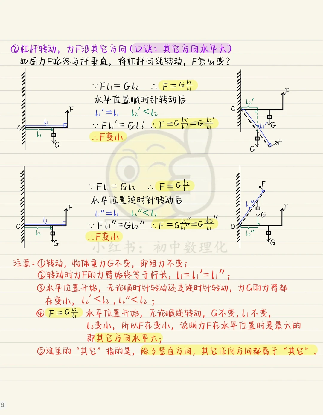 杠杆的动态平衡,总结了几句口诀,最后那个模型还是有一定难度的。第一个模型,初二同学没学三角函数,记结论就可以。马上中考的同学,尤其中考爱考杠杆的看一下这块内容