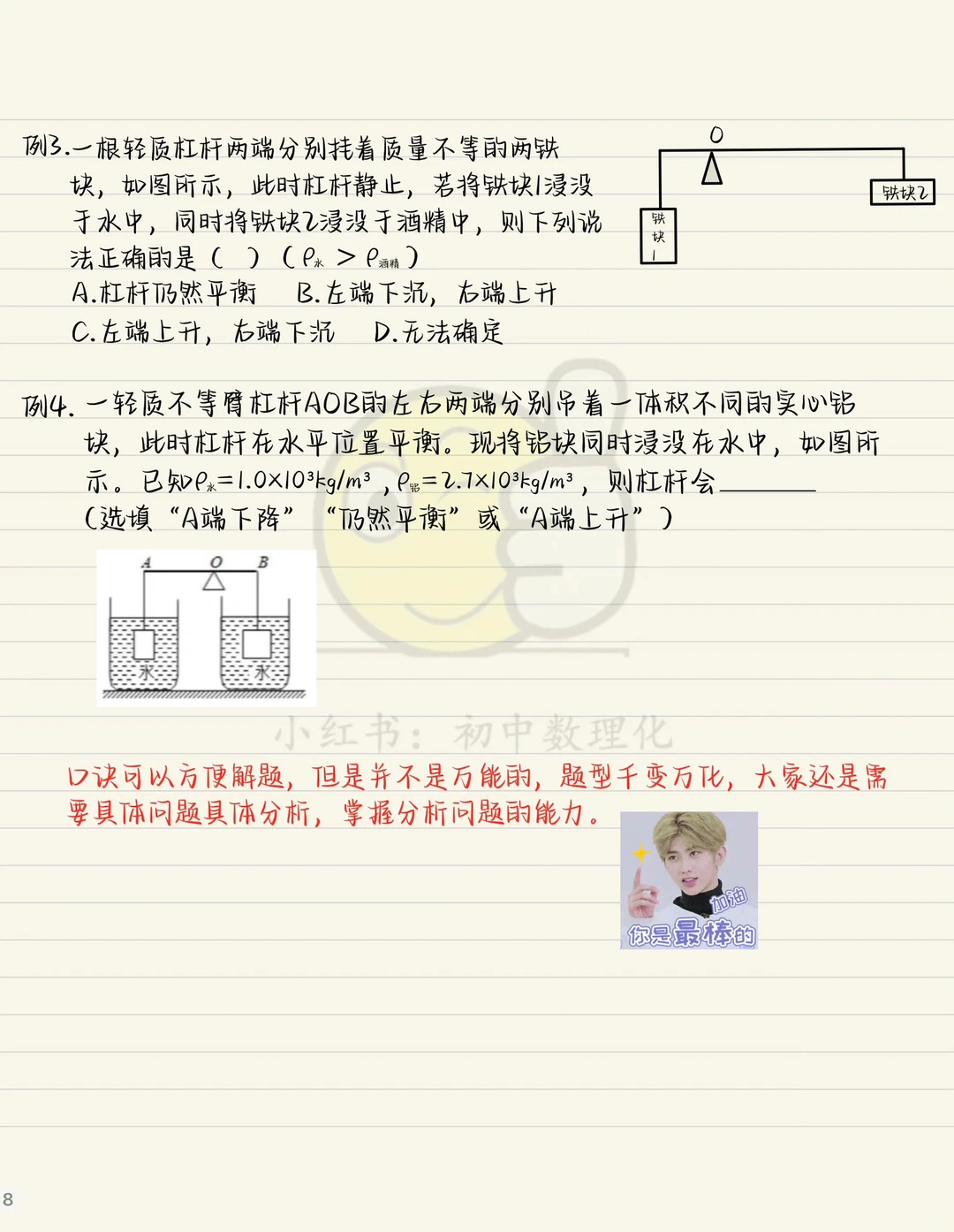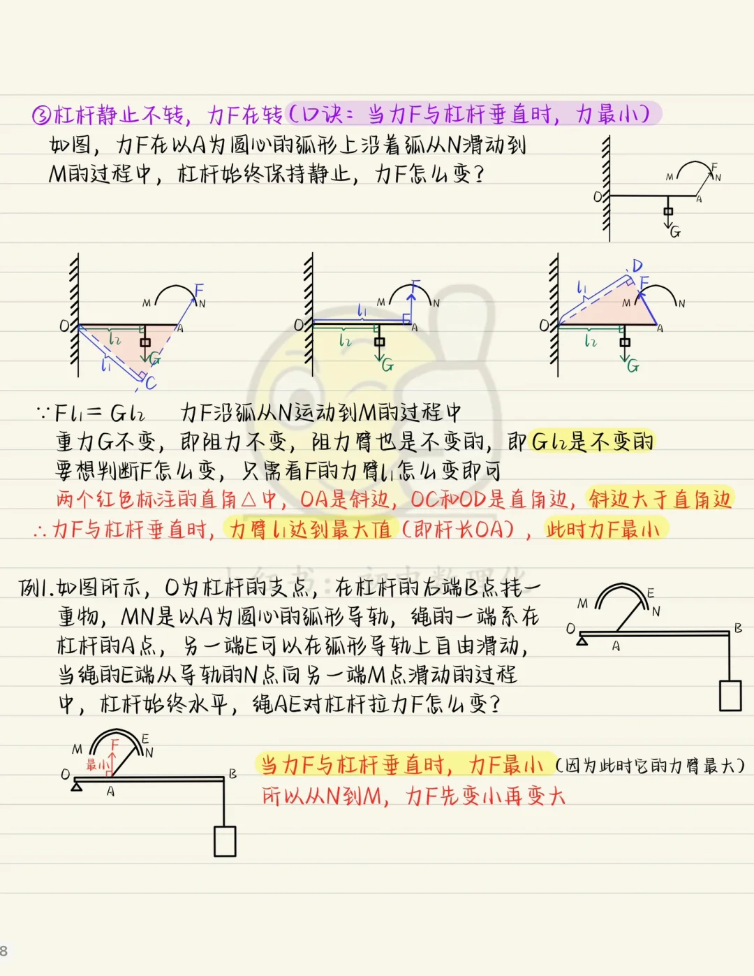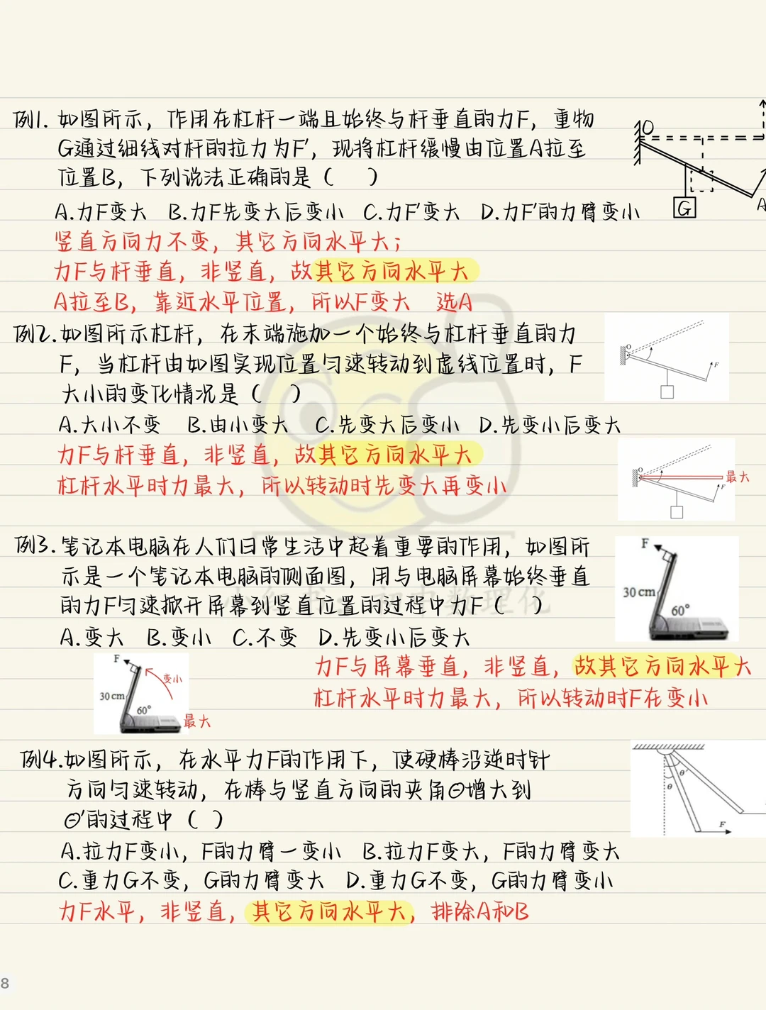 杠杆的动态平衡,总结了几句口诀,最后那个模型还是有一定难度的。第一个模型,初二同学没学三角函数,记结论就可以。马上中考的同学,尤其中考爱考杠杆的看一下这块内容