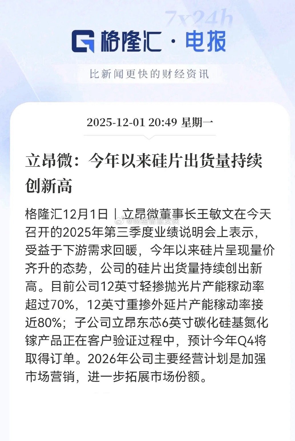 立昂微今天开了业绩会,传出的都是好消息。董事长王敏文说了,今年硅片生意特别火,下游需求旺,公司出货量一路创新高,而且价格也跟着涨,是难得的量价齐升!更亮眼的是,高端产能很忙,12英寸的两种硅片生产线,开工率都超过了70%。这说明产品很受欢迎。公司还在开拓新领域,子公司搞的碳化硅基氮化镓新产品,已经快通过客户测试了,预计年底就能拿到订单!展望明年,公司目标很明确,要继续加强销售,把市场份额做得更大。整体来看,公司正处在业务向上、积极扩张的好时候!