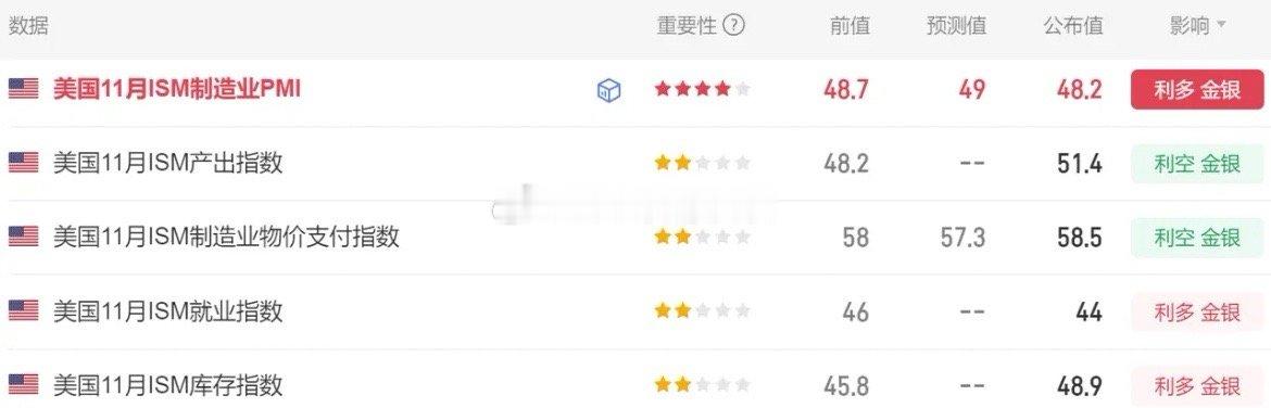 黄金现在价格怎么看?12月1日晚上美国11月ISM数据公布了。首先美国11月ISM制造业PMI公布为48.2,市场预期49,前期数值为48.7。其次美国11月ISM新订单指数 47.4,前值49.4。最后美国11月ISM制造业物价支付指数公布为58.5,市场预期为57.3,前期数值58。这几项数据有利空金价,也有利多金价的。不过数据公布以后,国际金价下滑二十多美元。
