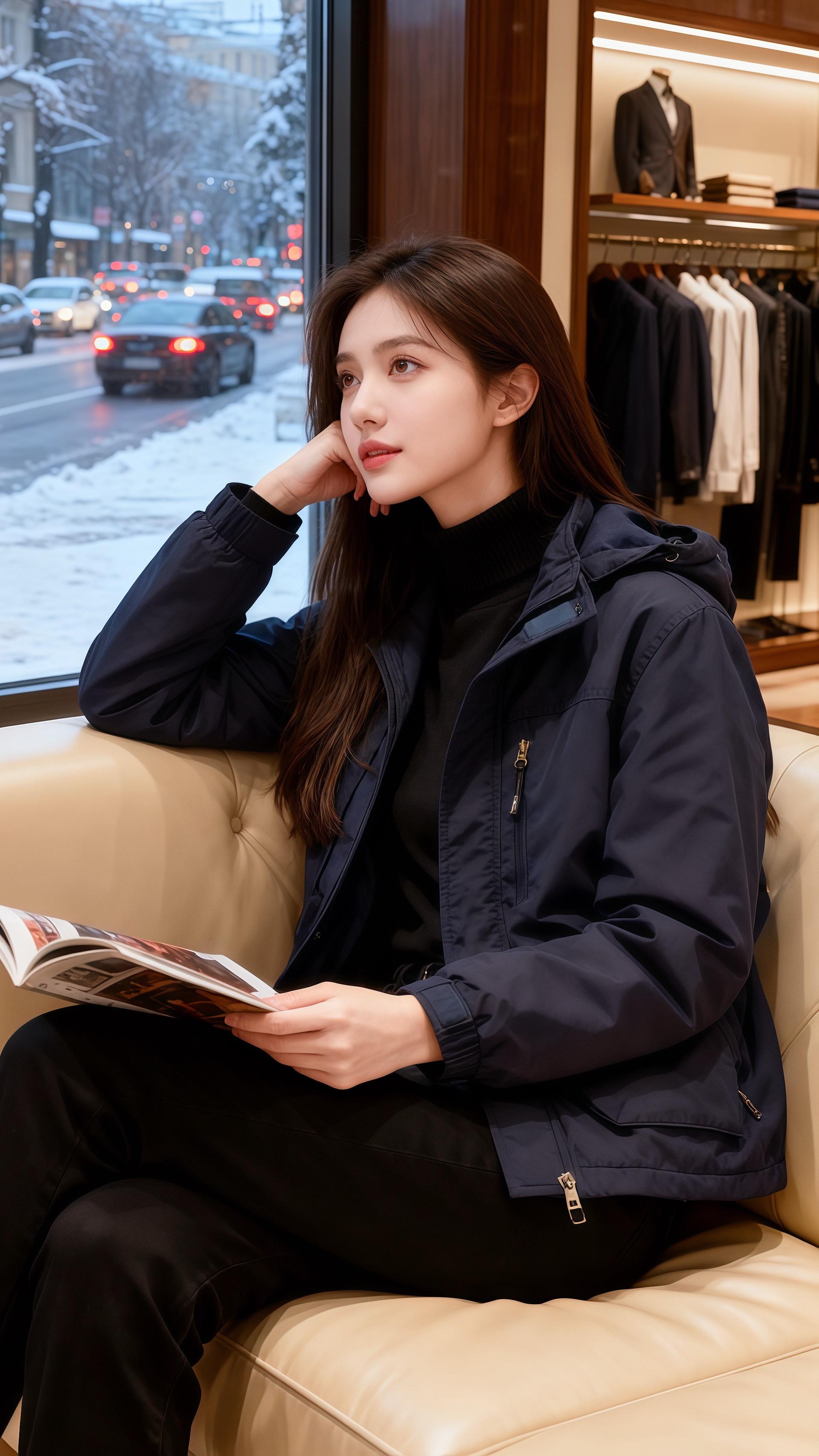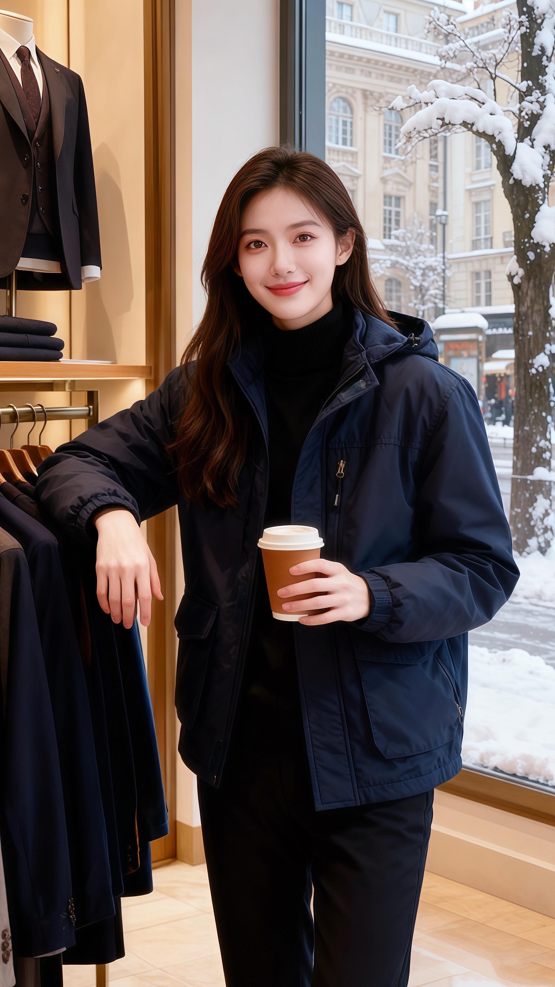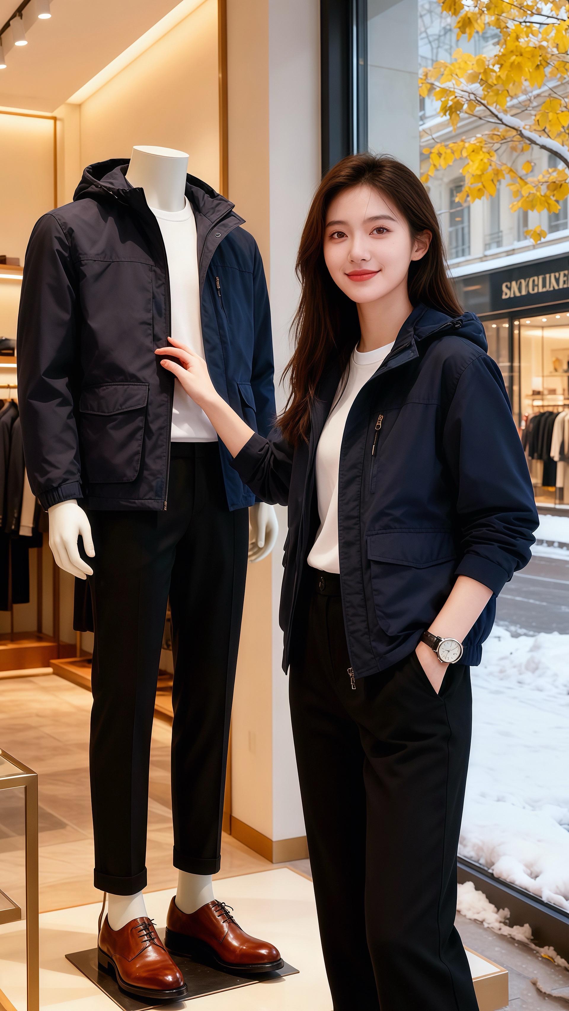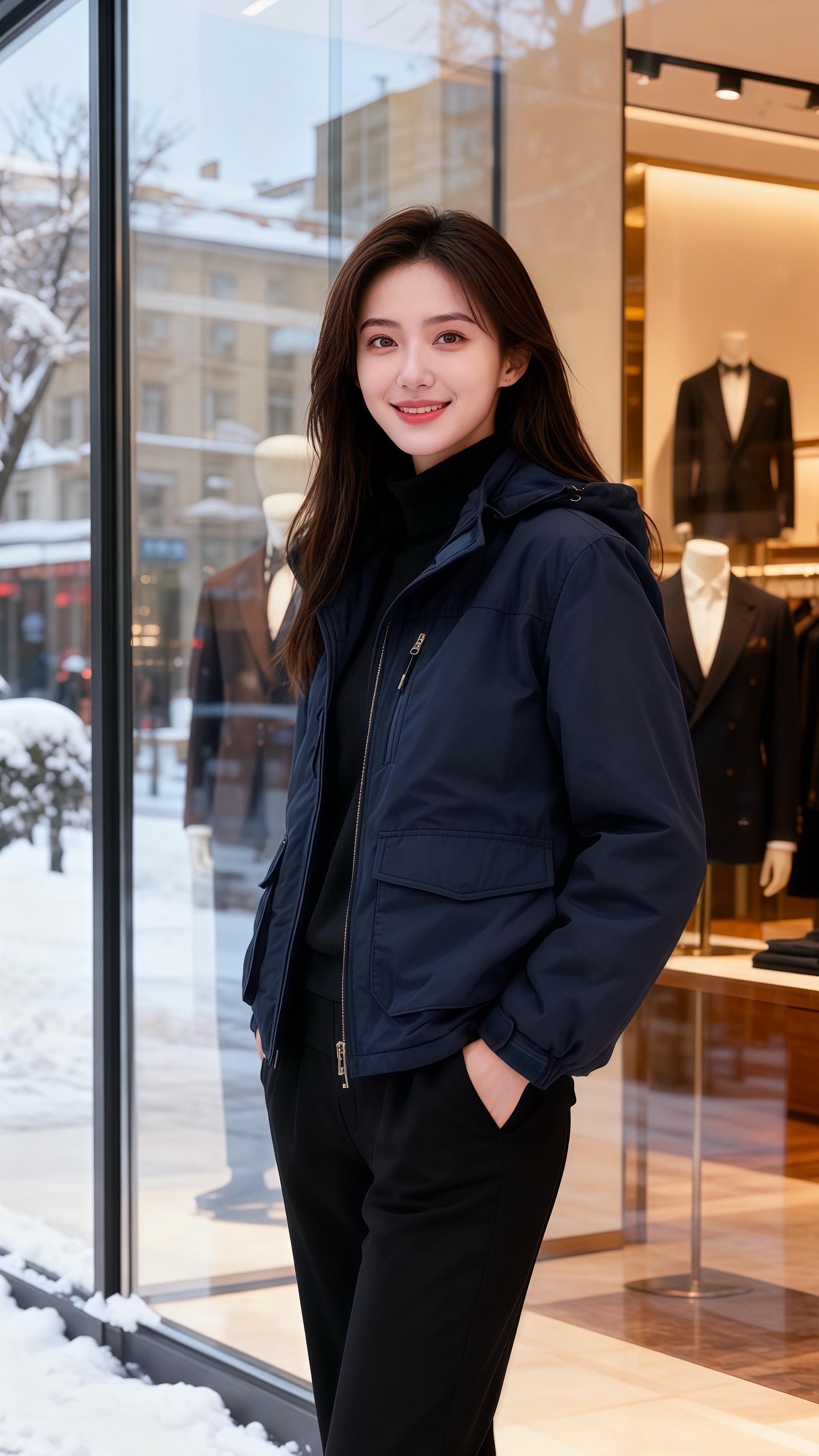 雪裹着街灯的傍晚,他来取大衣时,撞见她靠在男装店衣架旁。藏青外套的面料带着哑光的软,连帽沿轻轻贴在发梢,拉链半开露出内搭的黑高领,垂顺的黑裤裹着脚踝,是冬里难得的利落温软。