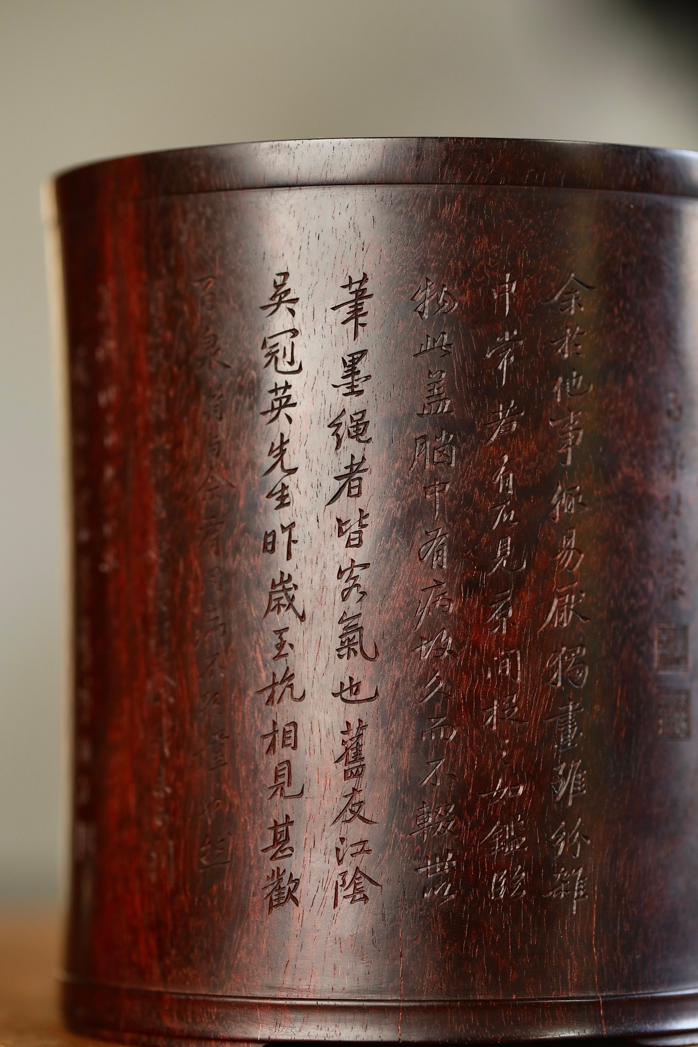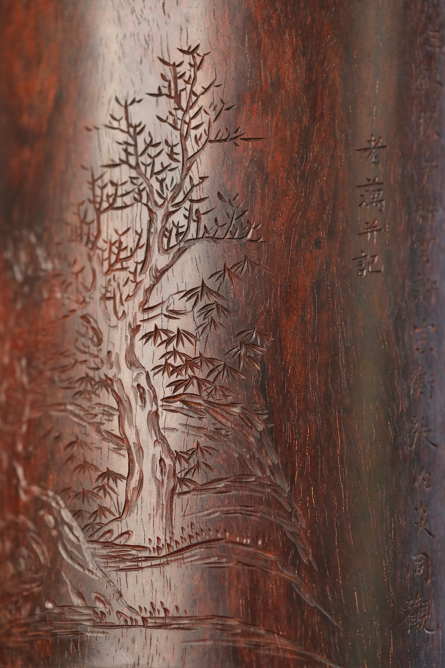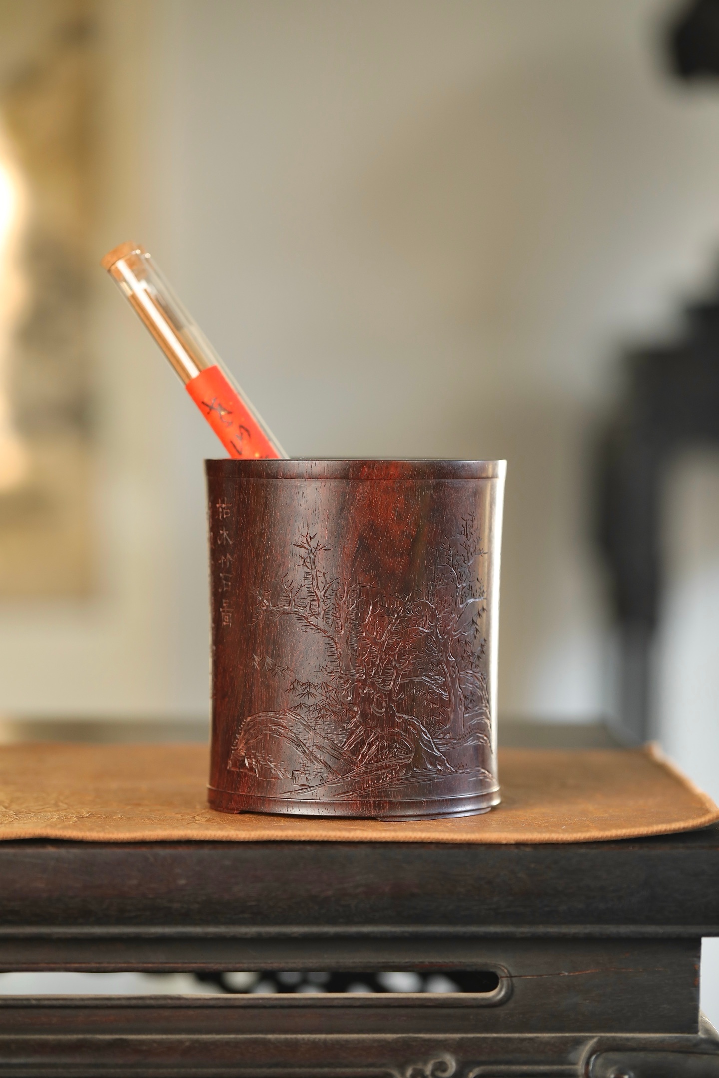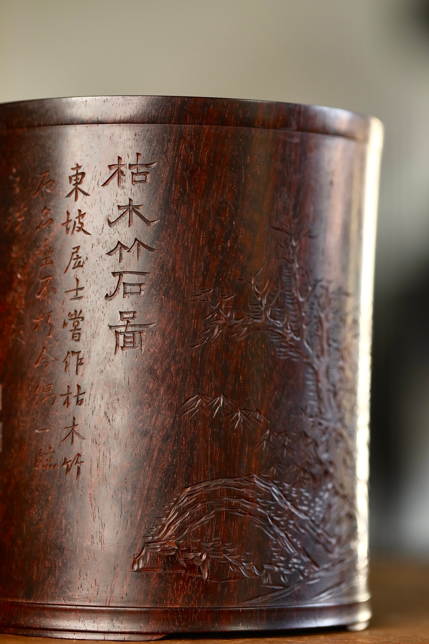 小叶紫檀 | 笔筒圆口直身,打磨精细,筒上雕刻栩栩如生,松石丛生,枝繁叶茂。书法古拙,雕刻典雅周正。作为文房雅设,颇有情趣。11.6×13.3cm