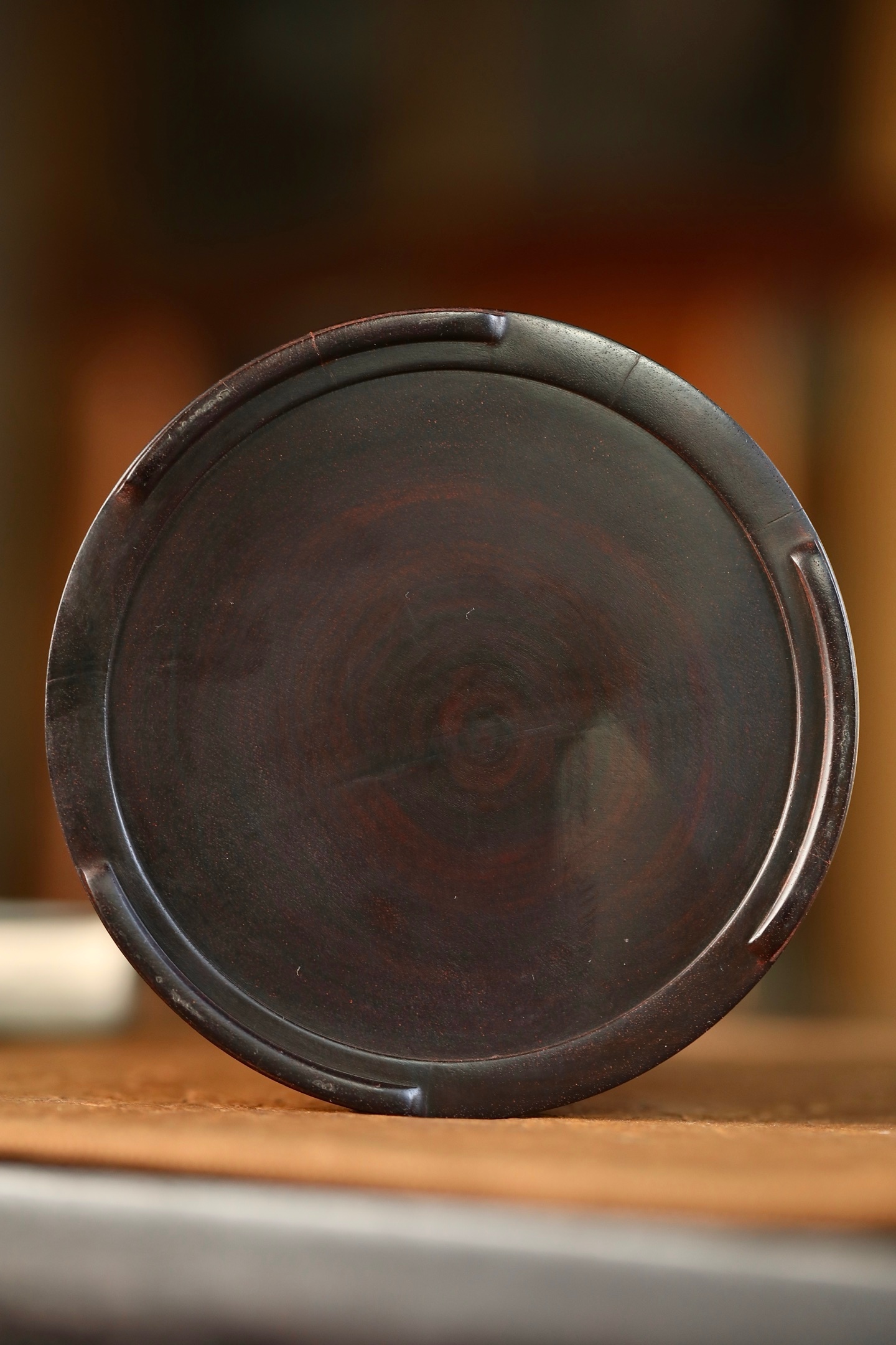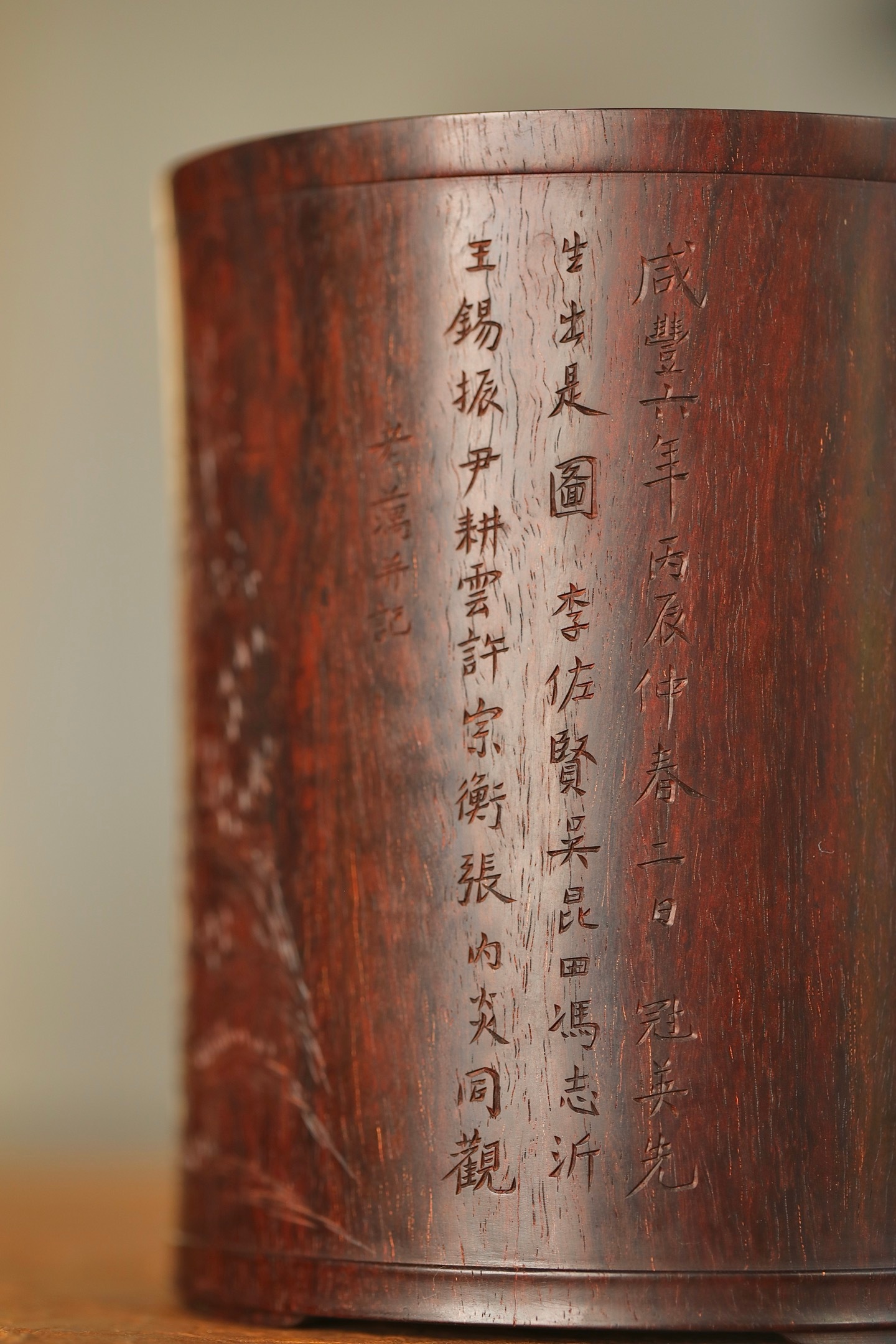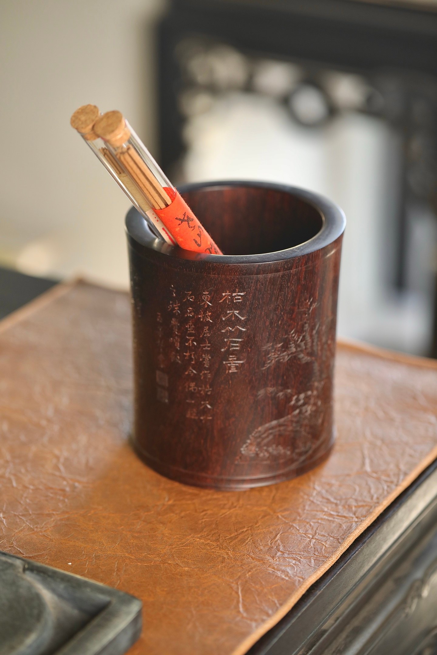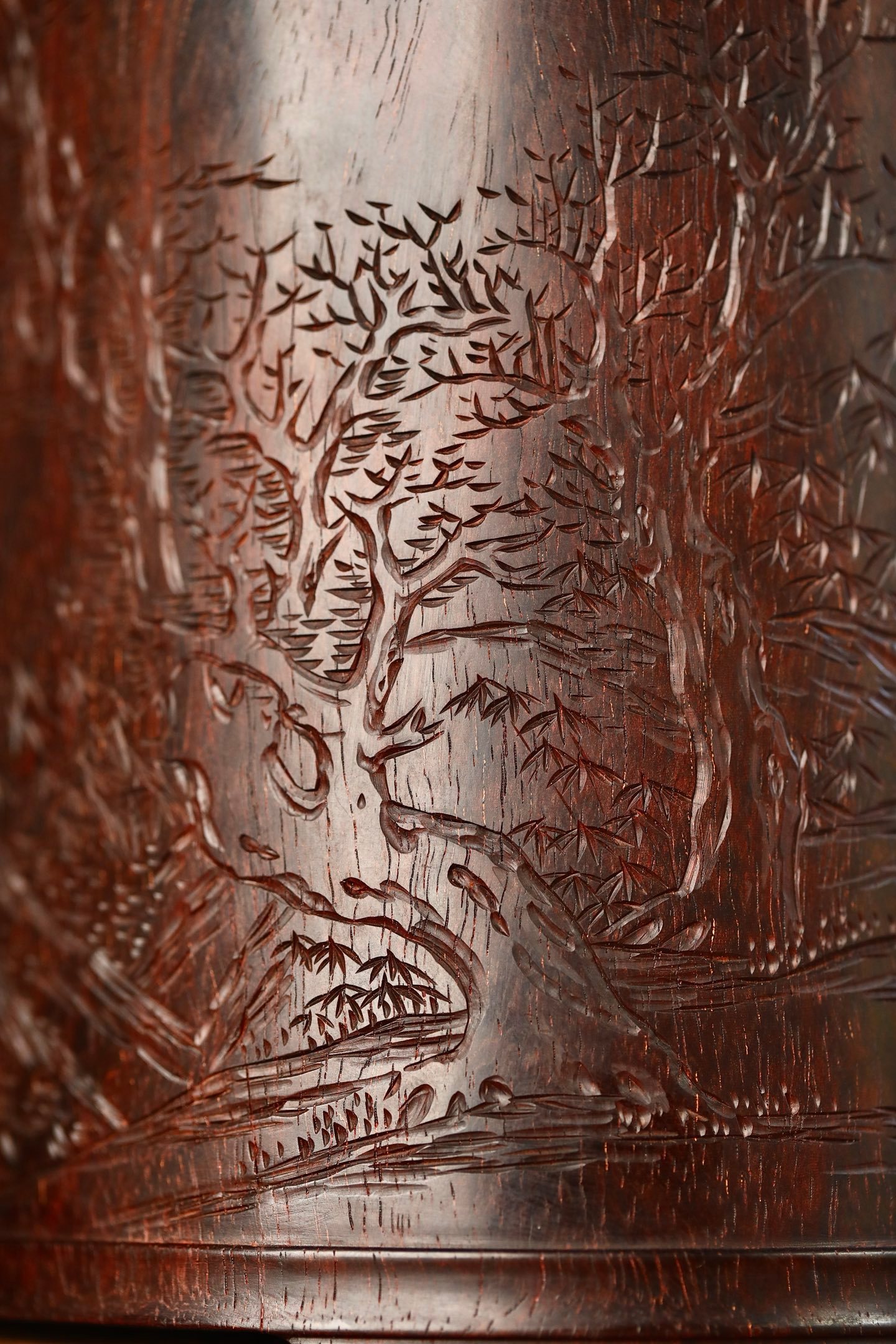 小叶紫檀 | 笔筒圆口直身,打磨精细,筒上雕刻栩栩如生,松石丛生,枝繁叶茂。书法古拙,雕刻典雅周正。作为文房雅设,颇有情趣。11.6×13.3cm