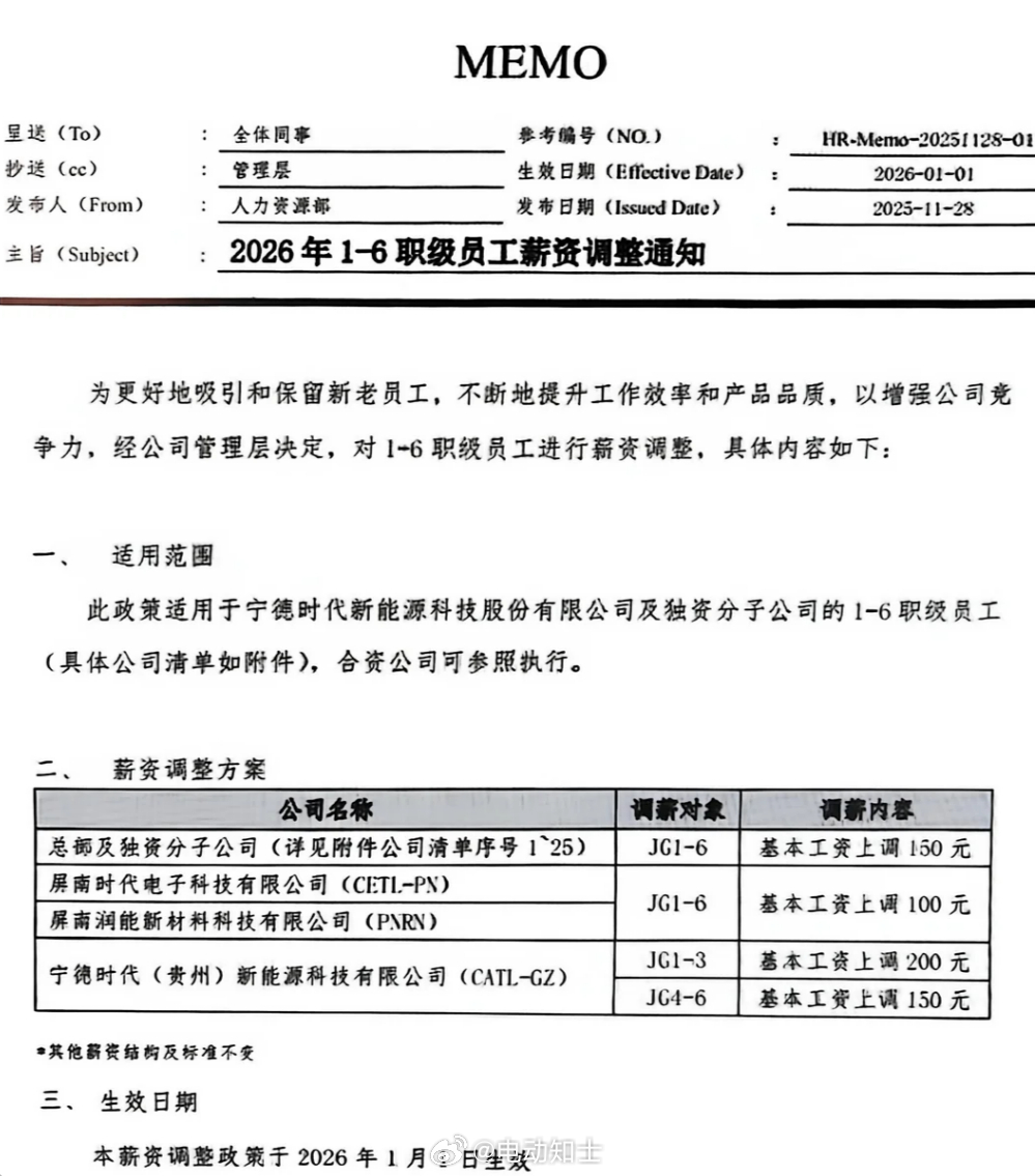 宁德时代发布涨薪通知:JG1-6基本工资上调150元,其他薪资结构...