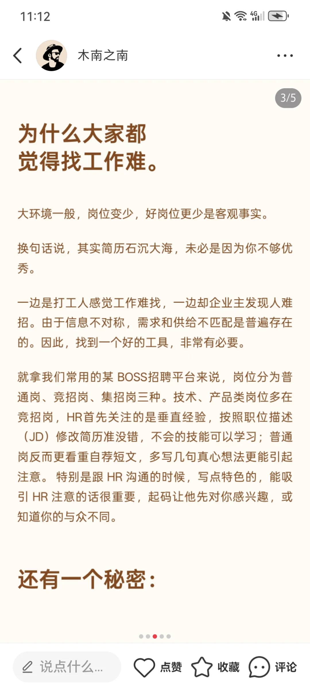 就拿我们常用的某 BOSS招聘平台来说,岗位分为普通岗、竞招岗、集招岗三种。技术、产品类岗位多在竞招岗,HR首先关注的是垂直经验,按照职位描述(JD)修改简历准没错,不会的技能可以学习;普通岗反而更看重自荐短文,多写几句真心想法更能引起注意。 特别是跟 HR 沟通的时候,写点特色的,能吸引 HR 注意的话很重要,起码让他先对你感兴趣,或知道你的与众不同。