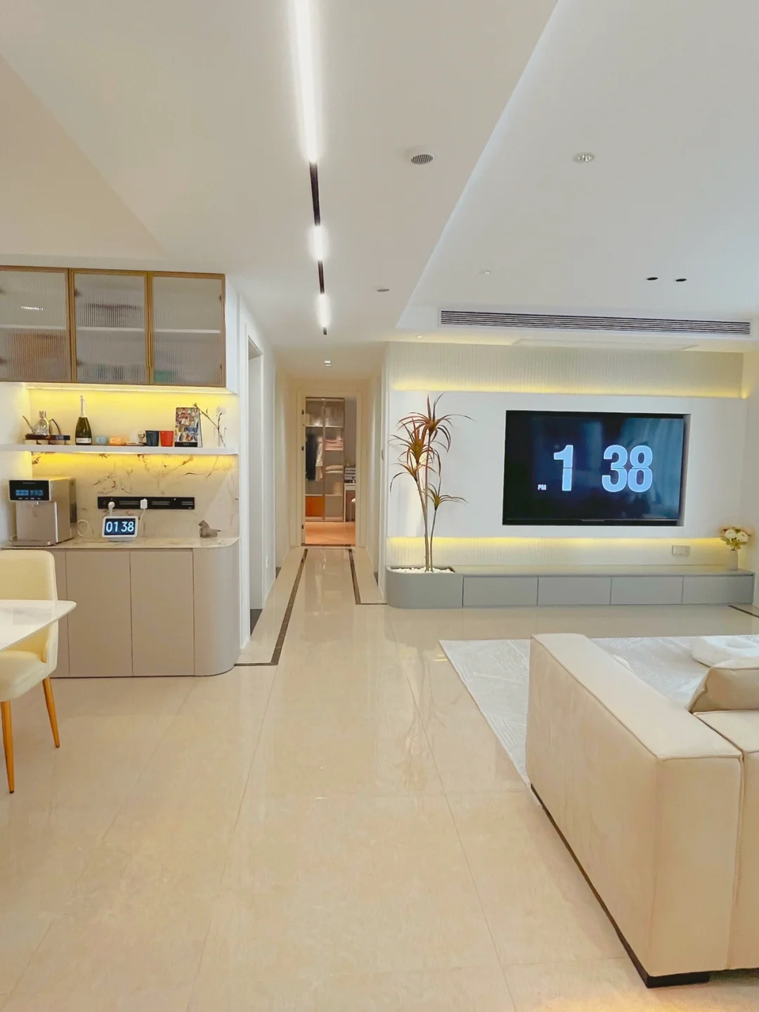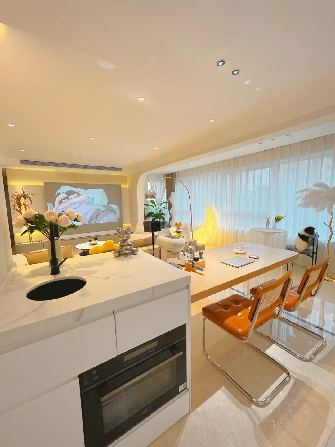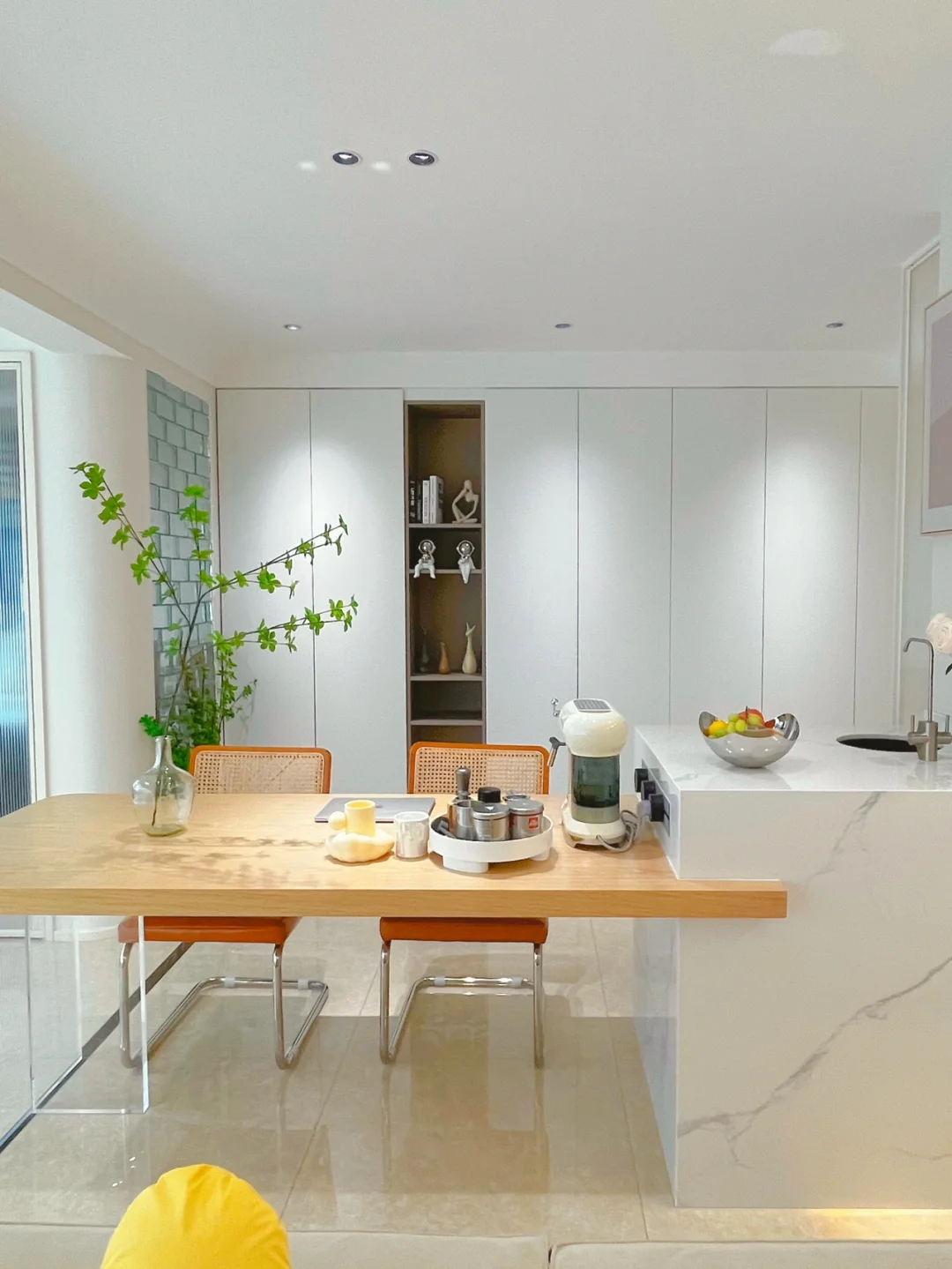 我家本来是四室,装了两套房,给我的经验就是千万别做客房啦!最后一般都会变成杂物间🤭 这套房一开始装修的时候就决定砸掉一个房间,直接把客厅变成大横厅,家里也显得更大、更通透,做了一个大岛台,平时烘焙、看书真香!