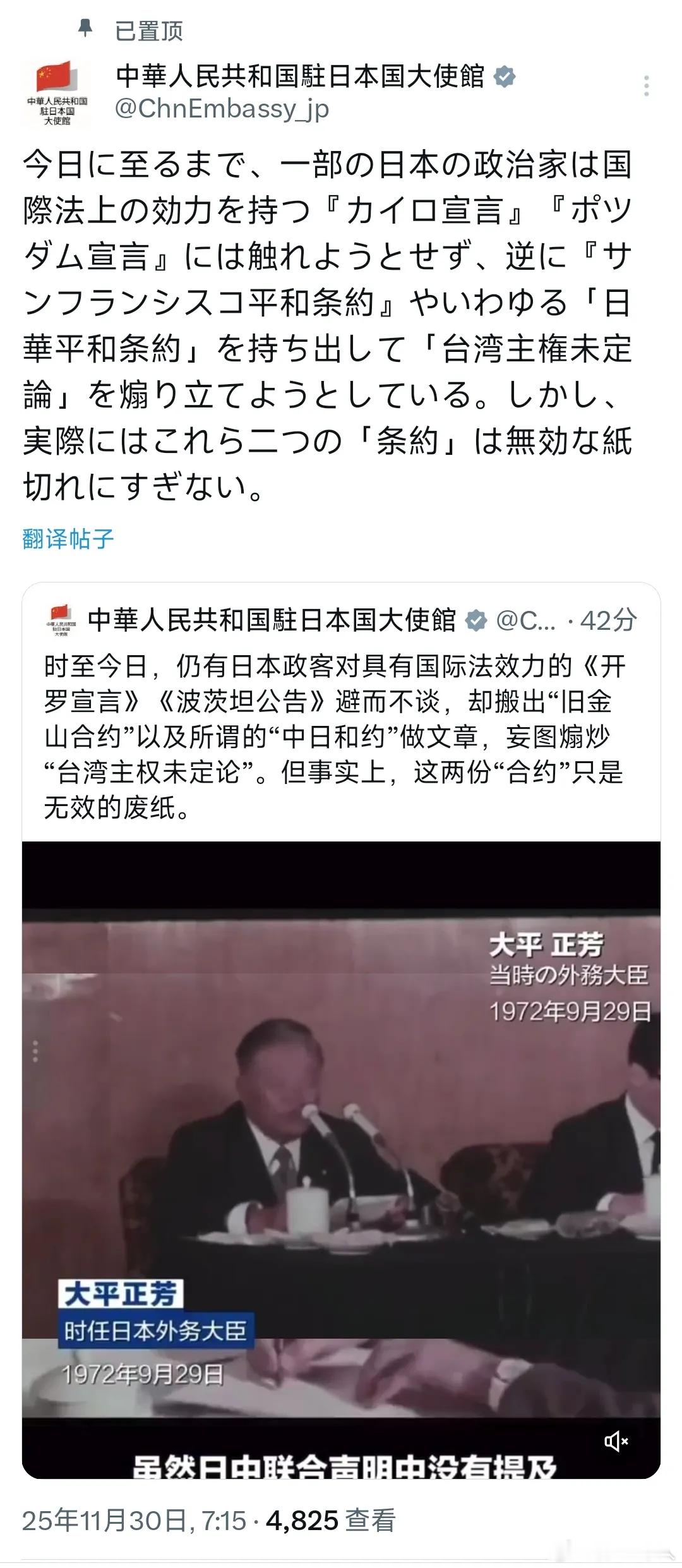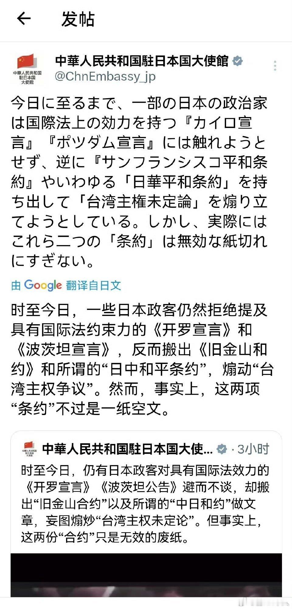 中国驻日本大使馆继续上强队:时至今日,一些日本政客仍然拒绝提及具有国际法约束力的《开罗宣言》和《波茨坦宣言》,反而搬出《旧金山和约》和所谓的"日中和平条约(国民党伪政权签署)",煽动"台湾主权争议"。然而,事实上,这项"条约"不过是一纸空文。也就是说,我们官方完全不承认这两个条约的效率。反过来说,琉球群岛地位是未定的,我们需要加强进攻这个问题。