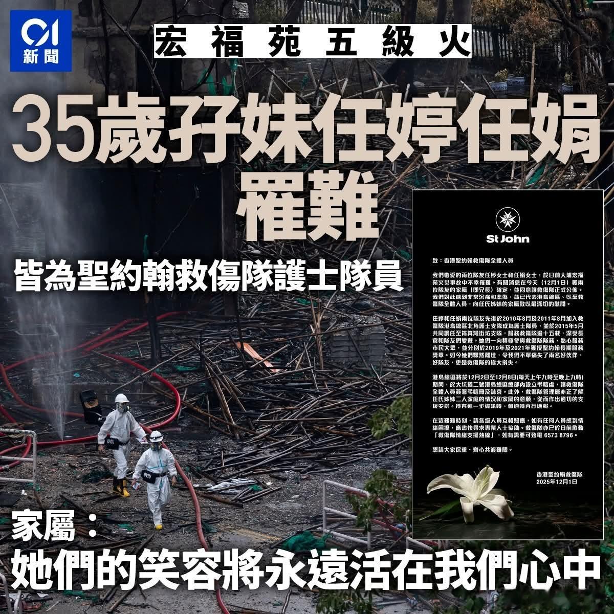 双胞胎姐妹遇难,曾逃出火海又返回救猫东网报道,大火后有人在网上发贴寻人,并附一对名为任婷及任娟的35岁双胞胎姐妹的生活照,指两女最后位置或在宏泰楼天台。至今日(12月1日),香港圣约翰救伤队发信证实,任婷及任娟在火灾中不幸罹难,并获她们的兄长确定消息。据了解,姐妹遇难在事发当日到朋友宏福苑家中打麻将,期间遇火警后与两名友人共4人一同逃至天台位置,但姐妹为救猫而折返屋内,最终有去无回。据悉,两女的遗体已确认及没有被火烧。香港大火起火时没有警报香港大火69岁男子帮工友撤离后遇难